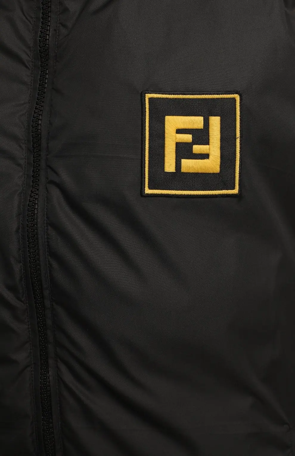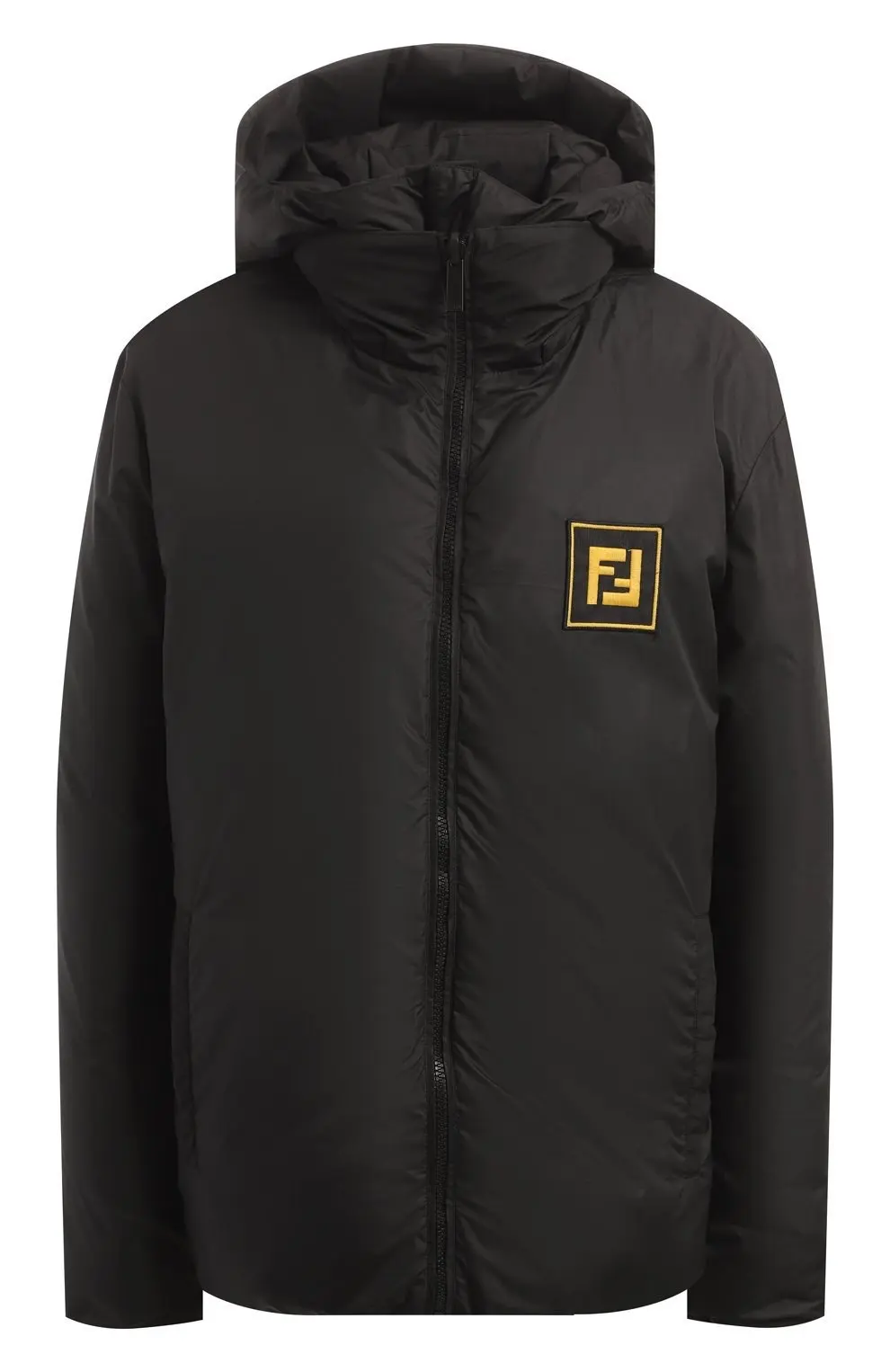 Двусторонний пуховик Fendi выполнен из легкого материала на основе полиамида с добавлением эластана. Модель с прямым кроем и объемным капюшоном утеплена смесью пуха и пера. Акцентом служит контрастный фирменный шеврон на груди. Куртка застёгивается на молнию и дополнена боковыми карманами.