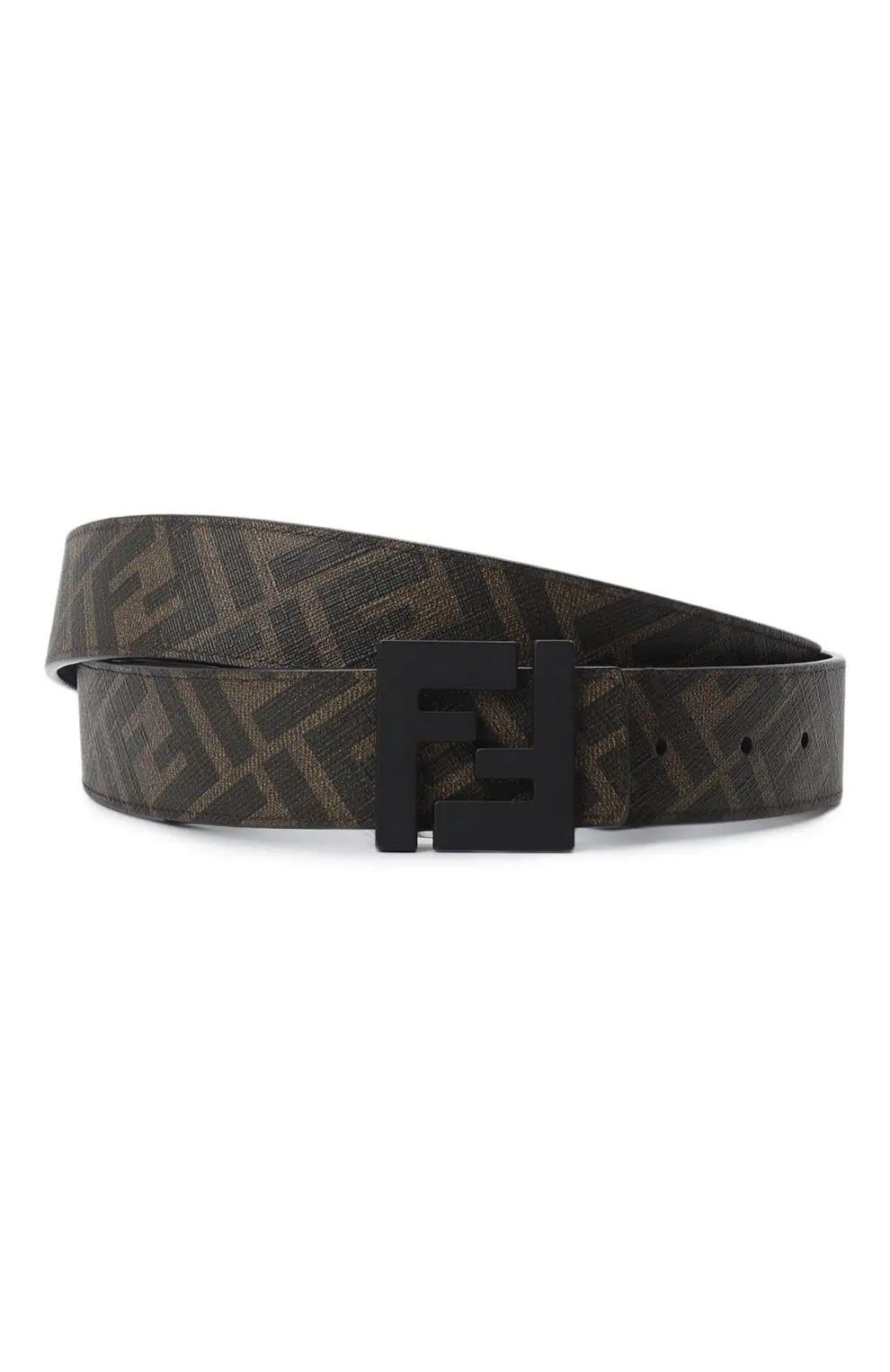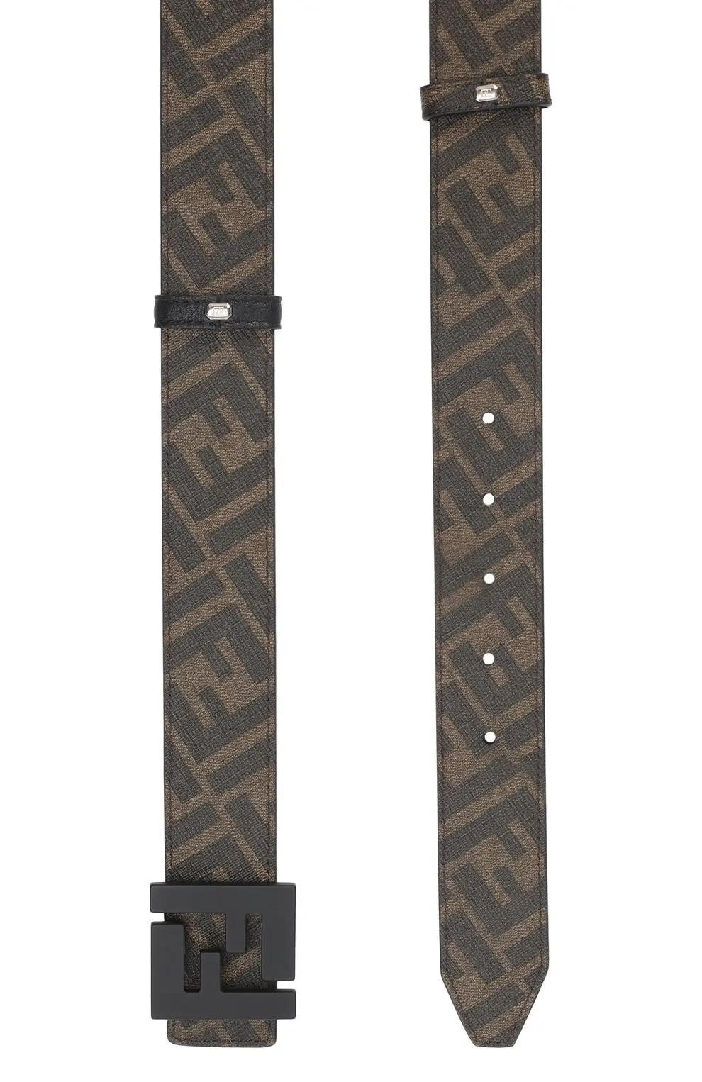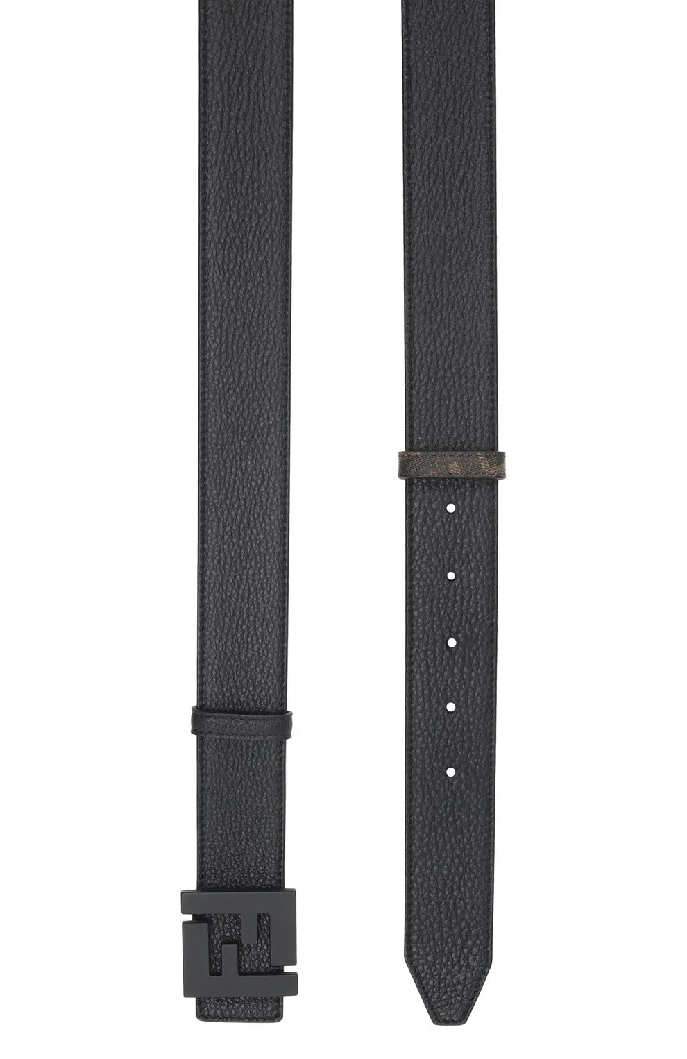 Этот двусторонний ремень от Fendi сочетает практичность и стиль в одном аксессуаре. С одной стороны он выполнен из гладкой кожи с фирменным принтом FF в коричневых тонах, а с другой — из черной зерненой кожи, что позволяет легко менять настроение образа. Массивная матовая пряжка с узнаваемым логотипом подчеркивает современный характер модели. Такой ремень станет универсальной деталью гардероба, подходящей и для повседневных, и для более строгих сочетаний.