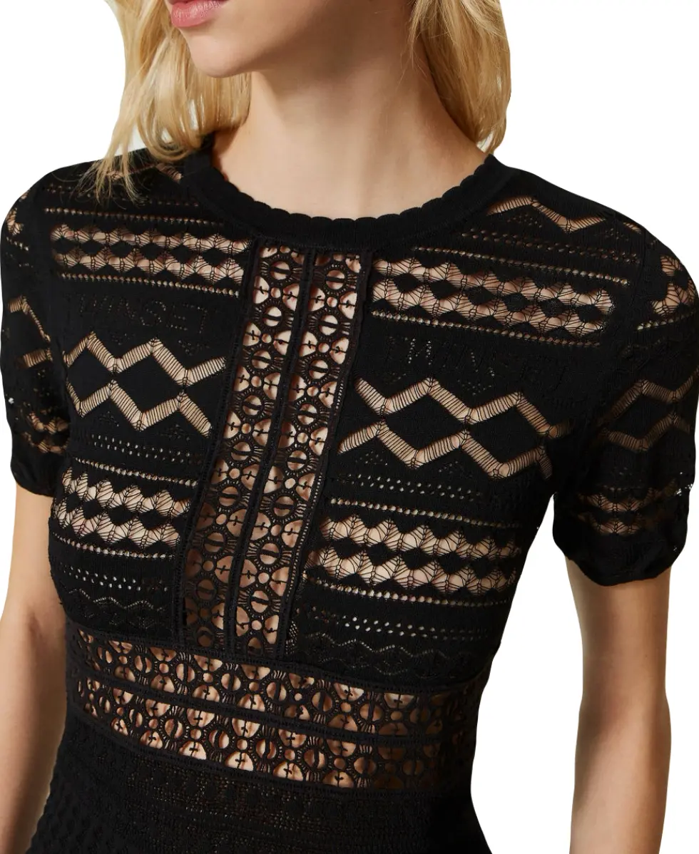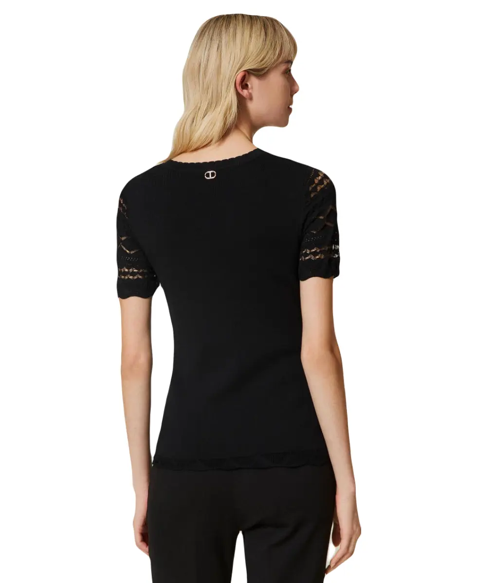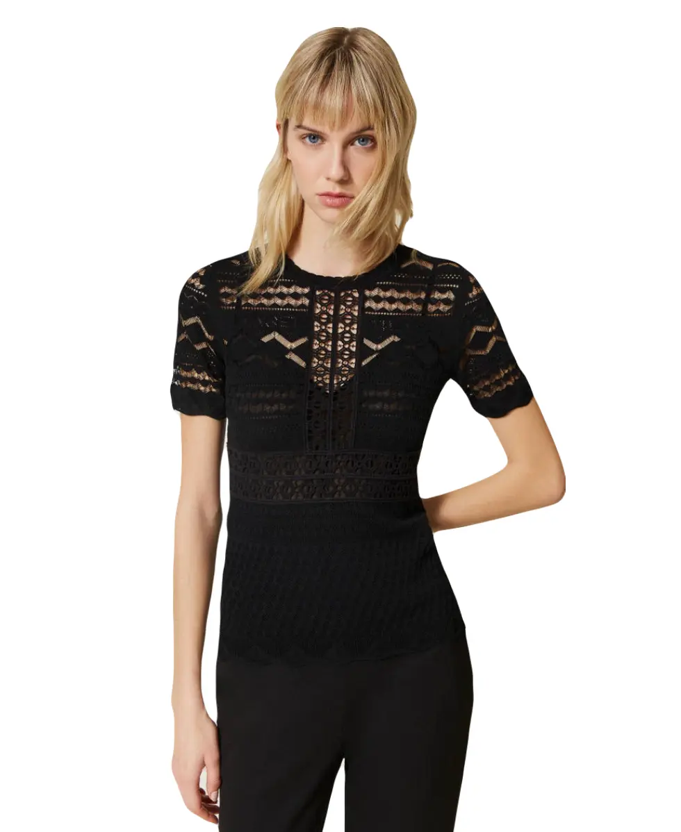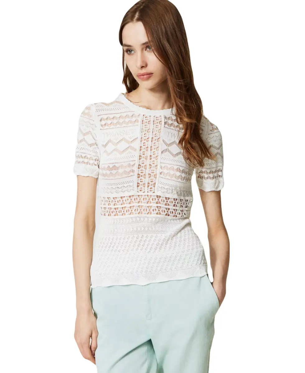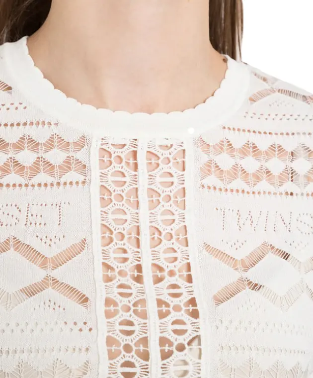 Утонченный джемпер TWINSET из эластичного вискозного кружева. Модель имеет прозрачные вставки из хлопкового кружева. Изделие приталенного кроя с круглым вырезом и короткими рукавами. Идеально сочетается с брюками или джинсами.
