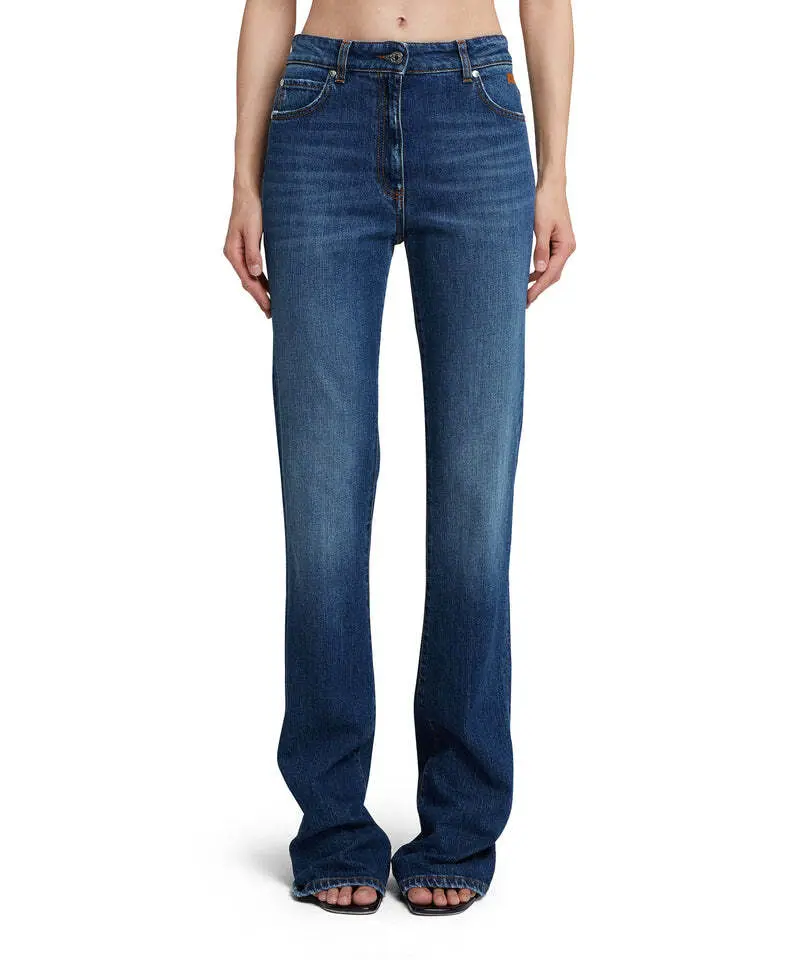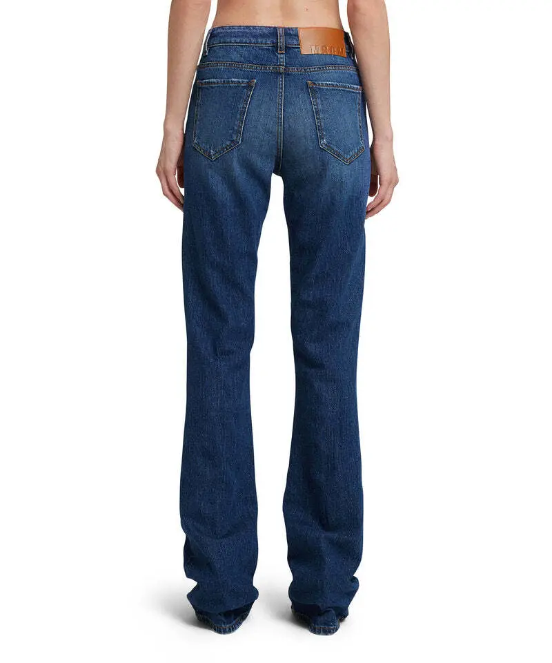 Прямые джинсы MSGM синего цвета сделаны из эластичного денима с эффектом поношенности. У брюк средняя талия, есть шлевки для ремня, застежка на пуговицу и потайная молния. Сочетайте с укороченными топами MSGM из коллекции.
