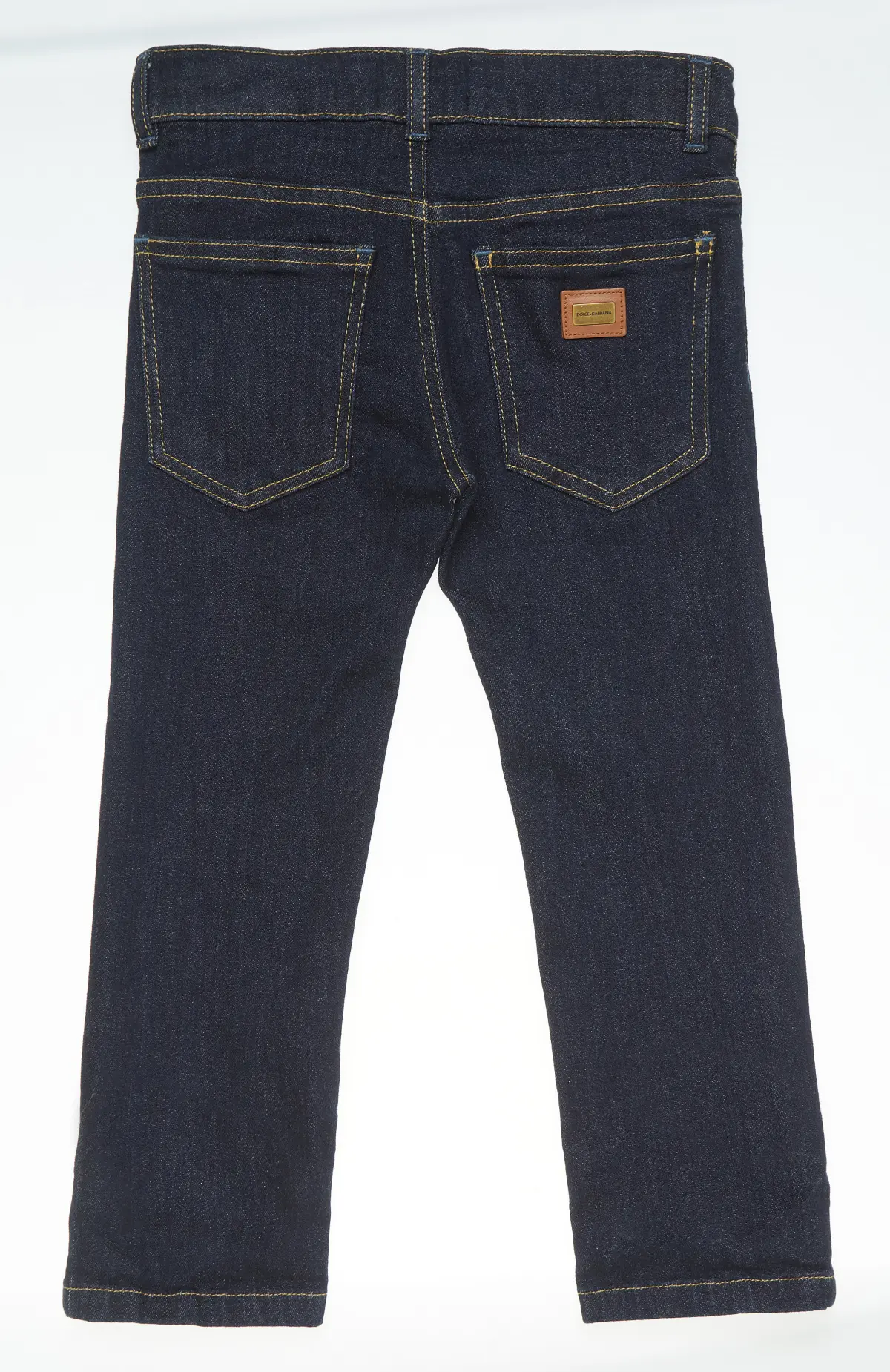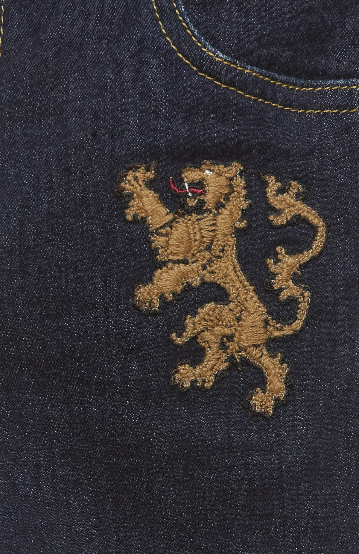Джинсы выполнены из плотного тёмно-синего денима с аккуратной контрастной прострочкой, подчёркивающей чёткие линии кроя. Декоративная вышивка с геральдическими мотивами на передней части придаёт модели выразительный характер и узнаваемый акцент. Классическая посадка и прямой силуэт обеспечивают комфорт в носке, сохраняя элегантный внешний вид, который гармонично сочетается как с повседневными, так и с более нарядными образами.