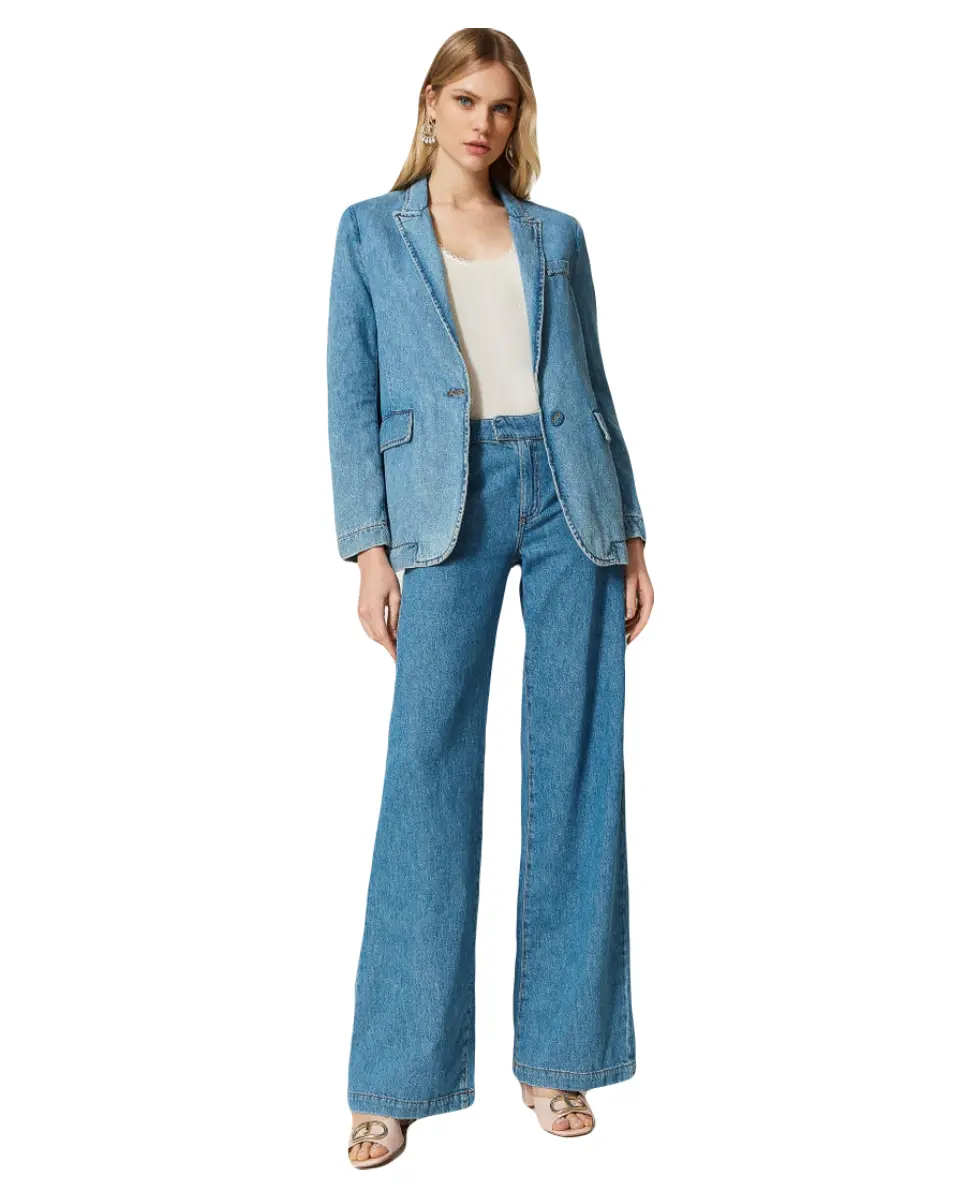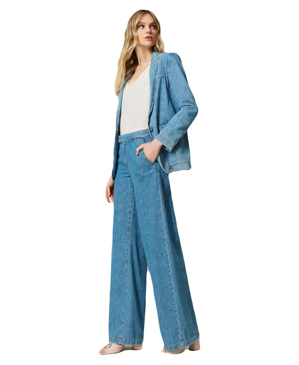 Широкие хлопковые джинсы TWINSET структурированного вида. Модель имеет стандартную талию, застежку на молнию и карманы с аппликациями сзади. Изделие прошло обработку Stone Wash для улучшения кроя и швов. Добавьте подходящий джинсовый блейзер TWINSET для создания идеального костюма.