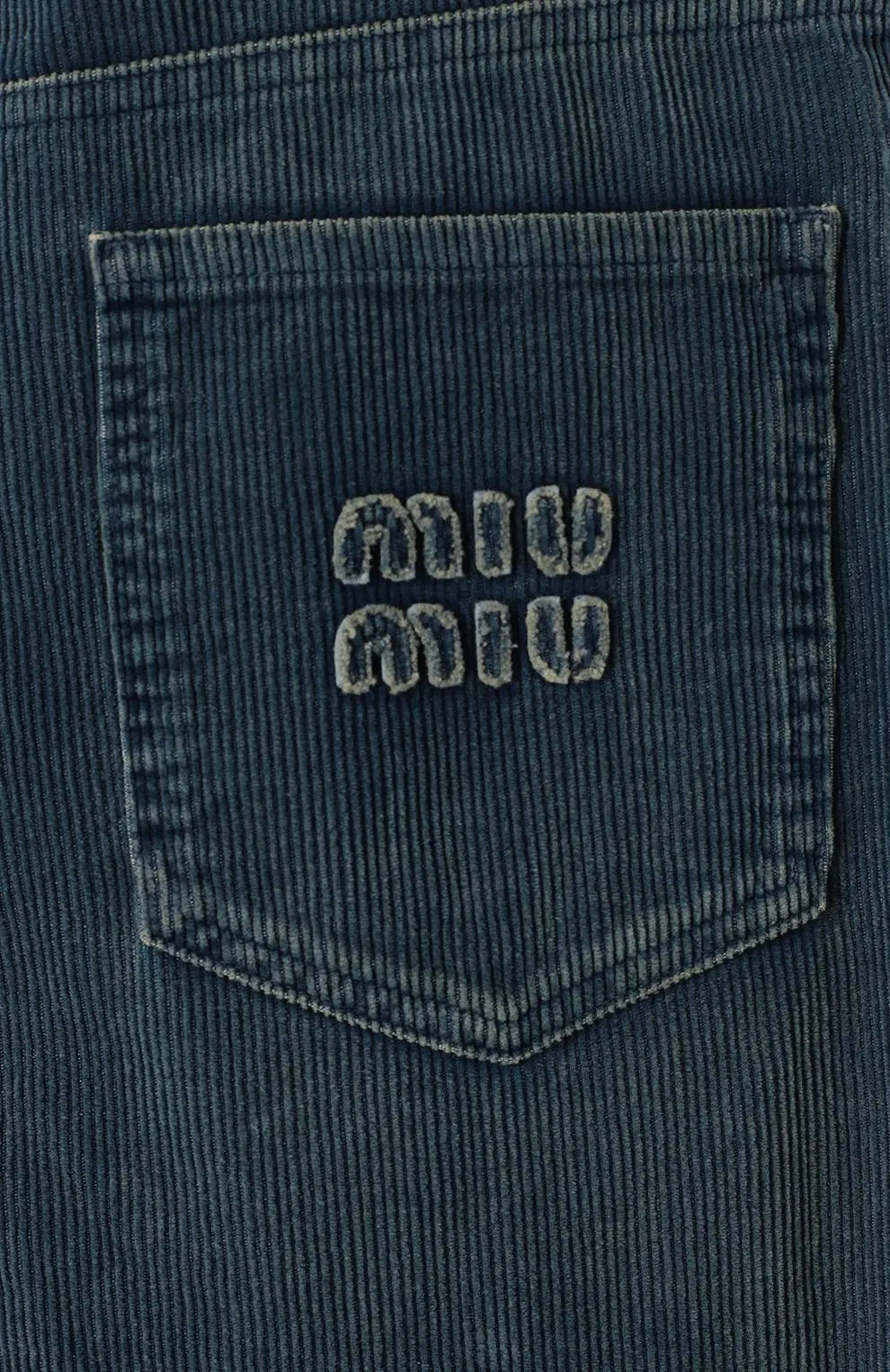 Джинсы Miu Miu из вельвета глубокого синего цвета. Модель выполнена в прямом свободном крое с классической посадкой на талии, имеет стандартные пять карманов и застёжку на молнию с пуговицей. Эффект лёгкого винтажного выцветания подчёркивает характер бренда и делает джинсы универсальными для повседневных образов.
