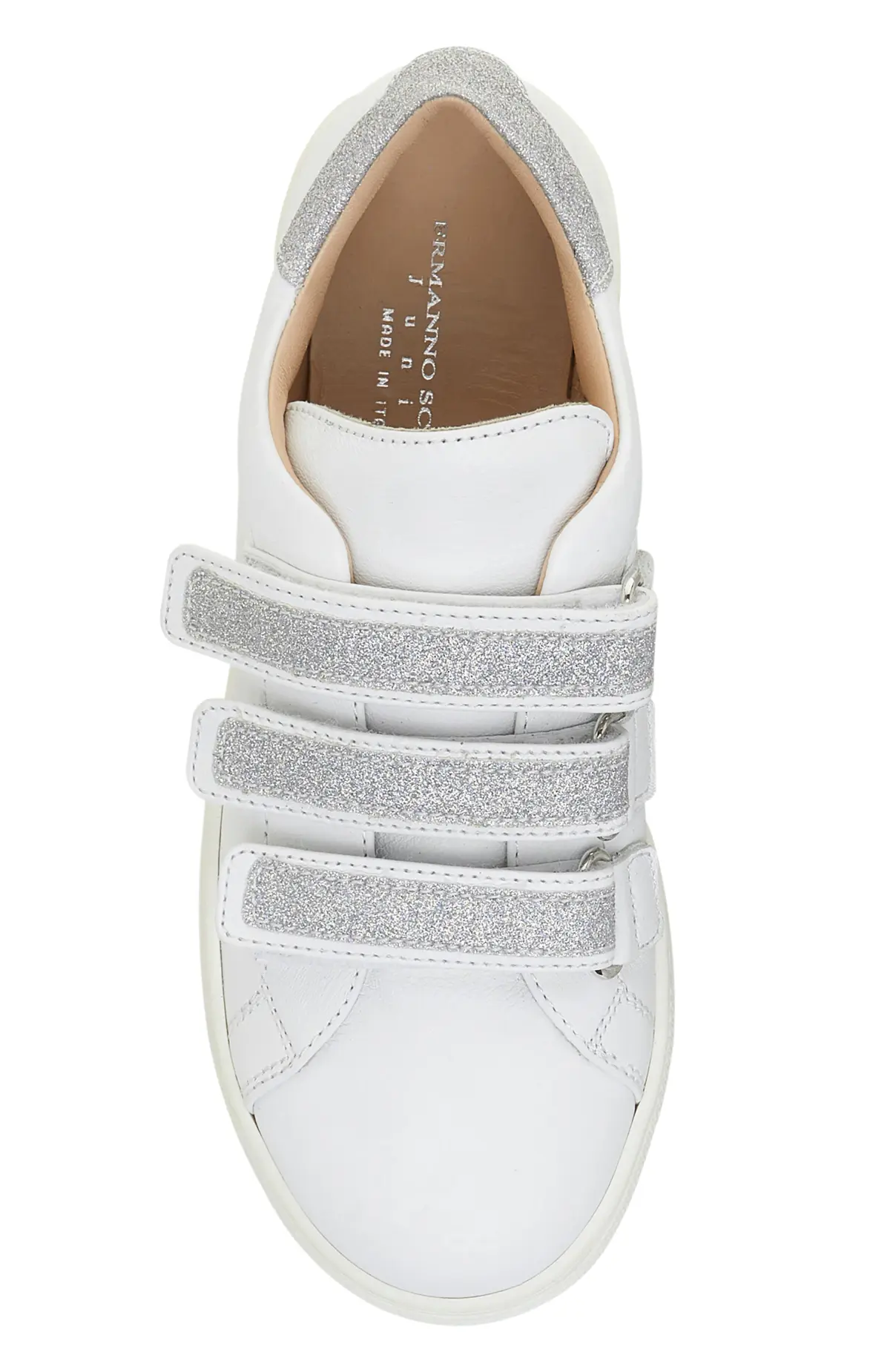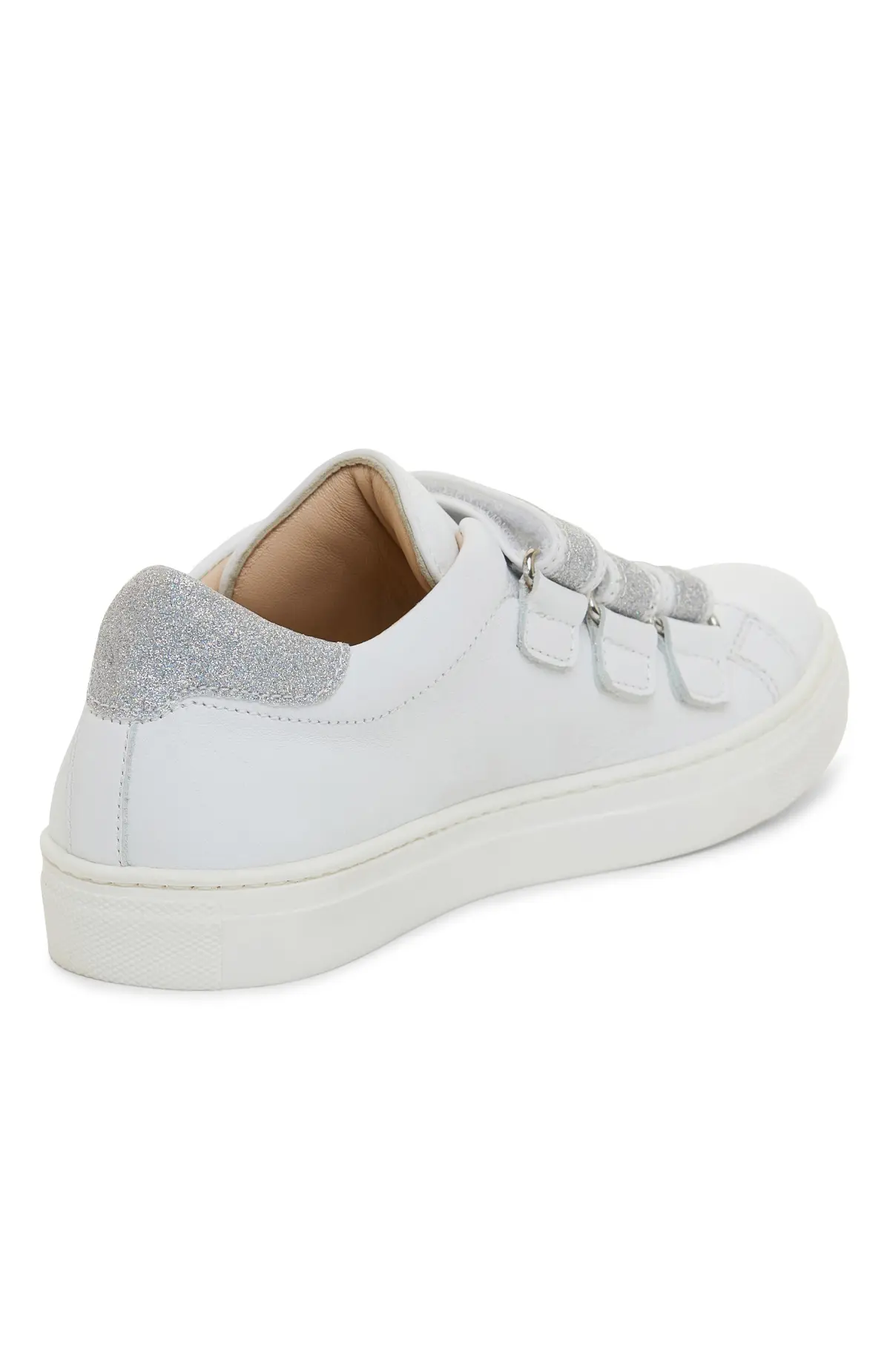 Кеды выполнены из гладкой белой кожи и дополнены ремешками на велкро с мерцающей отделкой. Чистые линии, круглый мыс и аккуратная cupsole-подошва создают лаконичный силуэт. Мягкая кожаная подкладка обеспечивает комфортное прилегание, застёжки позволяют быстро регулировать посадку.