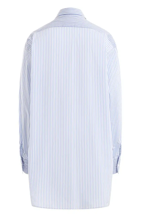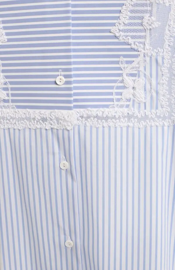 Хлопковое платье Ermanno Scervino выполнено в голубо-белую полоску с добавлением романтичного акцента в виде ажурного кружева на груди и плечах. Модель отличается свободным кроем в стиле oversize и напоминает классическую рубашку на пуговицах, что создаёт гармоничное сочетание строгой геометрии и утончённой женственности.