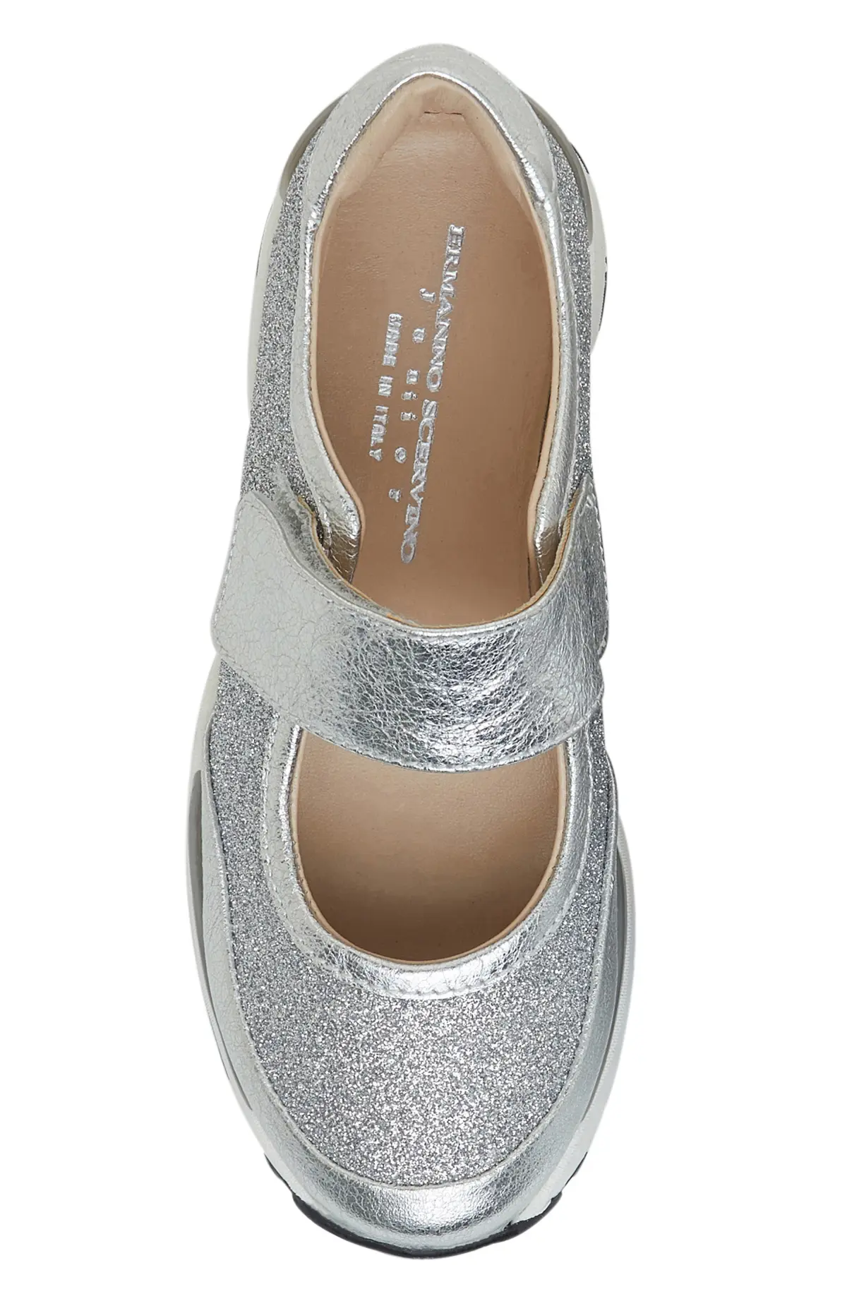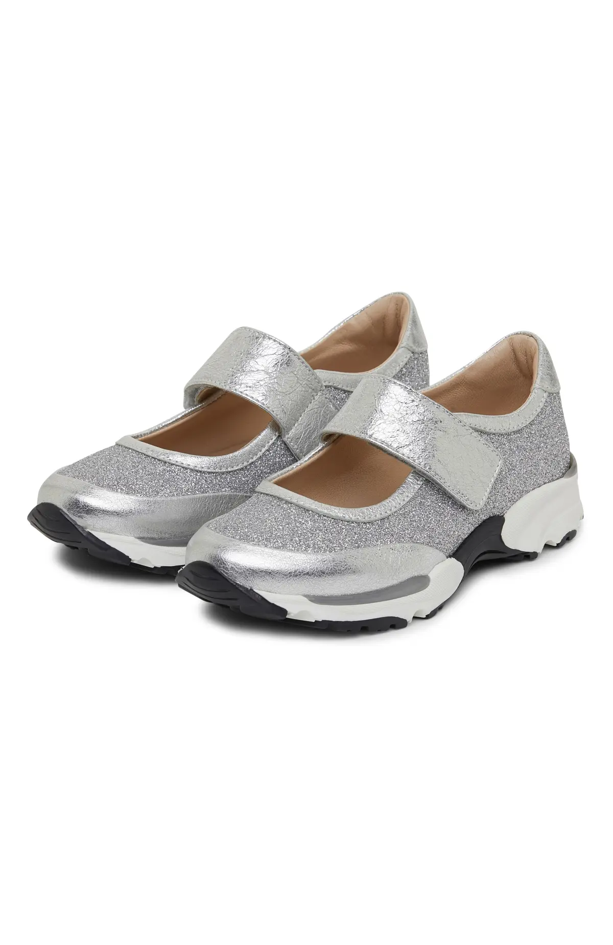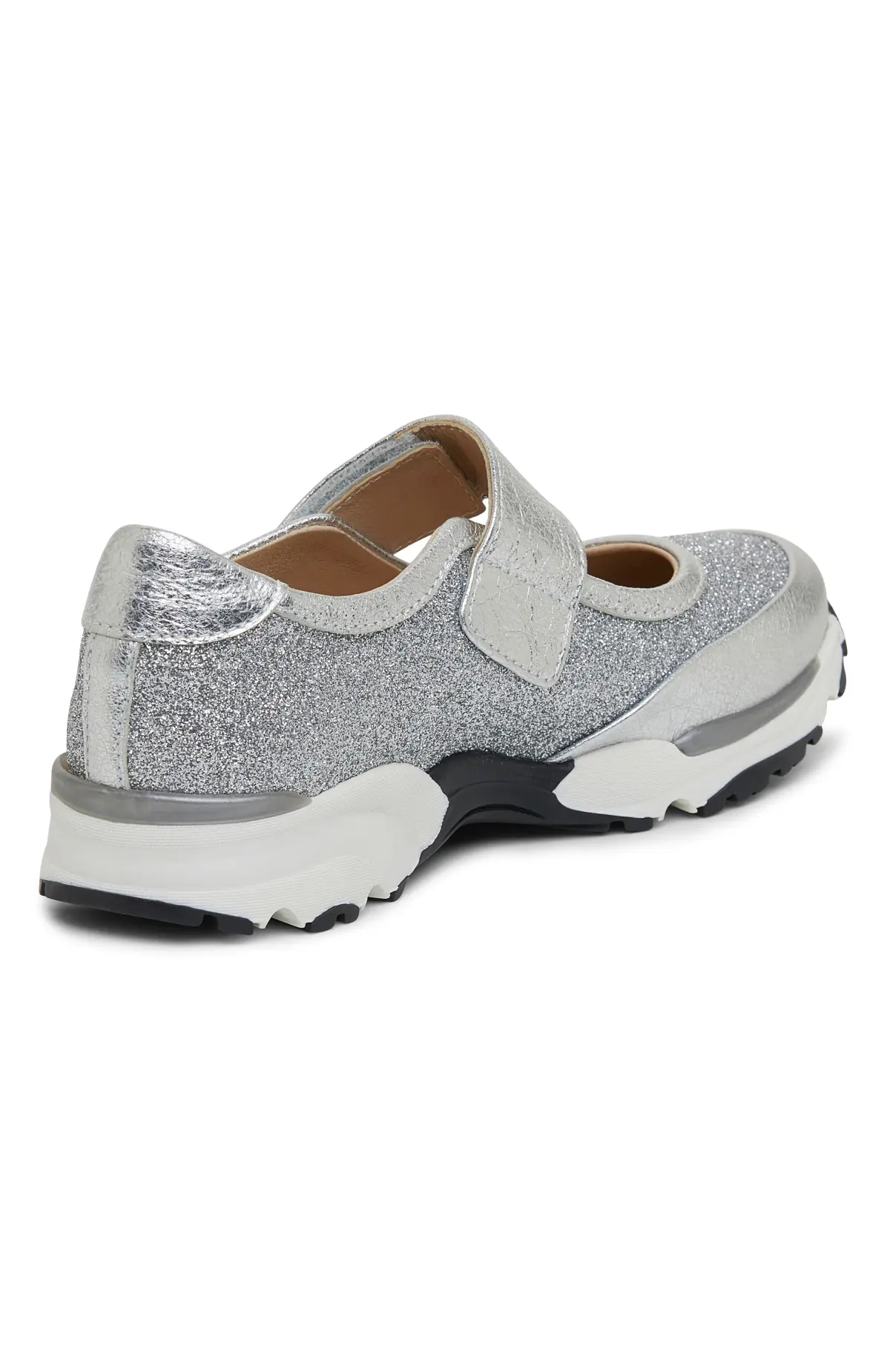 Кроссовки выполнены из материала с мерцающим глиттерным покрытием и вставками из металлизированной кожи. Ремешок Mary Jane на велкро фиксирует стопу и подчёркивает аккуратный силуэт, анатомичная колодка обеспечивает комфортное прилегание. Объёмная спортивная подошва с протектором смягчает шаг и подходит для повседневной носки.