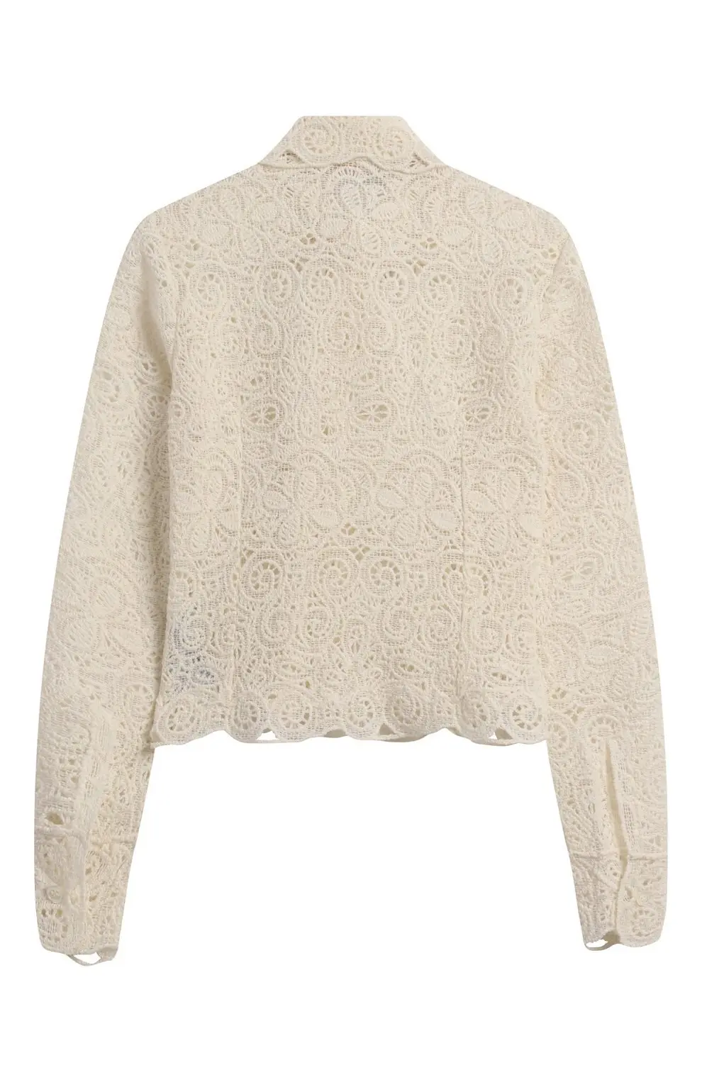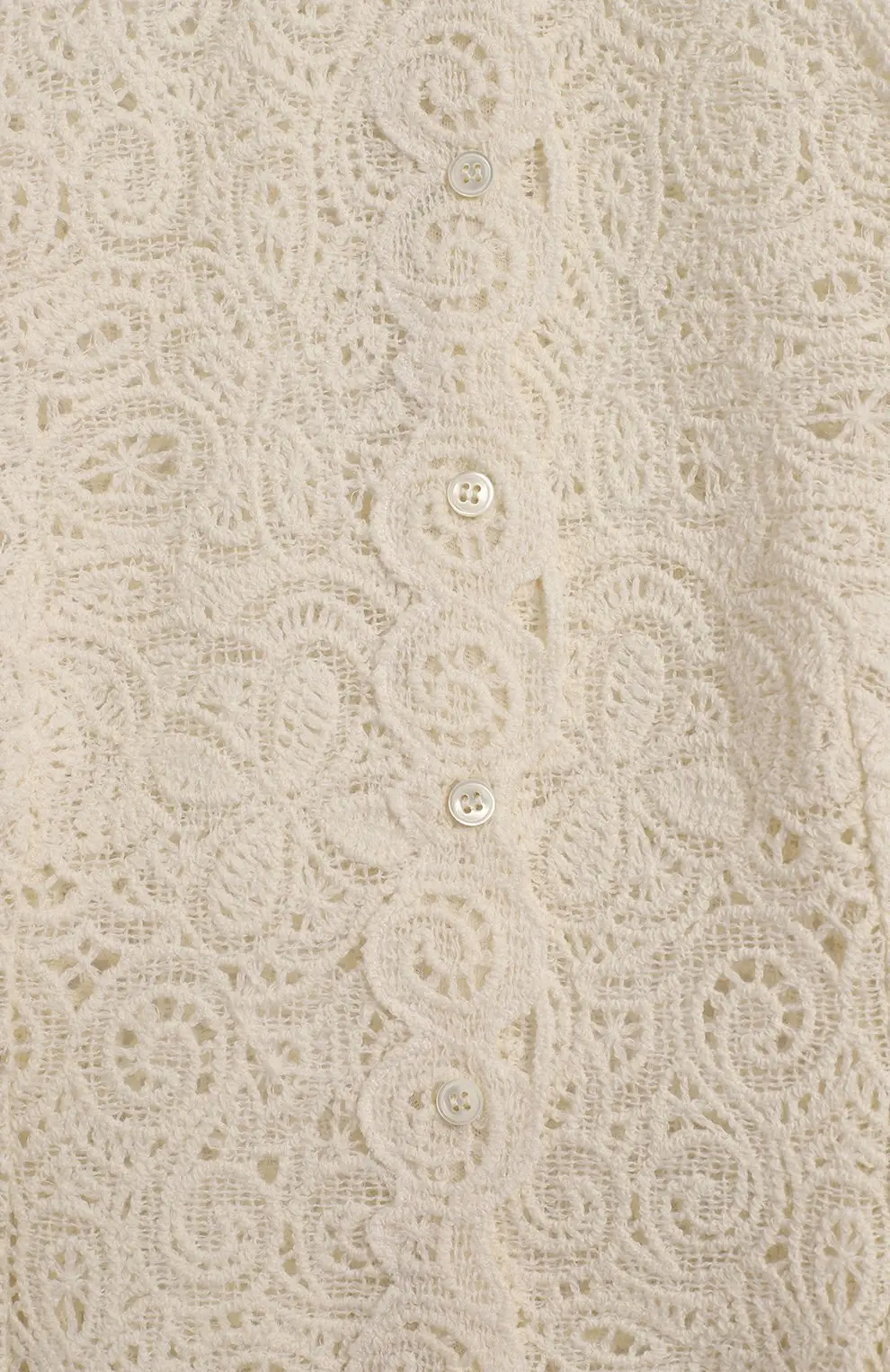 Кремовая кружевная блузка Ermanno Scervino выполнена из тонкого ажурного материала с утонченным цветочным узором. Прямой крой, воротник-стойка и застежка на пуговицы придают модели элегантность и делают её универсальной для создания женственных образов.