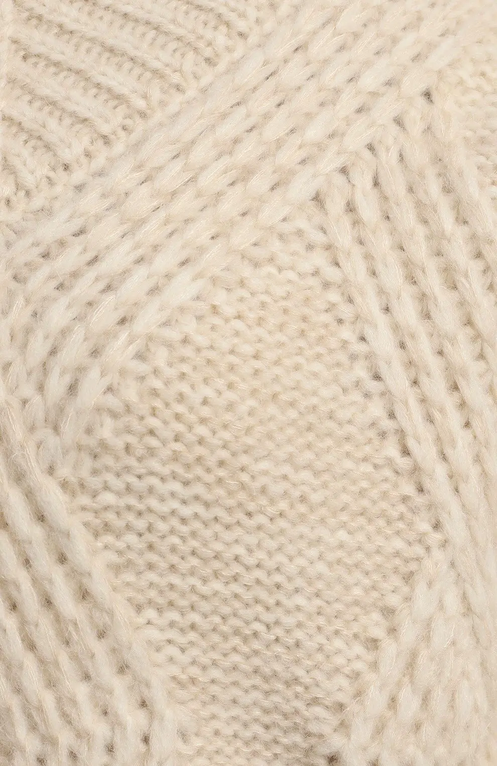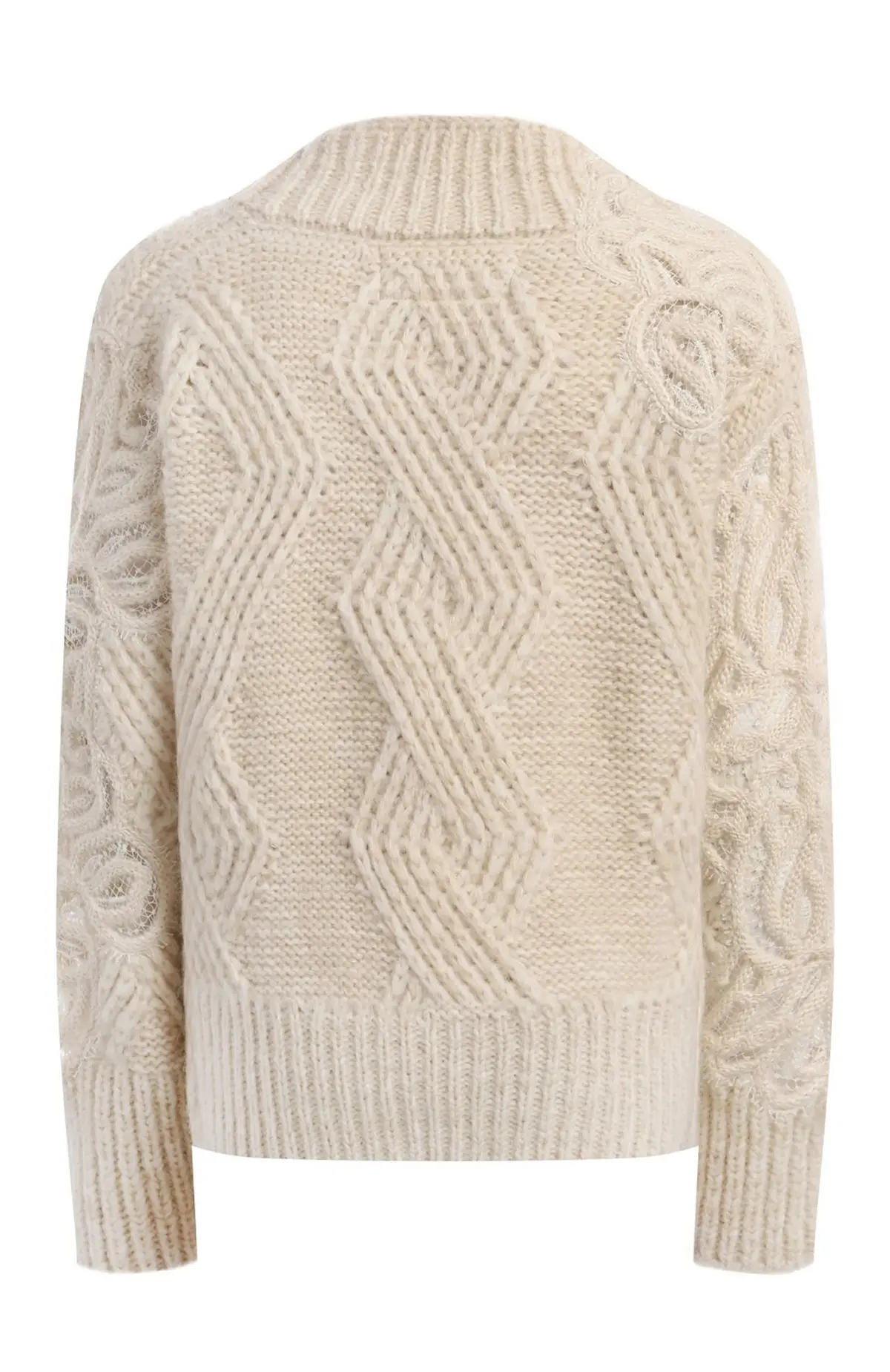 Шерстяной свитер Ermanno Scervino выполнен в мягком молочном оттенке и украшен фактурным вязаным узором с ажурными вставками. Объёмная вязка придаёт модели уют и подчёркивает её премиальное качество. Эластичные манжеты и нижний край обеспечивают комфортную посадку. Такой свитер станет основой стильных зимних образов, сочетая тепло и изысканность.