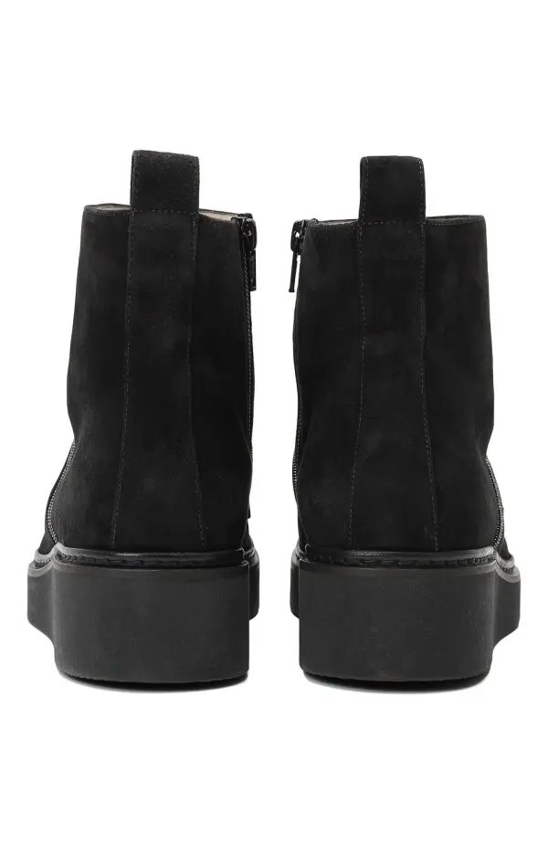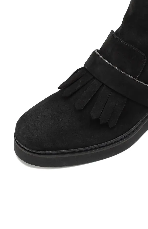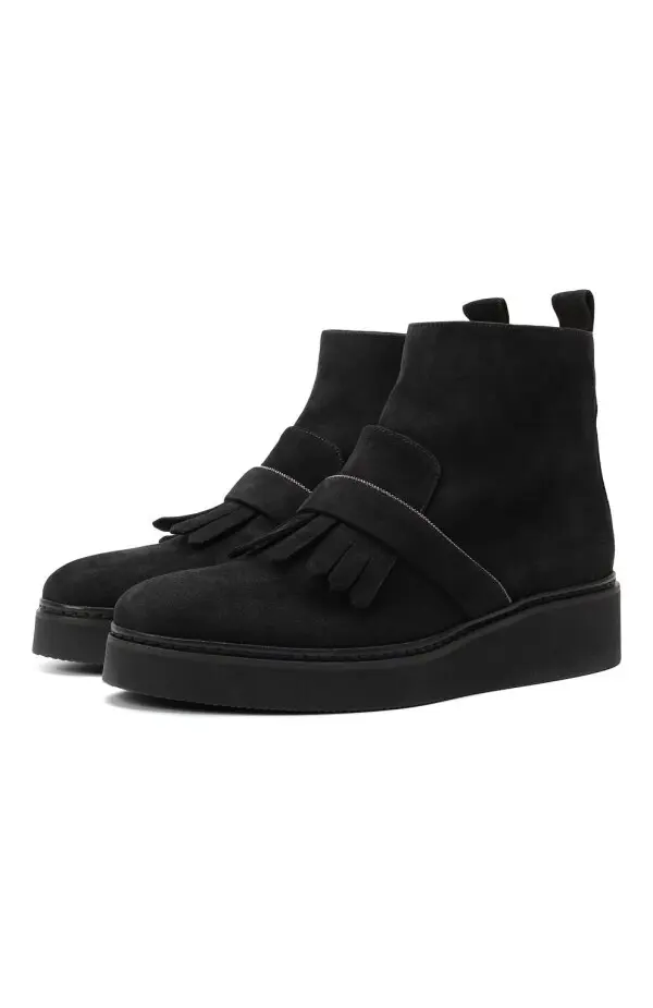 Ботинки Penelope Fabiana Filippi выполнены из мягкой чёрной замши, что придаёт им элегантный и благородный вид. Акцентом модели служит декоративная перемычка с бахромой, которая добавляет динамику и утончённость в дизайн. Устойчивая платформа обеспечивает комфорт при носке и делает обувь практичной для повседневного гардероба. Эти ботинки удачно сочетают минимализм и характерные детали итальянского стиля.