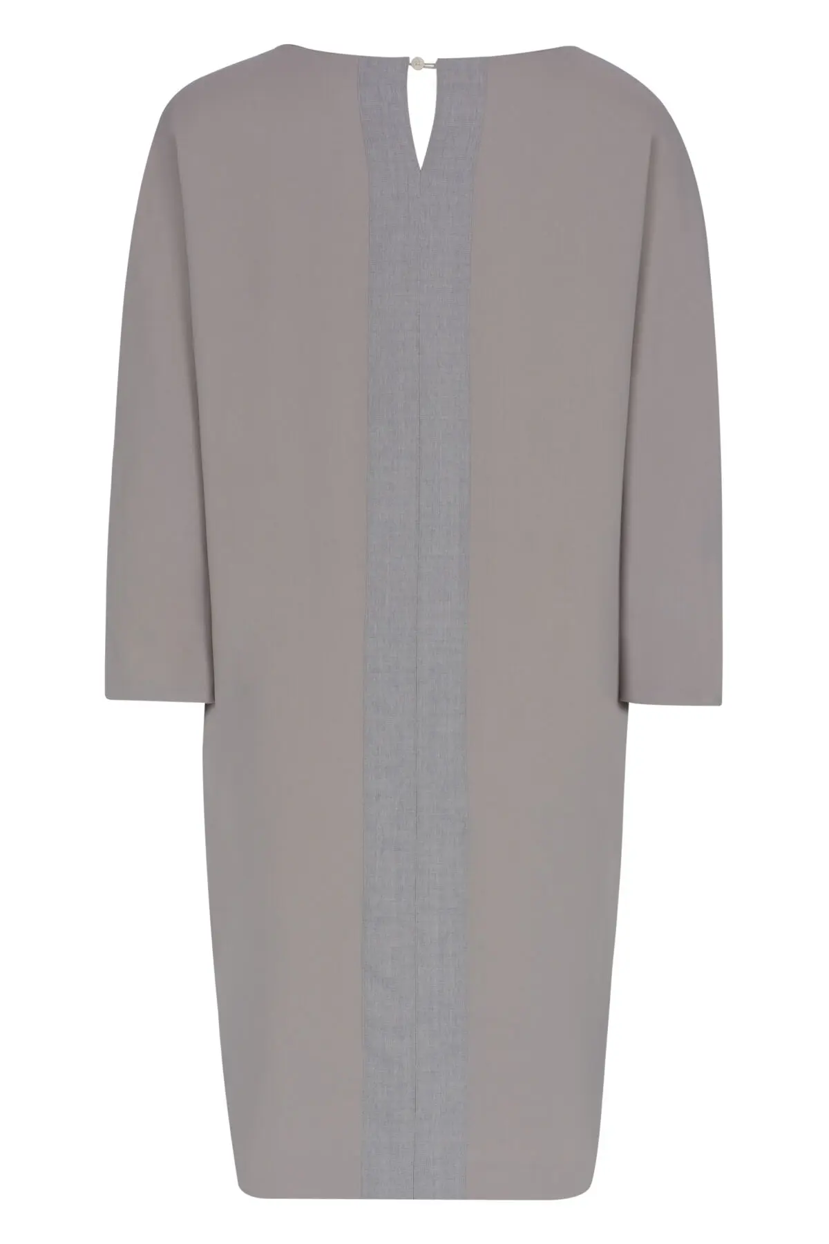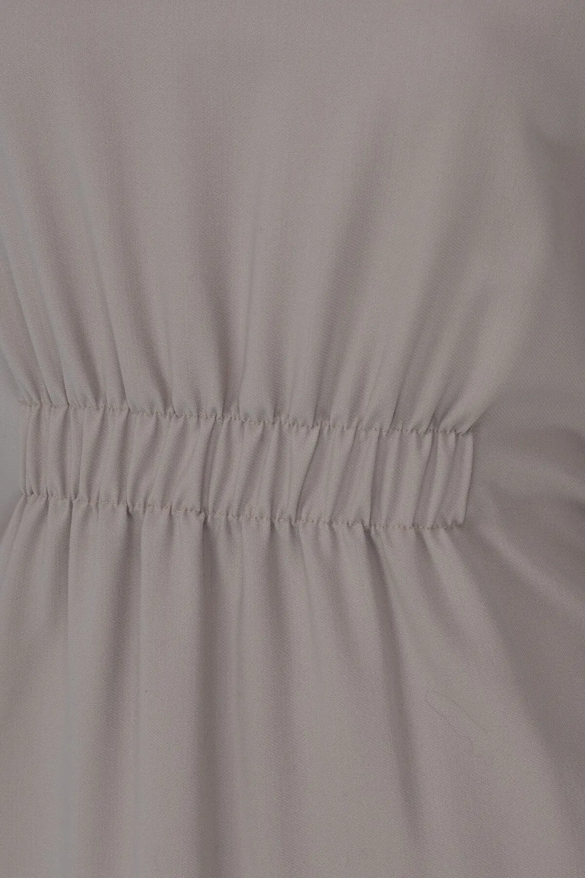 Платье прямого кроя выполнено из гладкой ткани с мягкой матовой фактурой. Модель дополнена эластичной сборкой по линии талии, которая формирует аккуратный силуэт и подчёркивает фигуру. Лаконичный вырез и рукава длиной три четверти создают сдержанный и элегантный образ.
