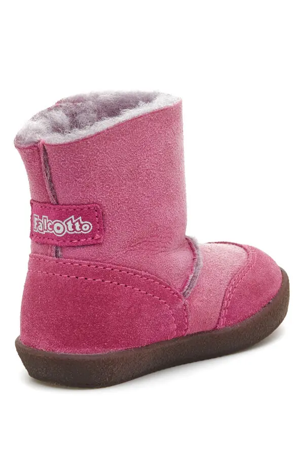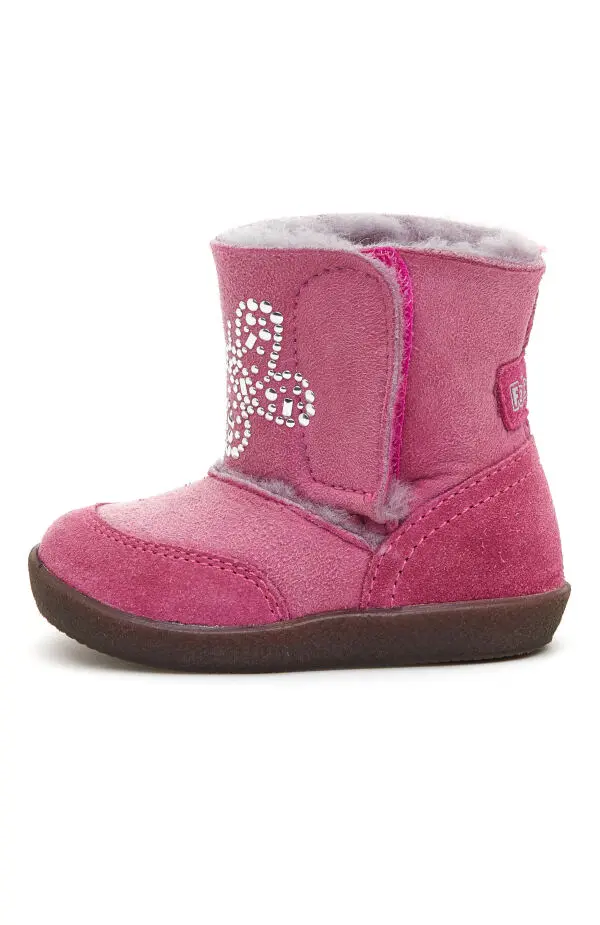 Выполнены из мягкой розовой замши с тёплой меховой подкладкой. Широкая застёжка на липучке обеспечивает удобное надевание и комфортное прилегание. Декор из кристаллов в форме бабочки и гибкая подошва подчёркивают аккуратный силуэт и подходят для ежедневных прогулок.