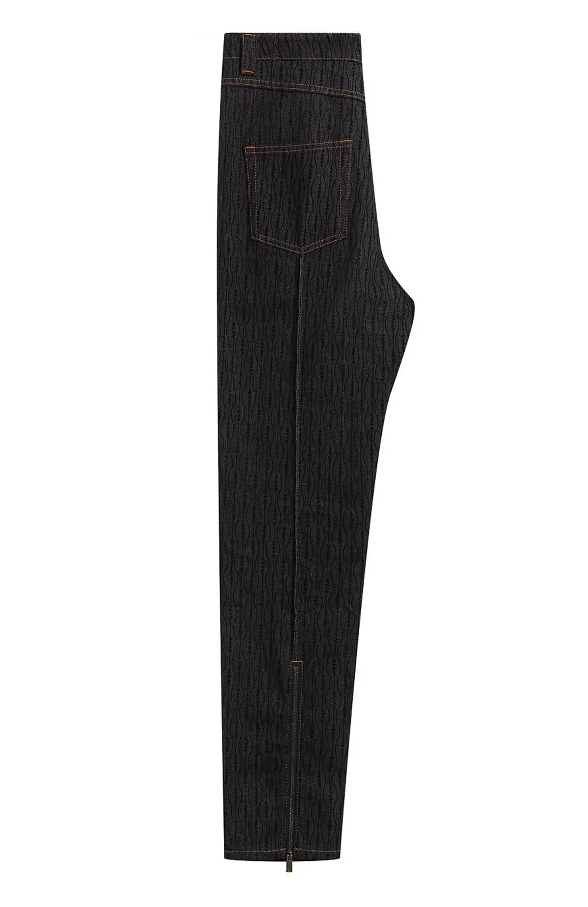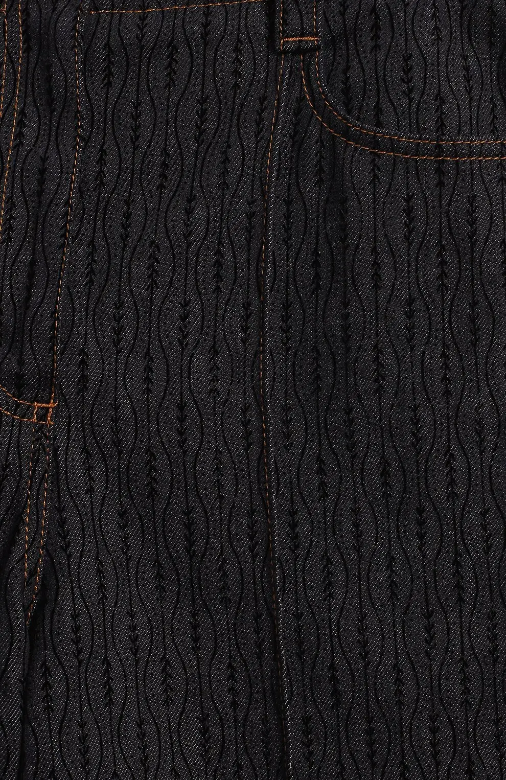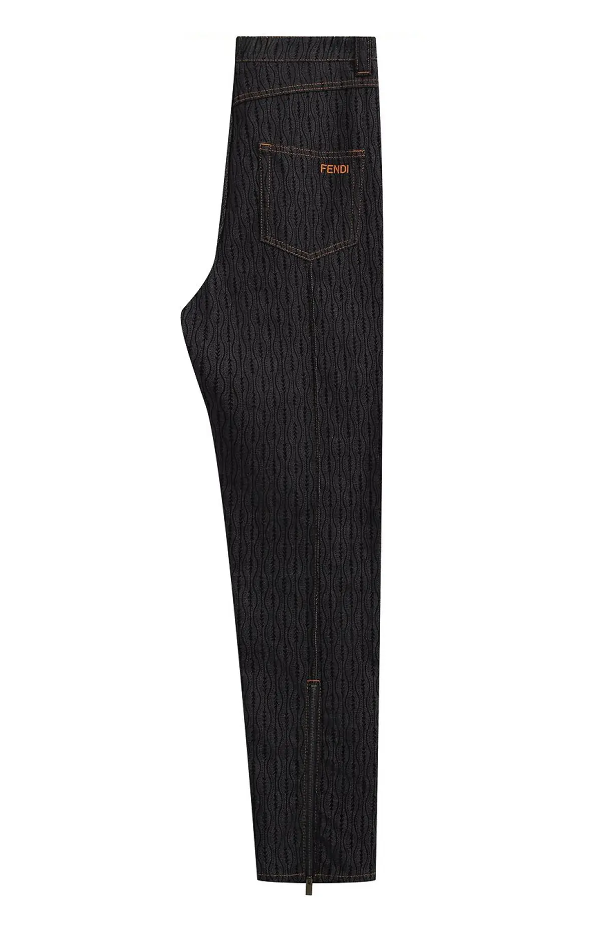Джинсы Fendi выполнены из плотного хлопкового денима с характерным тиснением, создающим фирменный волнообразный узор. Прямой крой обеспечивает комфорт и универсальность, а контрастная отстрочка подчёркивает безупречное качество пошива. Лаконичный дизайн сочетается с узнаваемыми деталями бренда, что делает модель стильным выбором для современного гардероба.