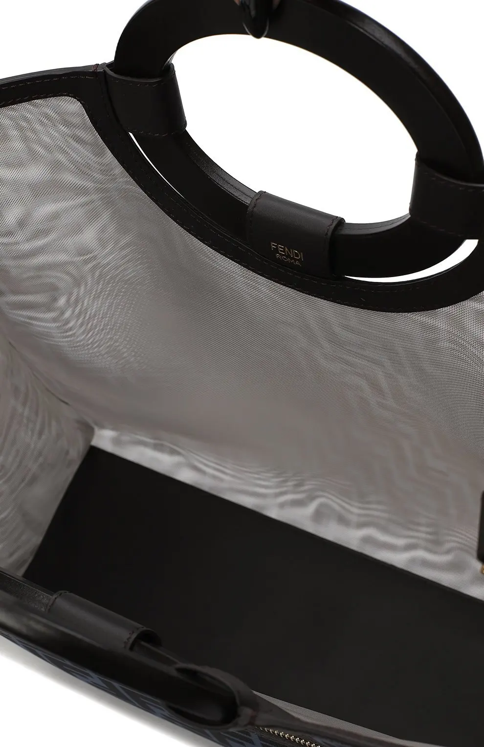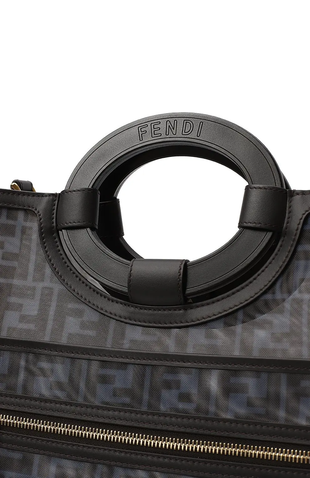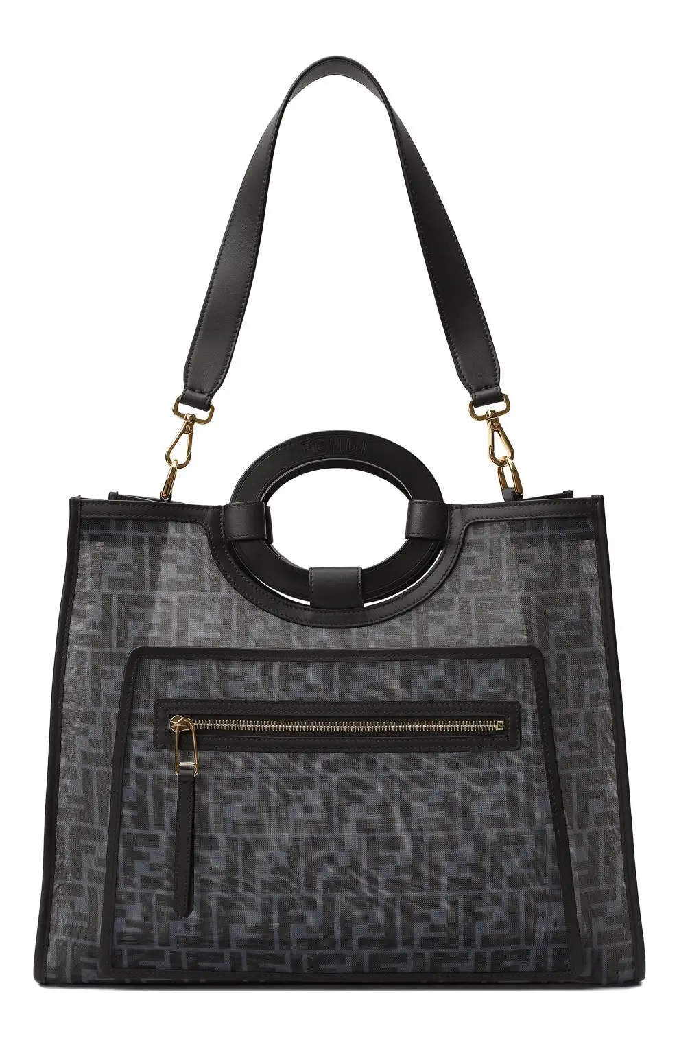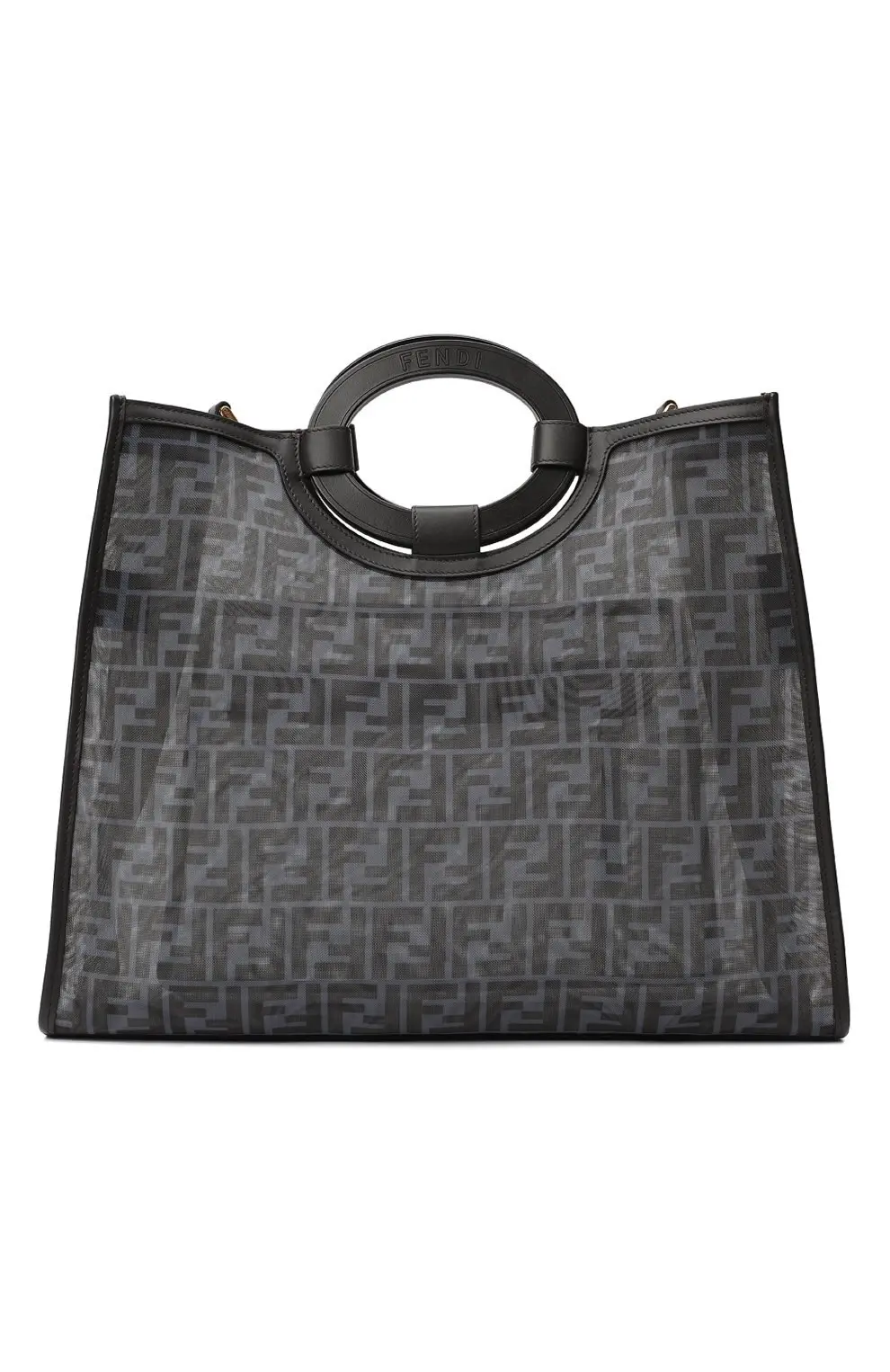 Сумка Runaway Large от Fendi выполнена в эффектном сочетании прозрачного материала с чётким монограммным узором FF и кожаными вставками. Модель отличается вместительным прямоугольным силуэтом, круглыми жёсткими ручками и практичным внешним карманом на молнии. Элегантный дизайн делает её удобной для повседневного использования, сохраняя при этом выразительный фирменный стиль бренда.