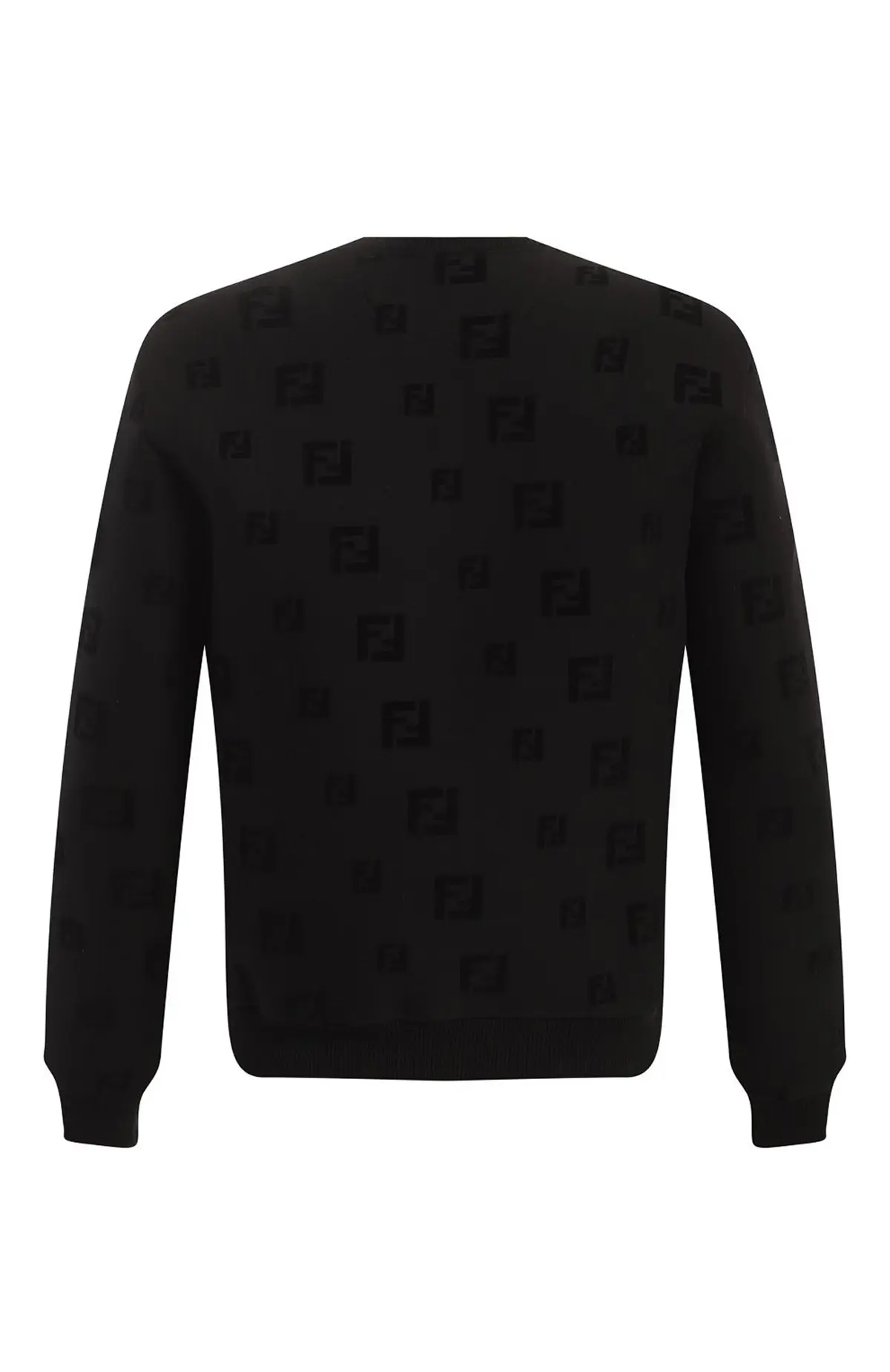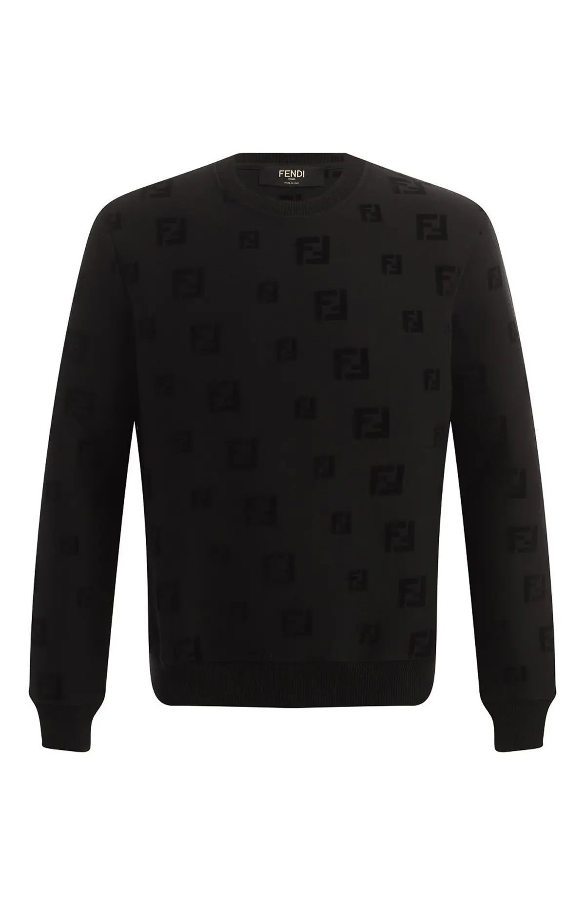 Хлопковый свитшот Fendi выполнен из мягкого трикотажа глубокого чёрного цвета. Лаконичный дизайн дополнен фактурным жаккардовым узором с логотипом FF, создающим тонкий монохромный эффект. Модель с круглым вырезом и эластичными манжетами сочетает комфорт и узнаваемый фирменный стиль бренда.