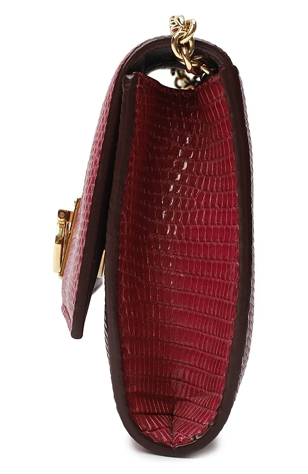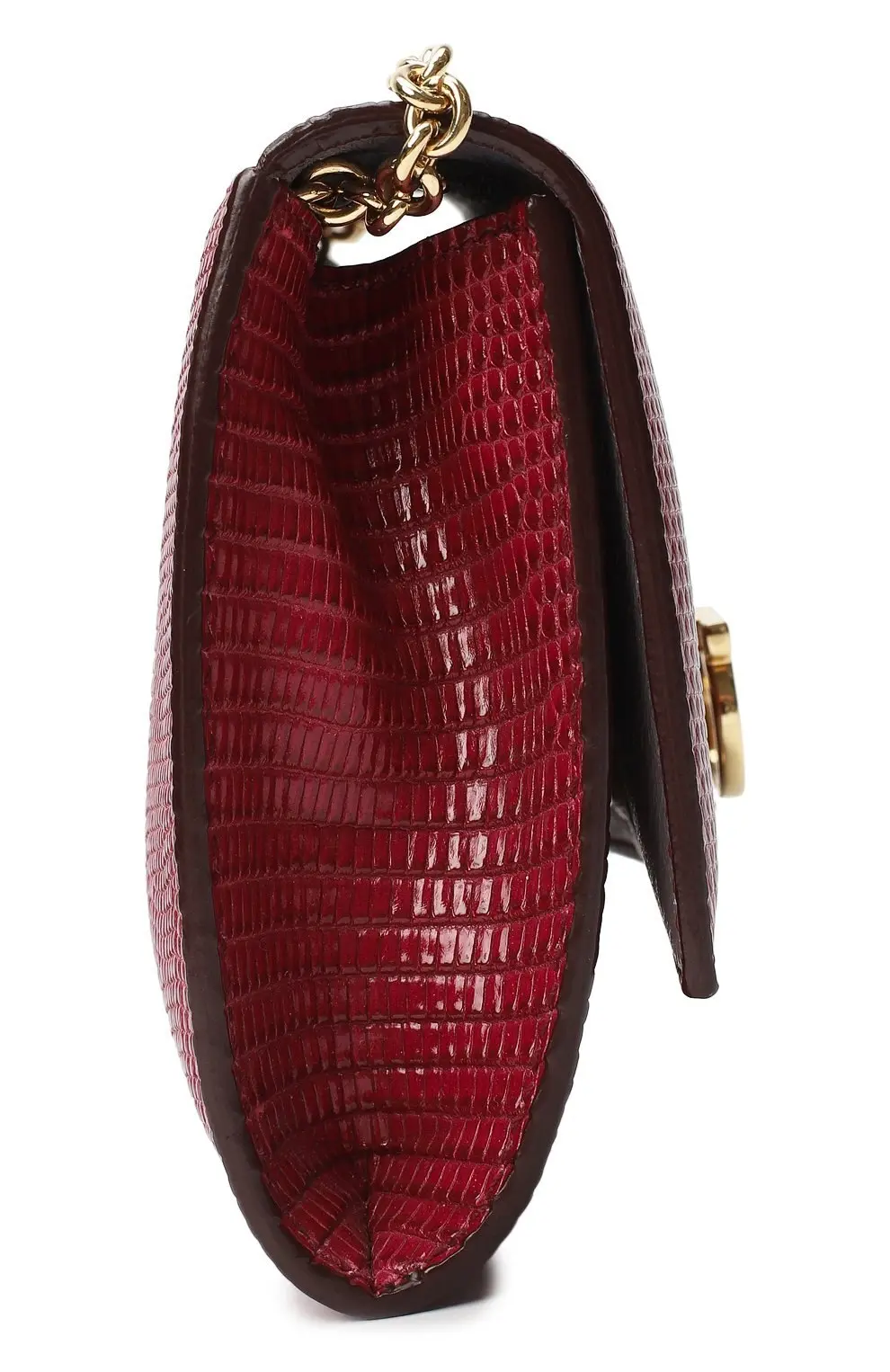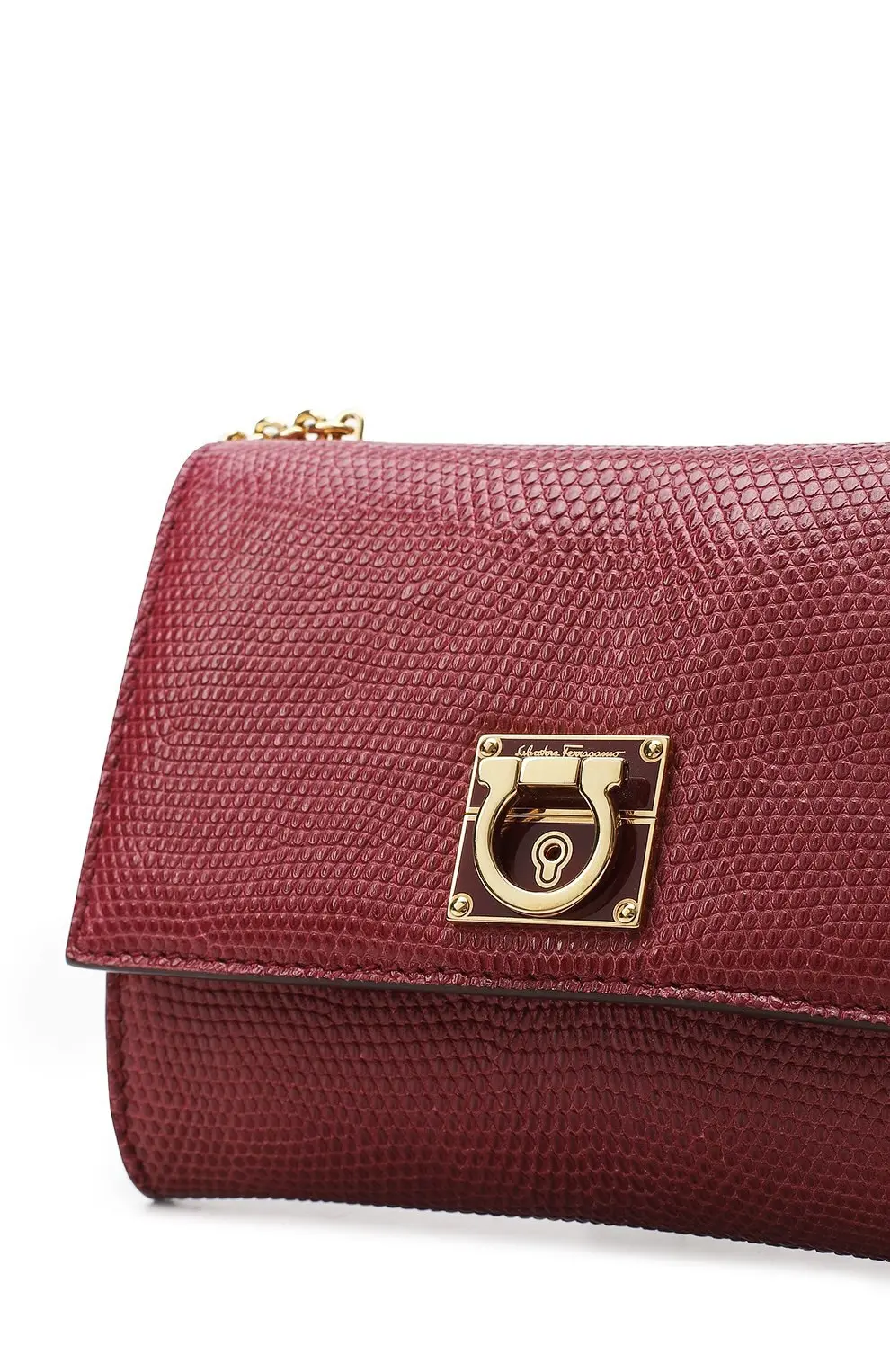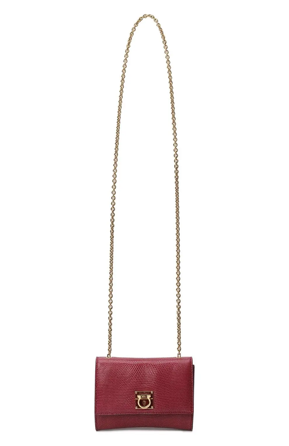 Сумка Salvatore Ferragamo из бордовой кожи с тиснением под рептилию. Модель с фирменной металлической застёжкой Gancini и цепочной ручкой сочетает изысканную классику и утончённый итальянский стиль.