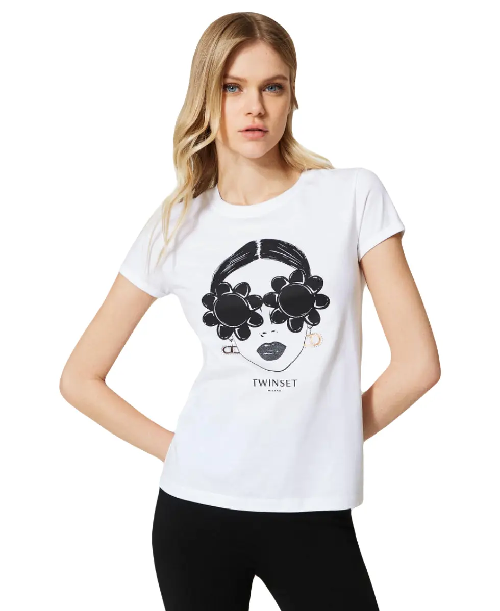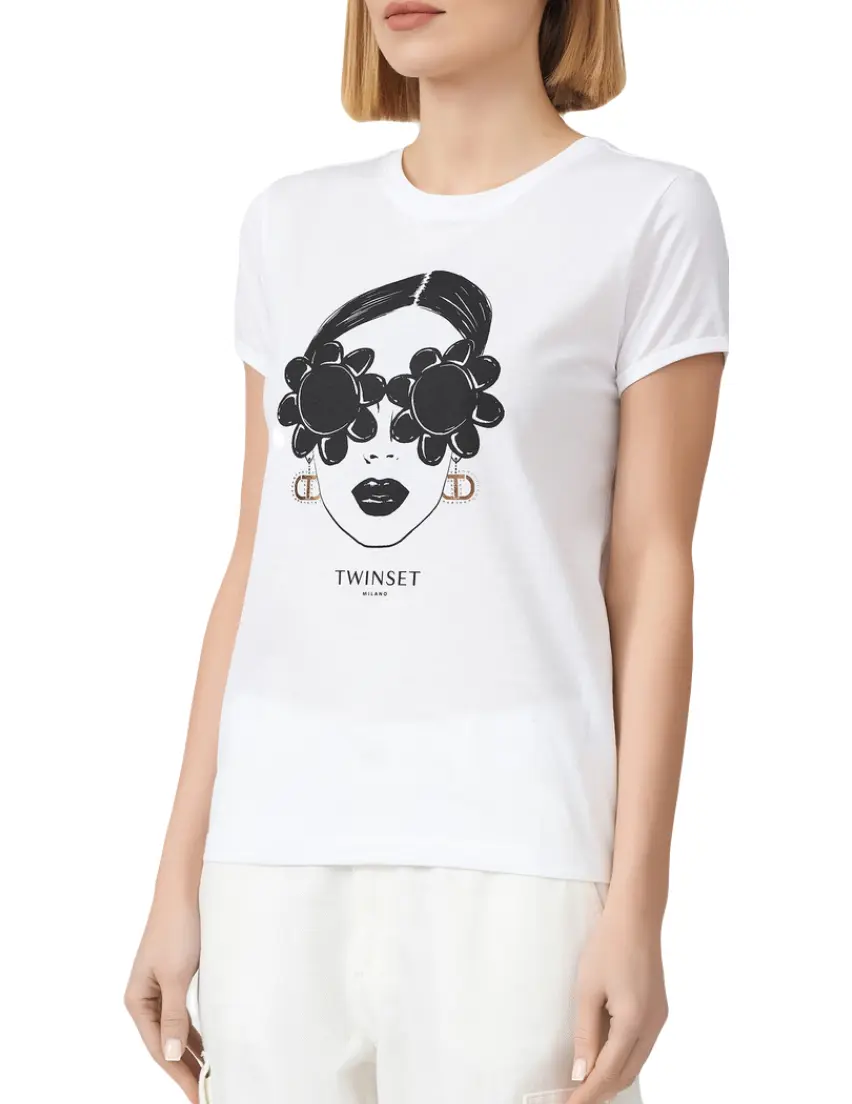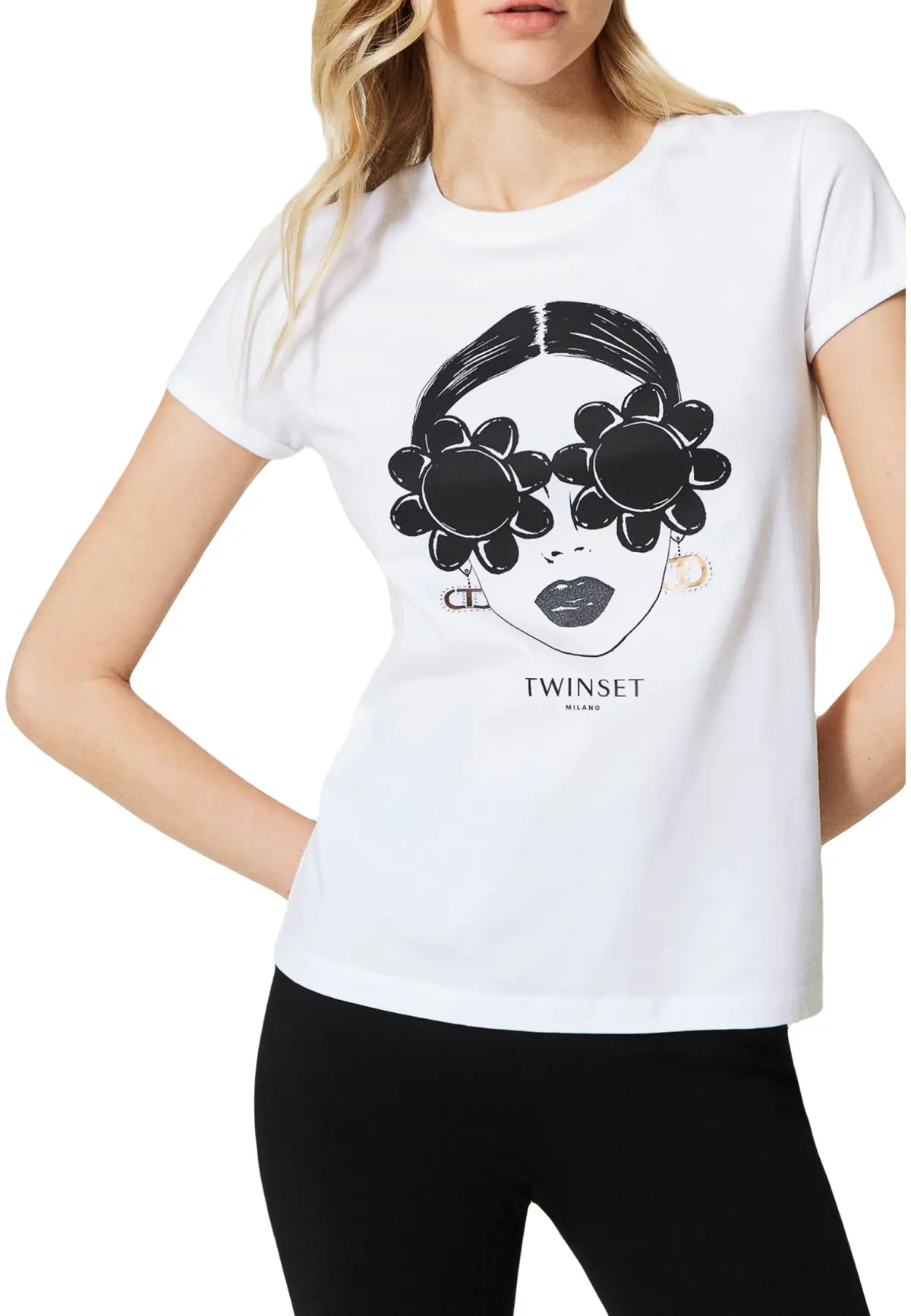 Футболка из легкого хлопкового джерси TWINSET. Изделие имеет принт в виде лица спереди и контрастным логотипом. Модель прямого кроя с круглым вырезом. Интересная футболка будет хорошо смотреться с овальными серьгами. Создайте идеальный образ с джинсами, шортами или юбкой — на свой вкус.