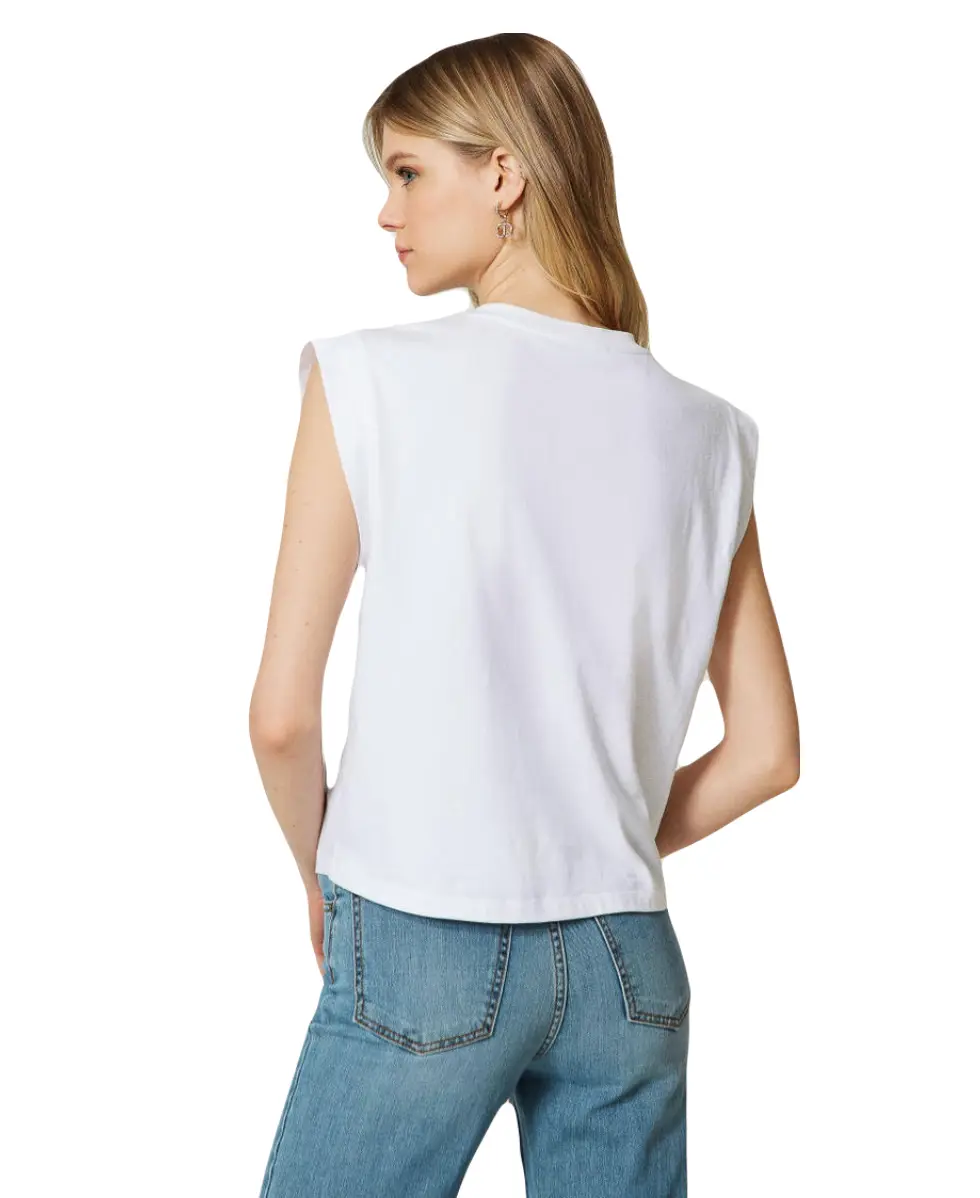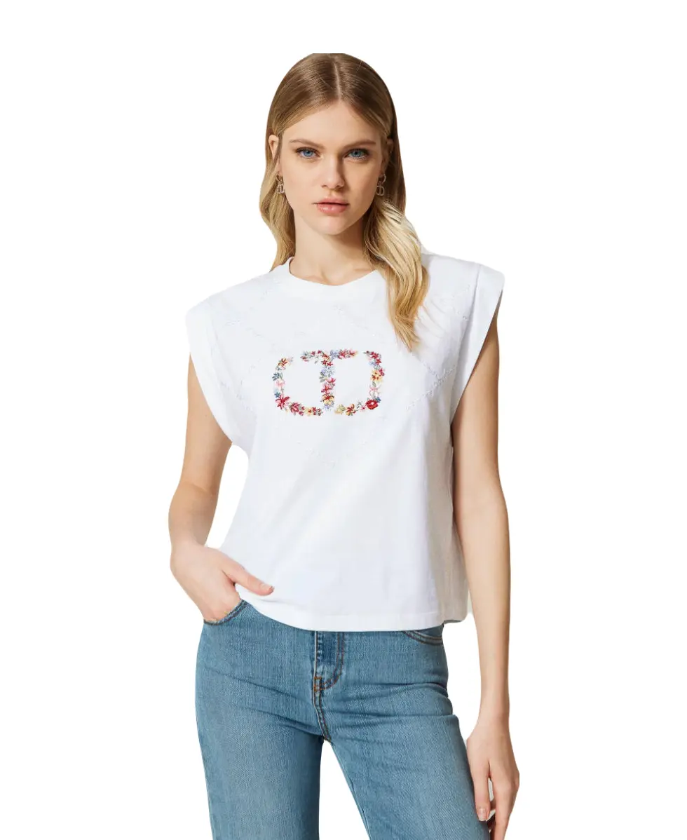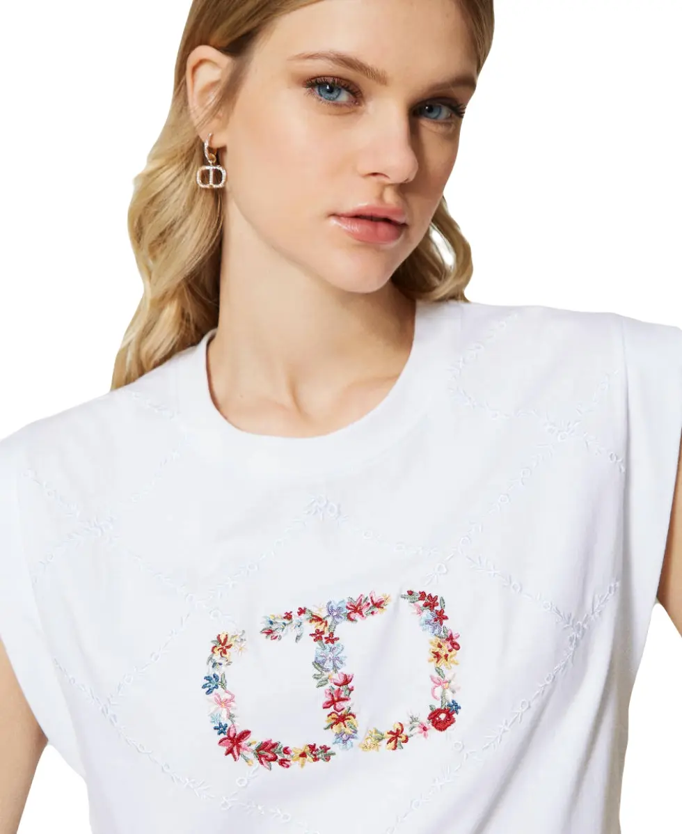Футболка TWINSET из хлопкового джерси. Разноцветная вышивка нитками «Овал Т» — изюминка изделия. У модели круглый вырез, рукава-кимоно и прямой крой. Персонализируйте свой образ стильно вместе с этой футболкой и сочетайте ее с облегающими джинсами.