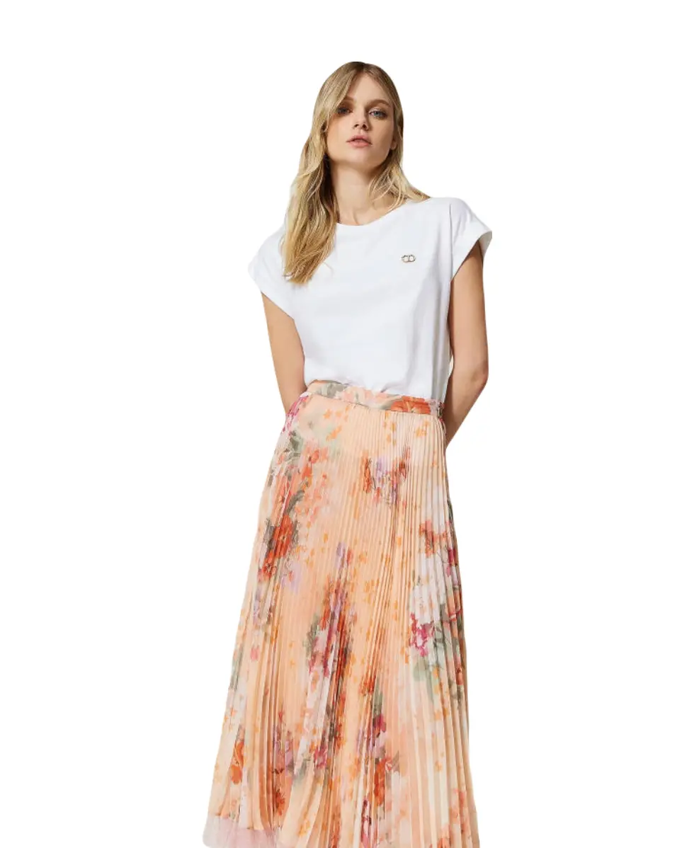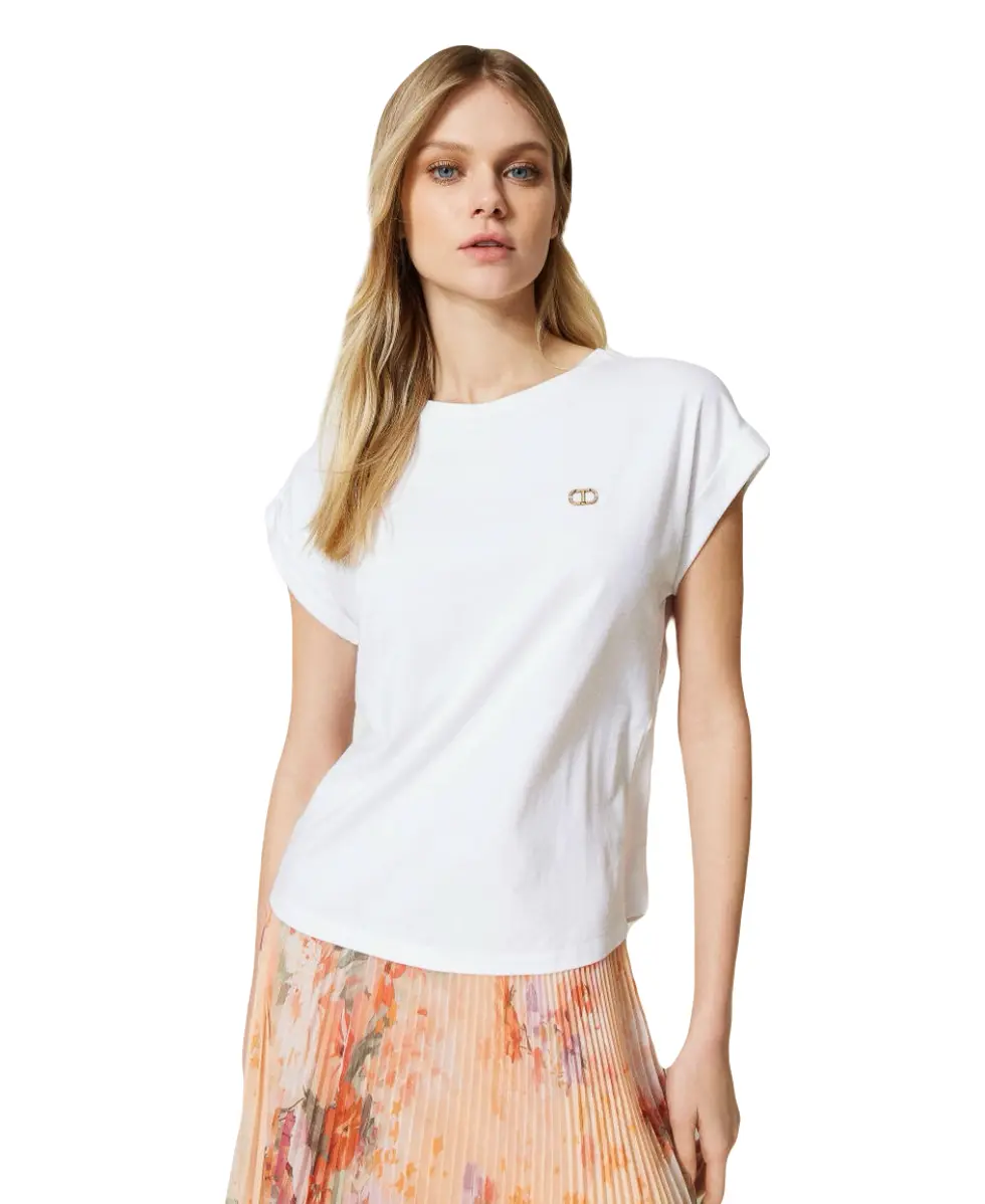 Футболка TWINSET из хлопкового джерси. Логотип — главное украшение изделия, выполнено из вставок с хрустальными стразами. У модели прямой крой и круглая горловина. Универсальная вещь, которую можно комбинировать по своему усмотрению.
