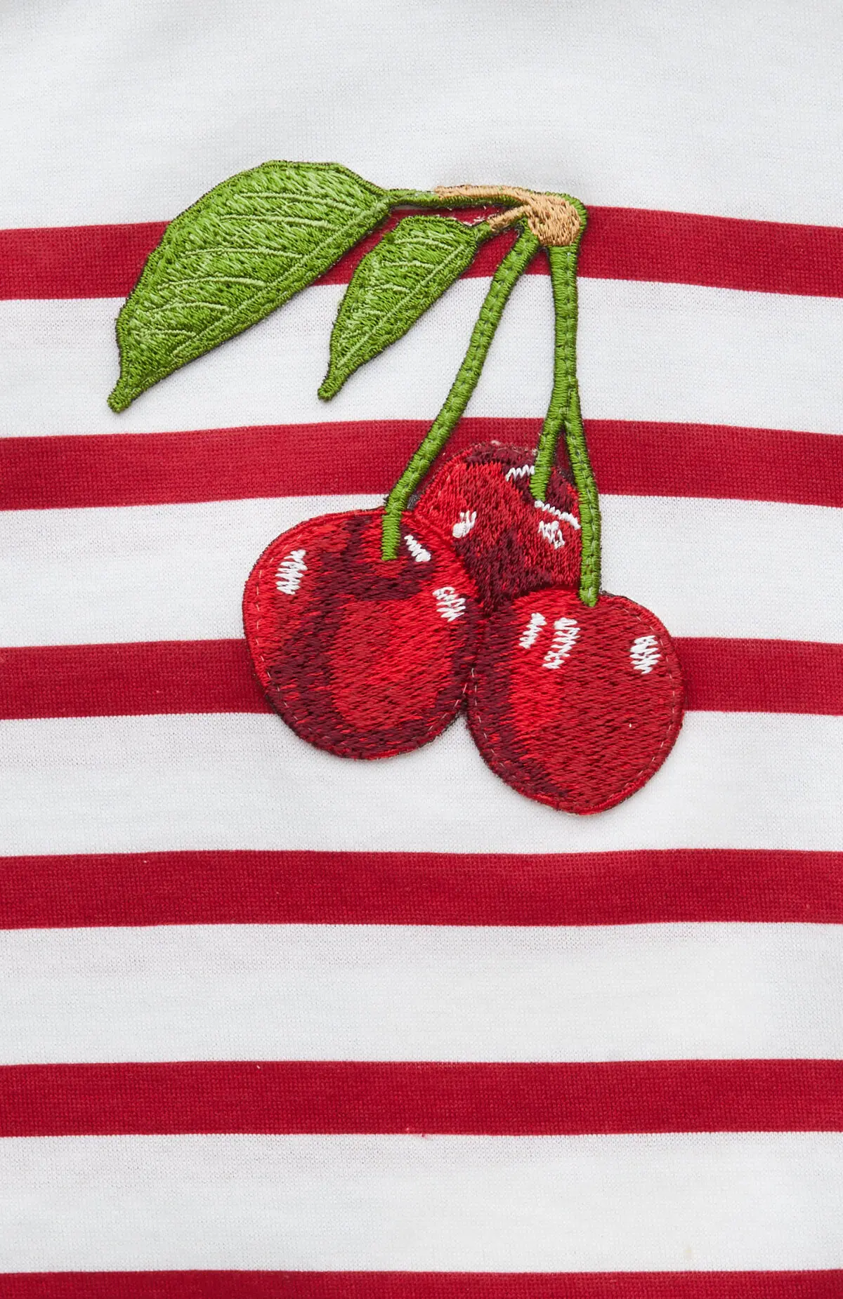 Футболка выполнена из мягкого эластичного хлопка и украшена контрастным полосатым узором. Декоративная вышивка в виде вишни добавляет образу выразительный акцент и подчёркивает игривый характер модели. Лаконичный крой обеспечивает комфортную посадку, делая изделие универсальным выбором для повседневных образов.