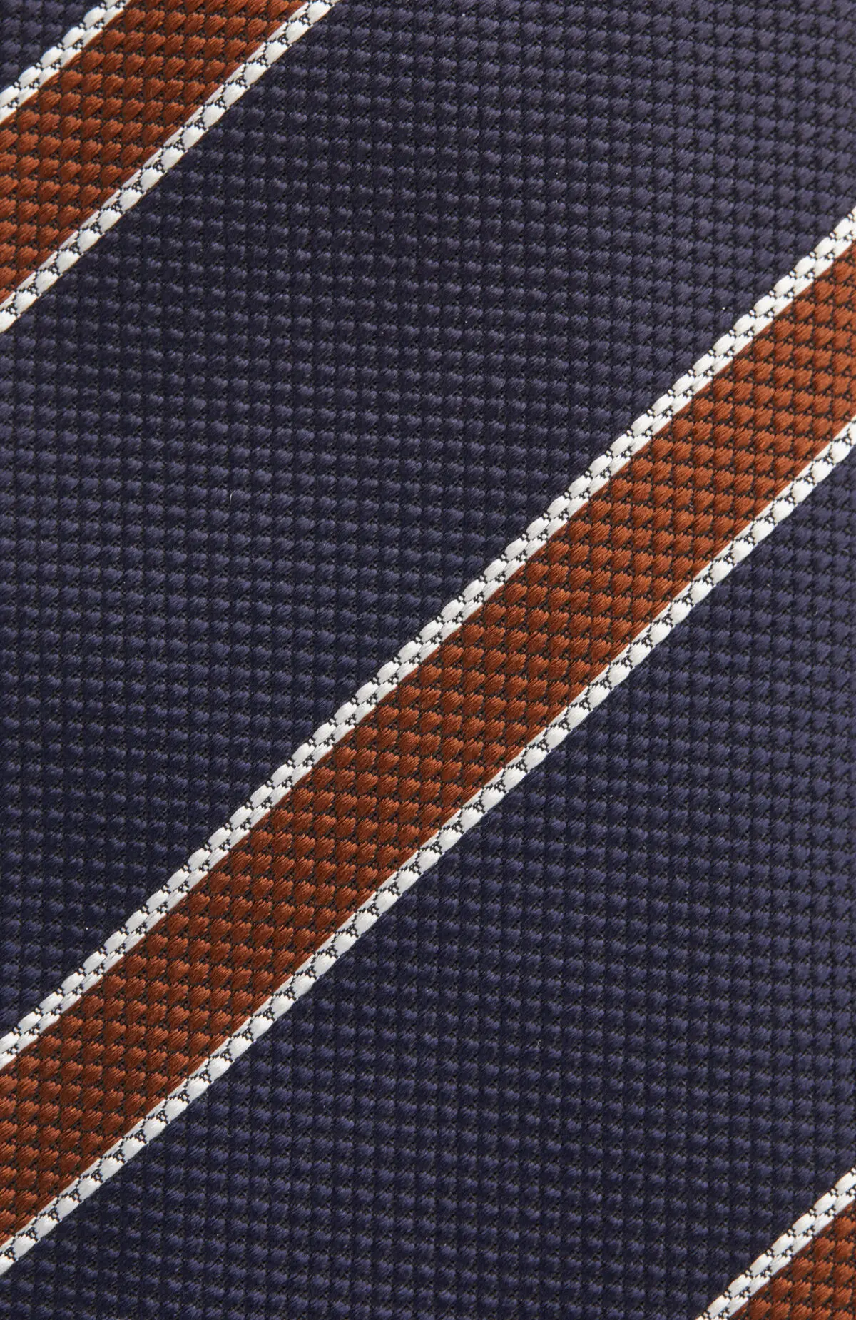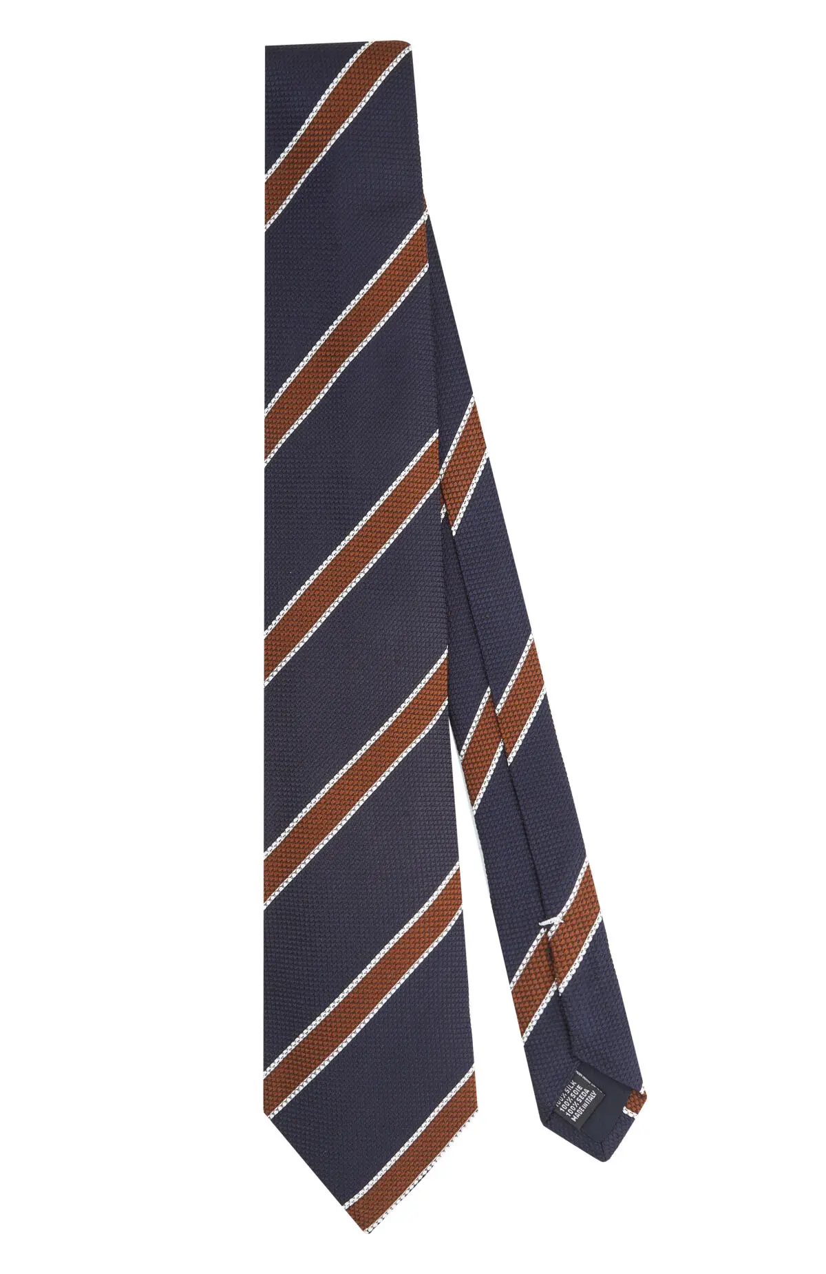 Выполнен из гладкого материала с лёгким блеском и диагональными полосами в тёмно-синей, коричневой и белой гамме. Плотная фактура уверенно держит форму узла и подчёркивает линию лацканов. Классическая ширина и сдержанный рисунок легко сочетаются с костюмами в синей и серой палитре.