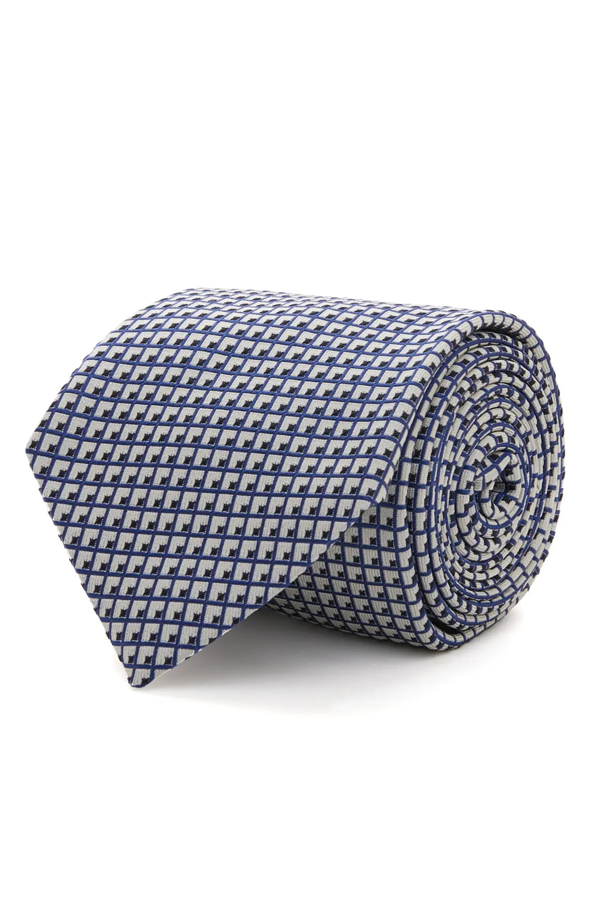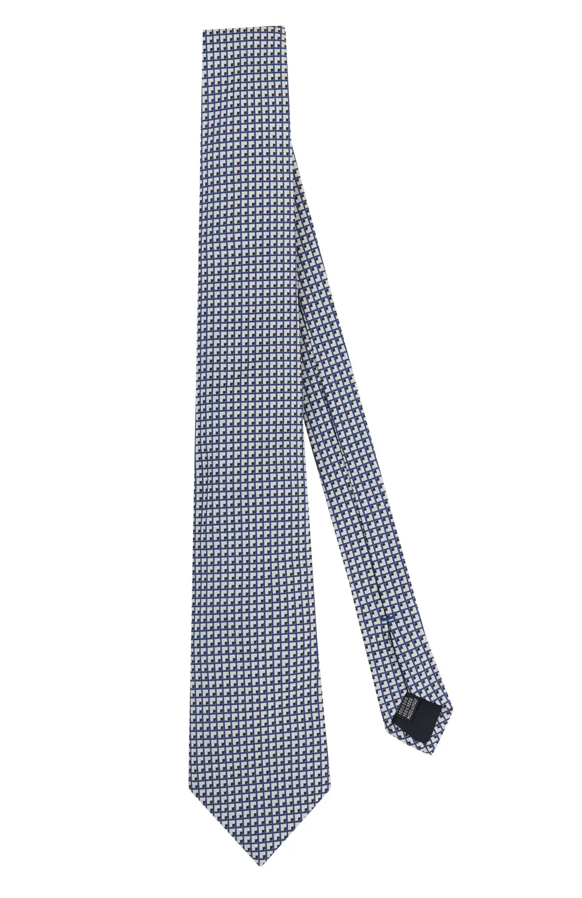 Выполнен из гладкого материала с деликатным блеском и микроузором в сине-молочной гамме. Плотная фактура уверенно держит форму узла и аккуратно подчёркивает линию лацканов. Сдержанная графика делает модель универсальной для деловых сочетаний.