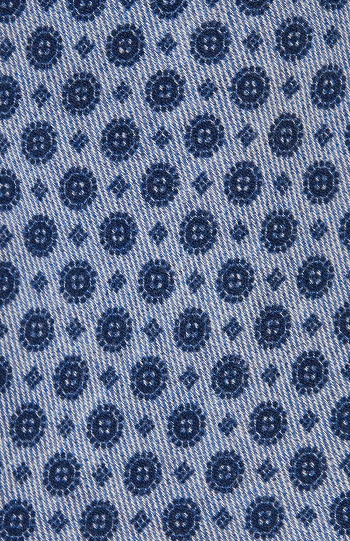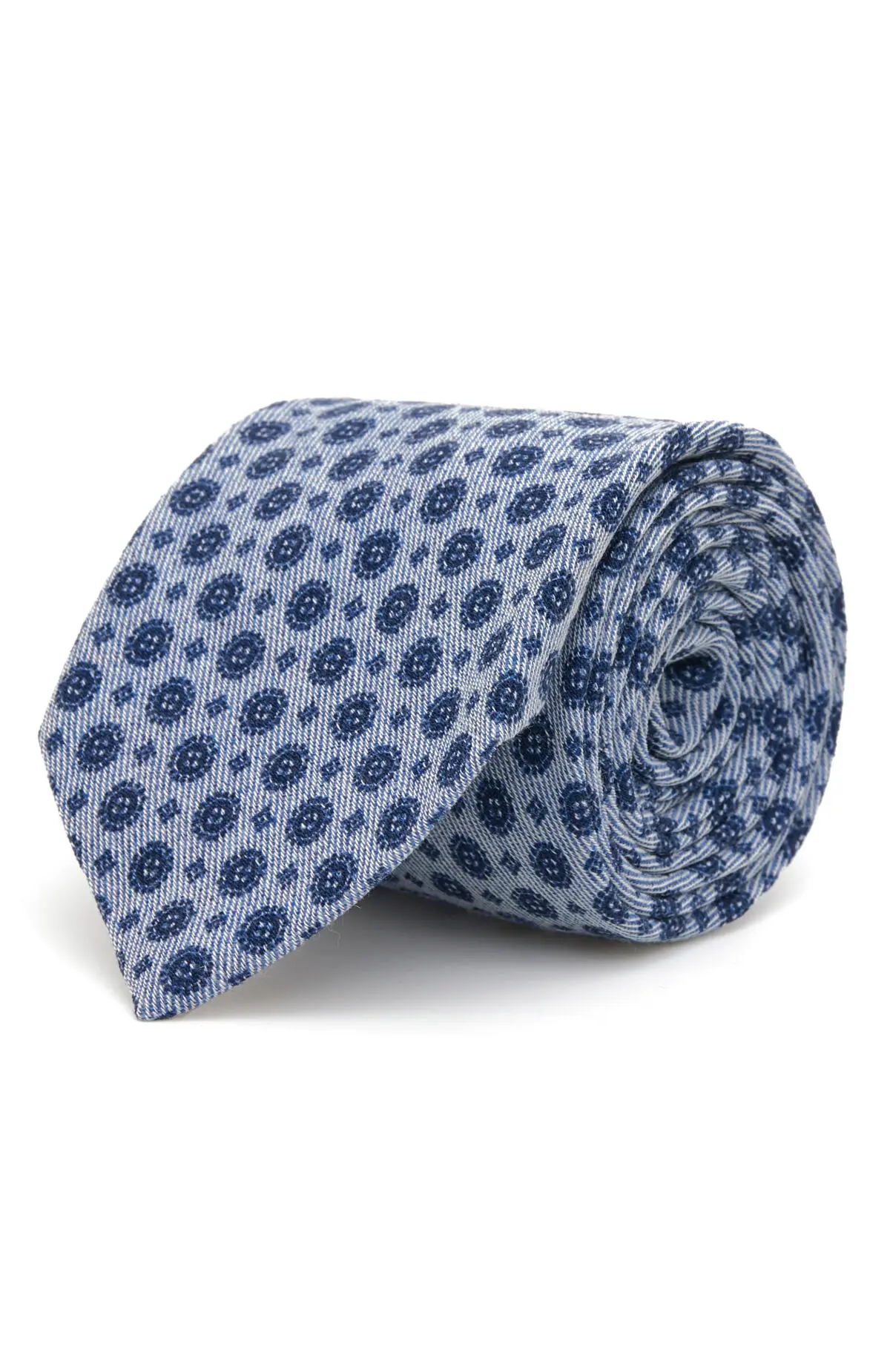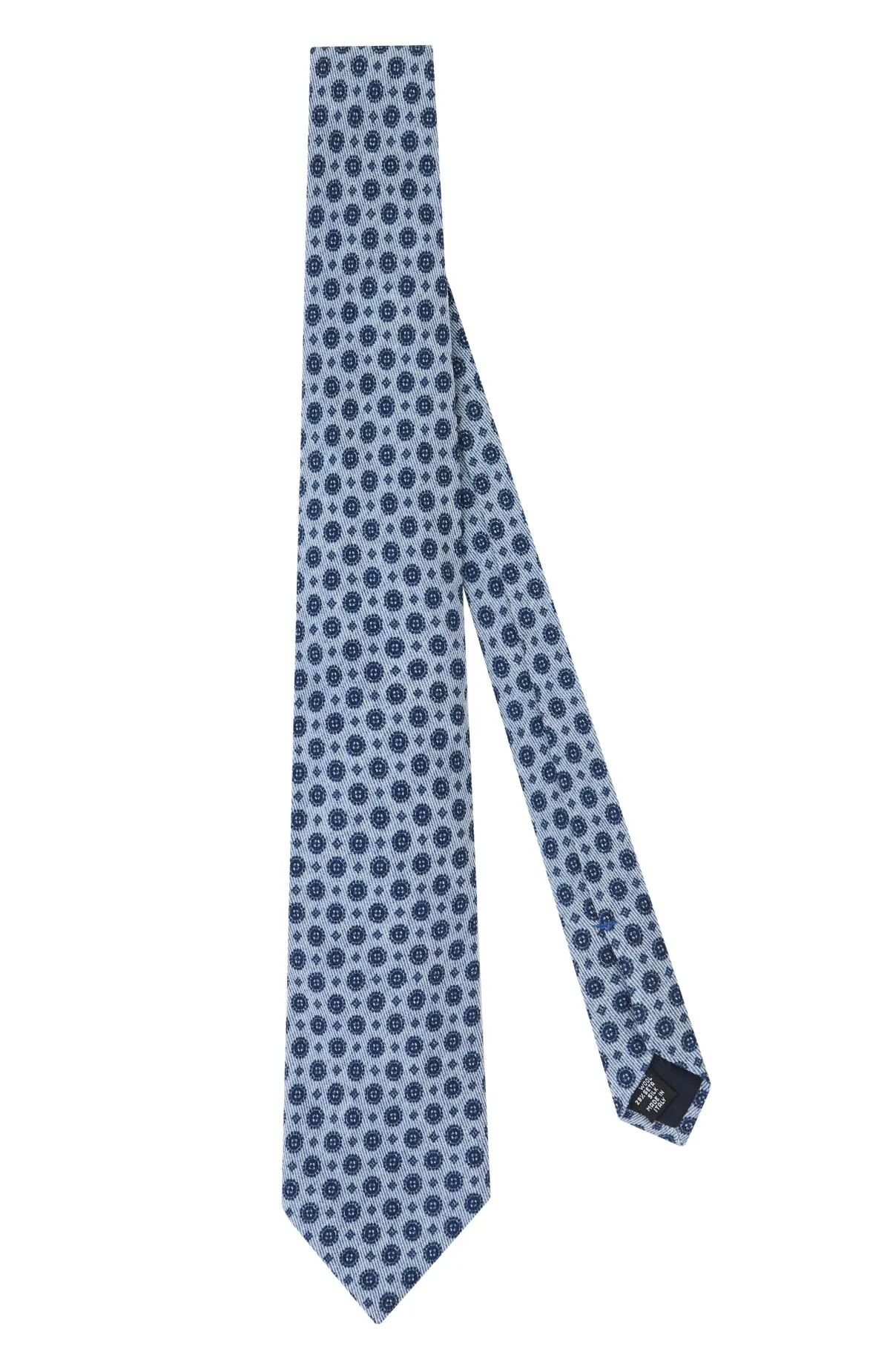 Выполнен из гладкого материала с лёгким блеском и микроузором в оттенках синего. Плотная фактура уверенно держит форму узла и подчёркивает линию лацканов. Сдержанная палитра и классическая ширина легко вписываются в деловой гардероб.