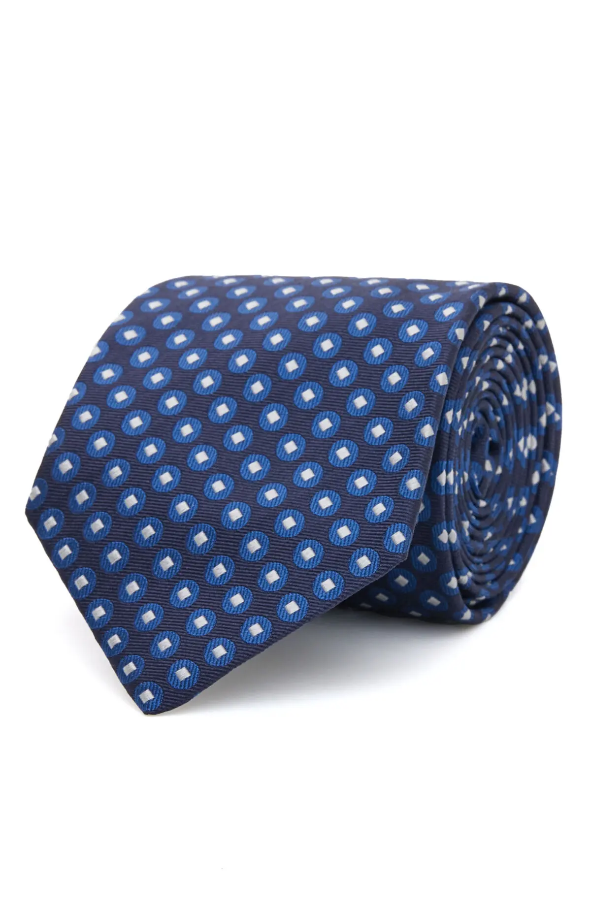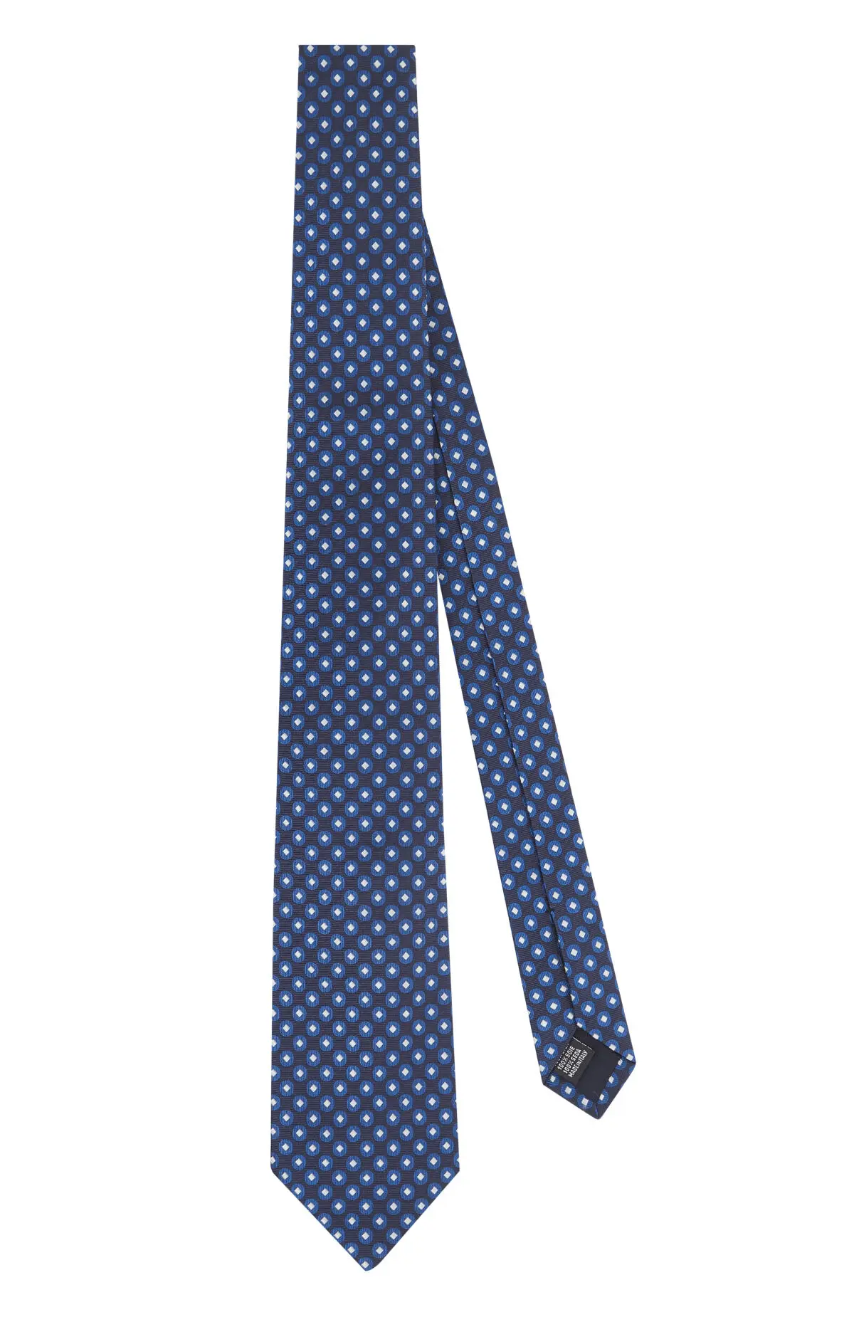Выполнен из гладкого материала с лёгким сатиновым блеском и микроузором в оттенках тёмно-синего и небесного. Плотное полотно уверенно держит форму узла и подчёркивает линию лацканов. Сдержанный рисунок добавляет аккуратный акцент к классическим костюмам.