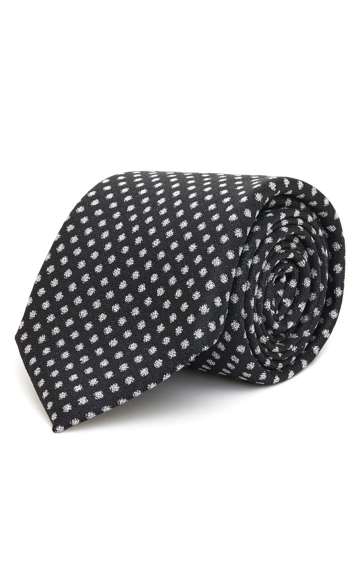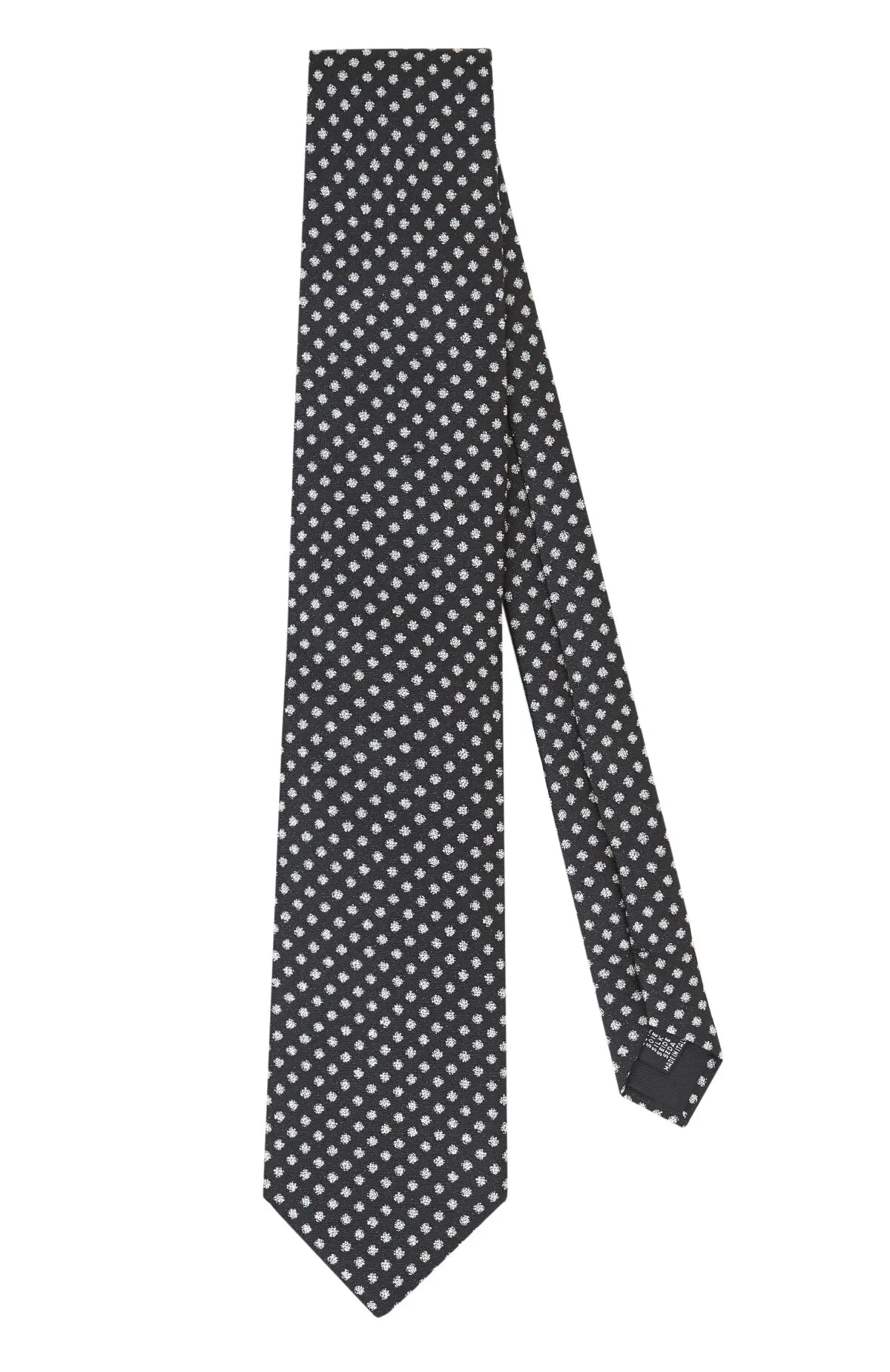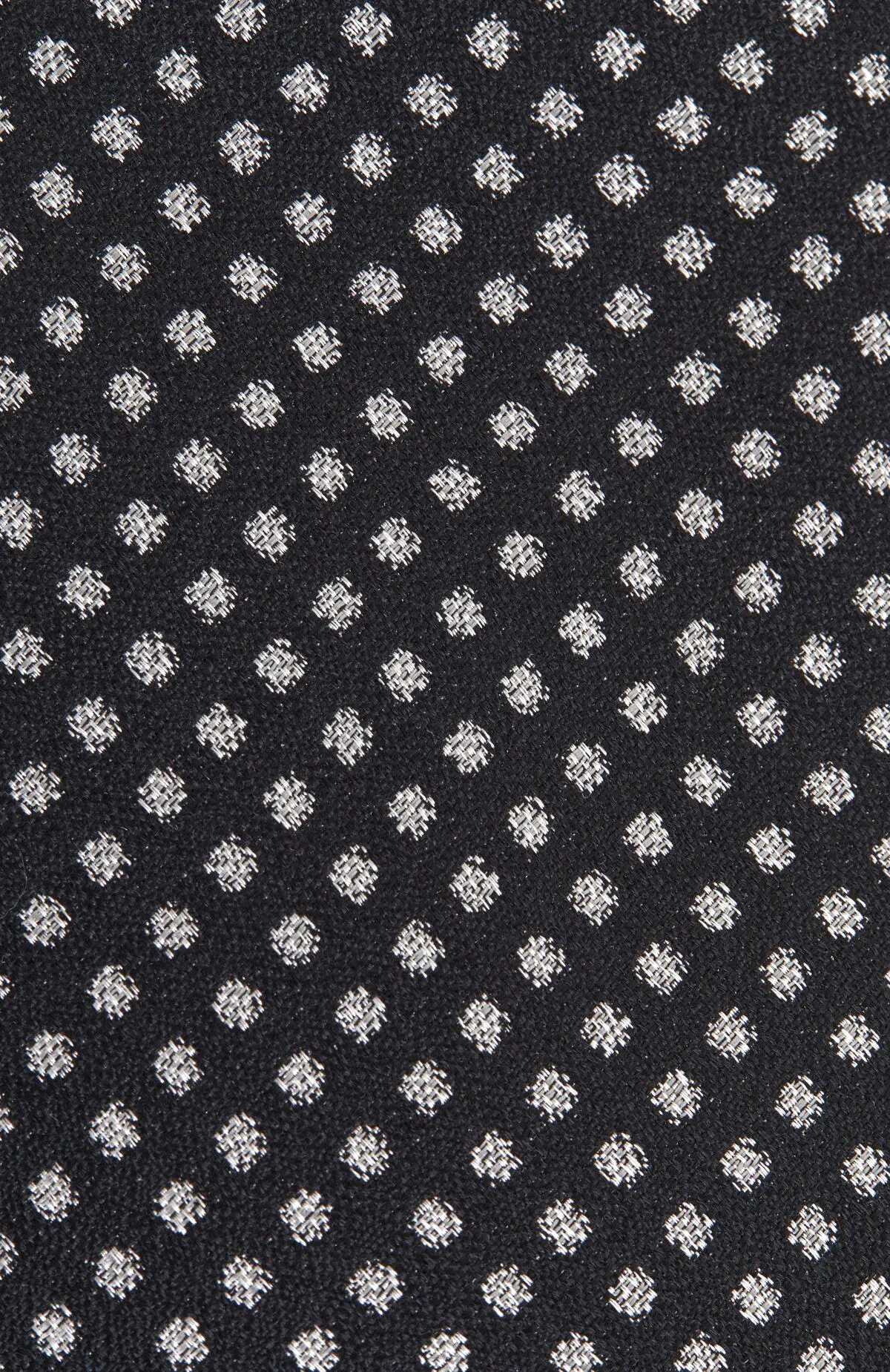 Выполнен из гладкого материала с деликатным блеском и мелким светлым микроузором на тёмном фоне. Плотная фактура уверенно держит форму узла и аккуратно подчёркивает линию лацканов. Сдержанная графика и классическая ширина легко вписываются в деловой гардероб.
