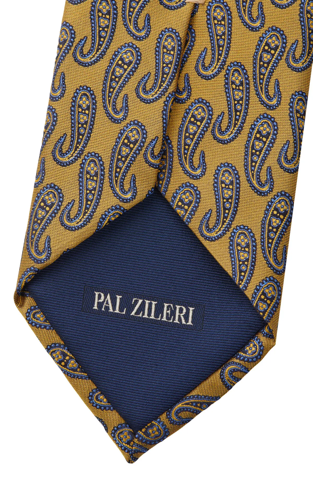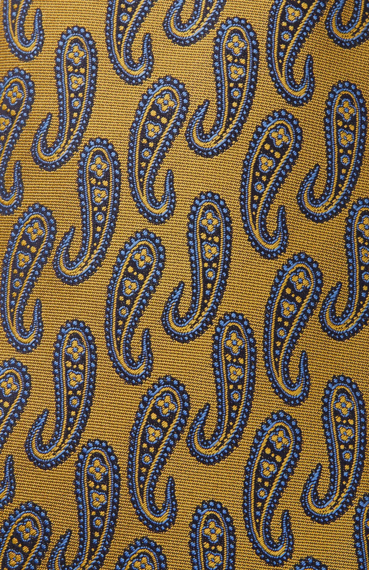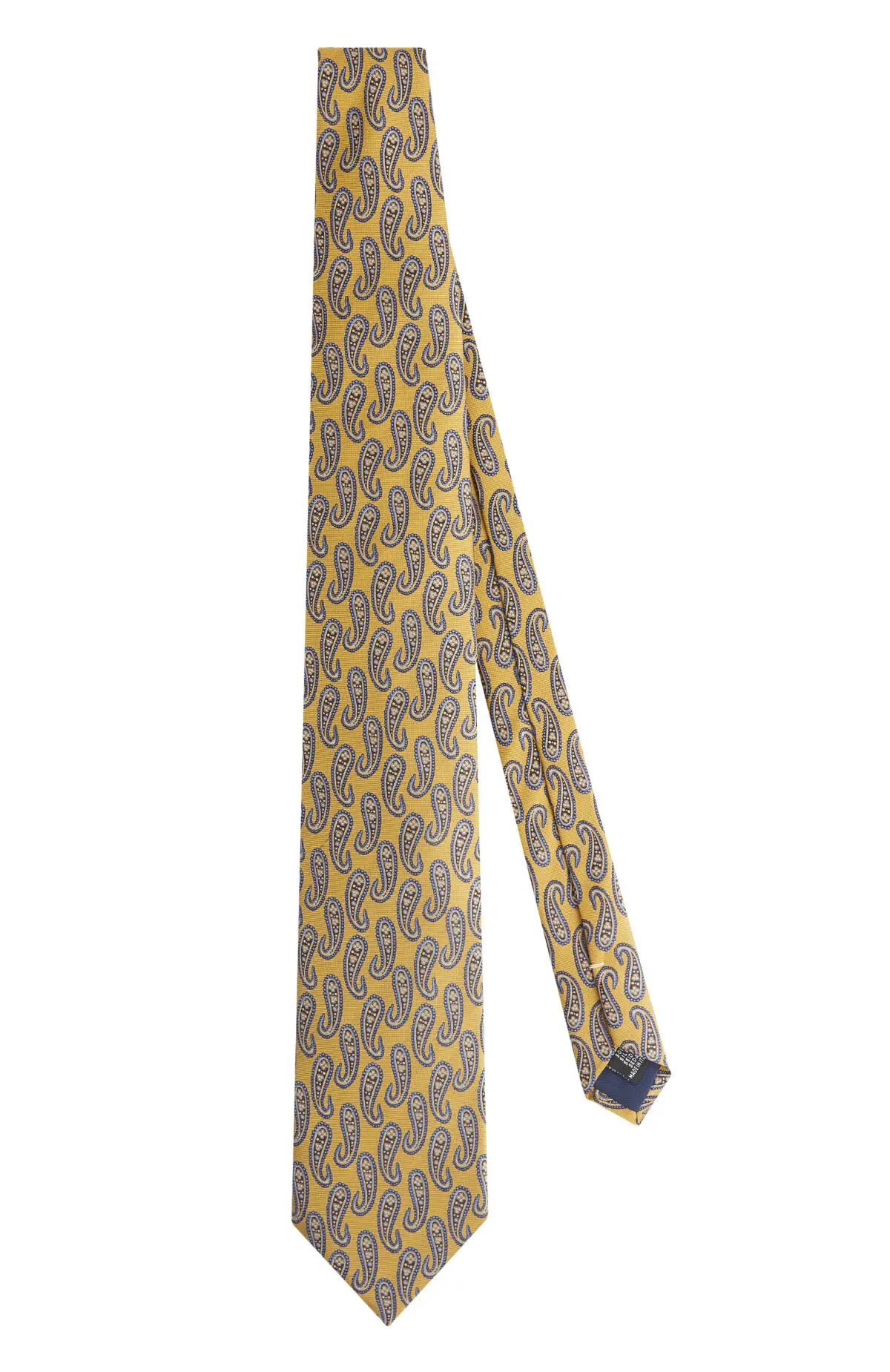 Выполнен из гладкого материала с деликатным блеском и пейсли-узором в тёплой охристо-жёлтой и синей гамме. Плотная фактура уверенно держит форму узла и аккуратно подчёркивает линию лацканов. Выразительный рисунок добавляет сдержанный акцент к костюмам в синем и сером оттенках.