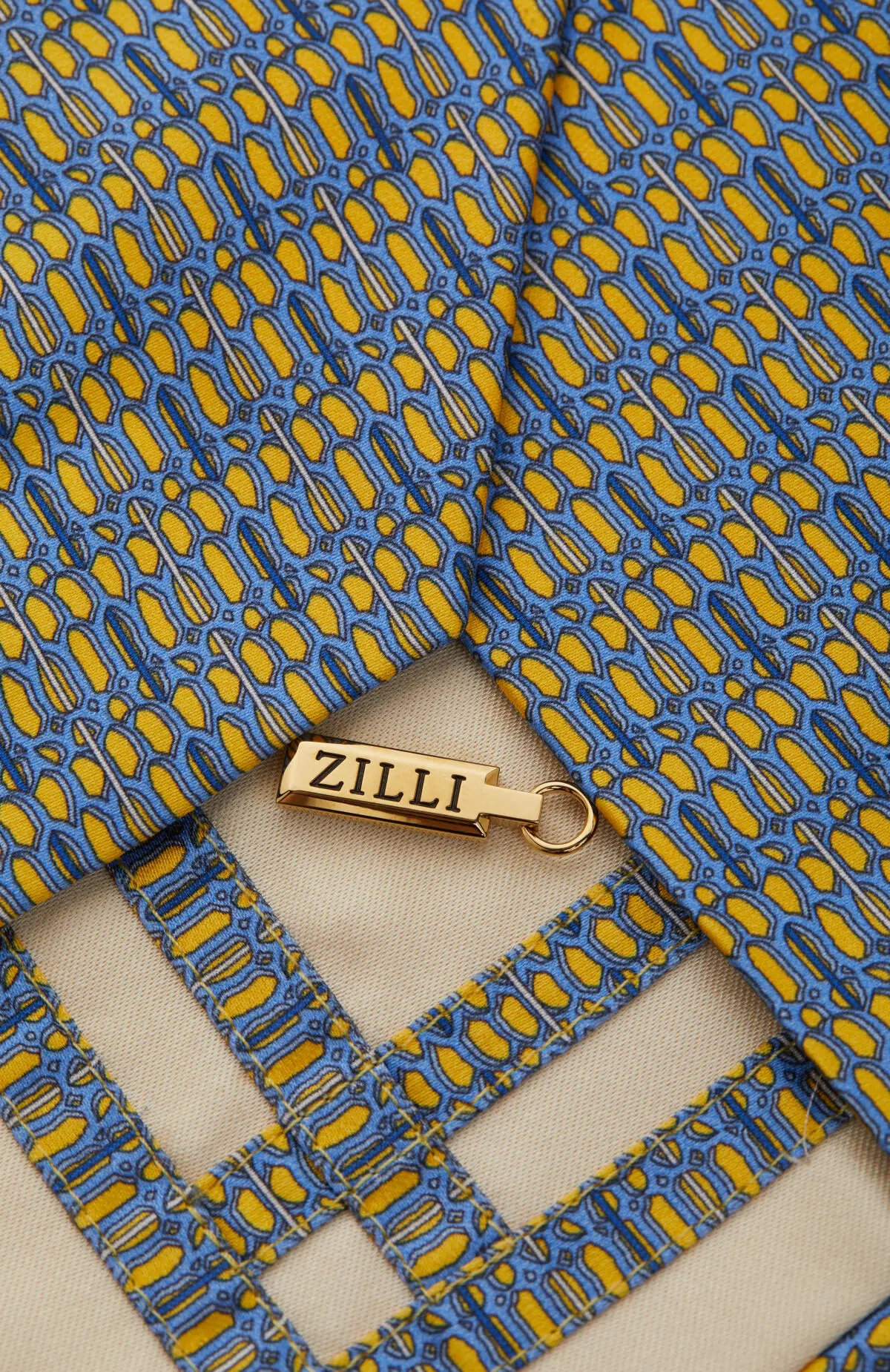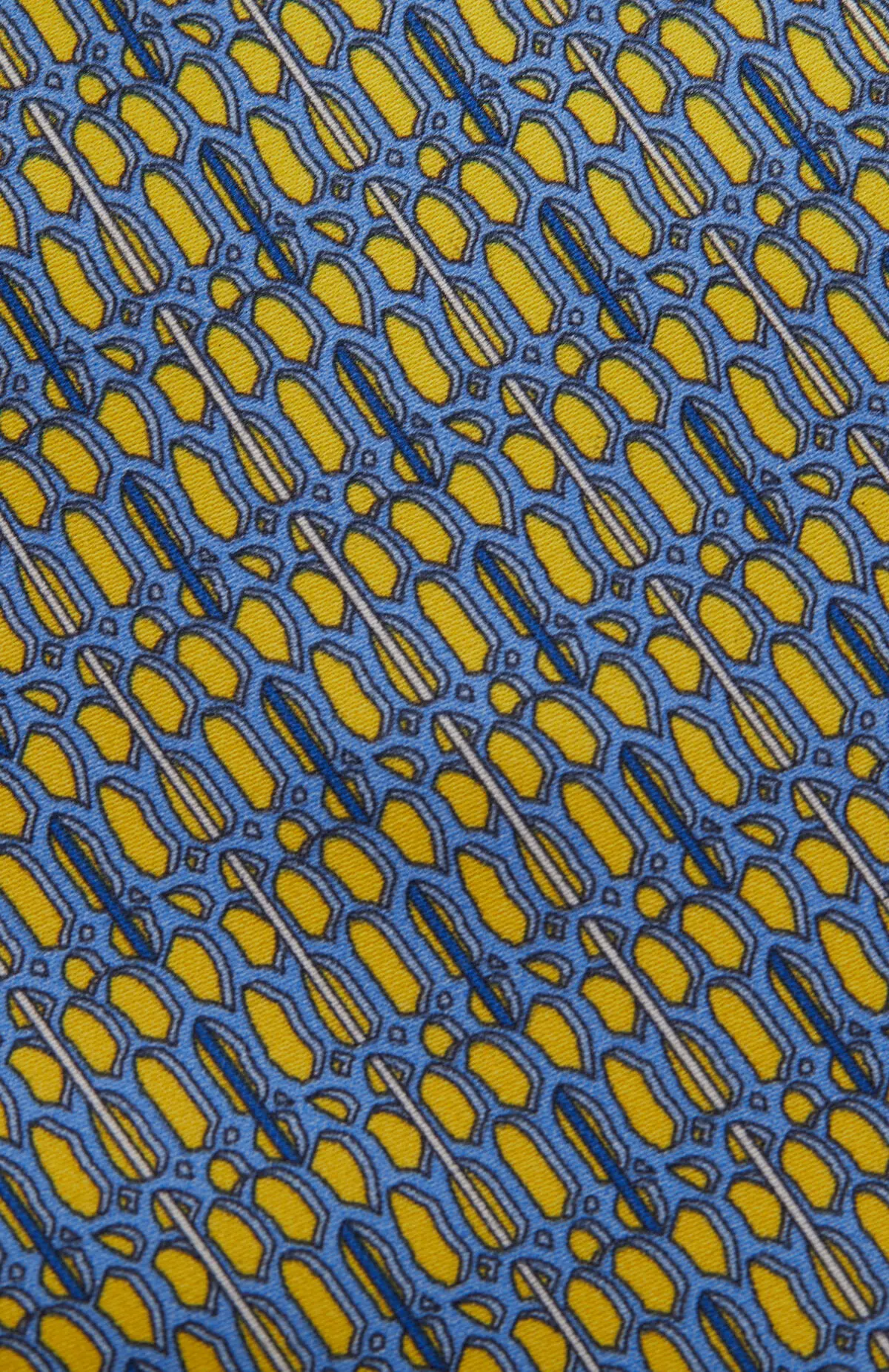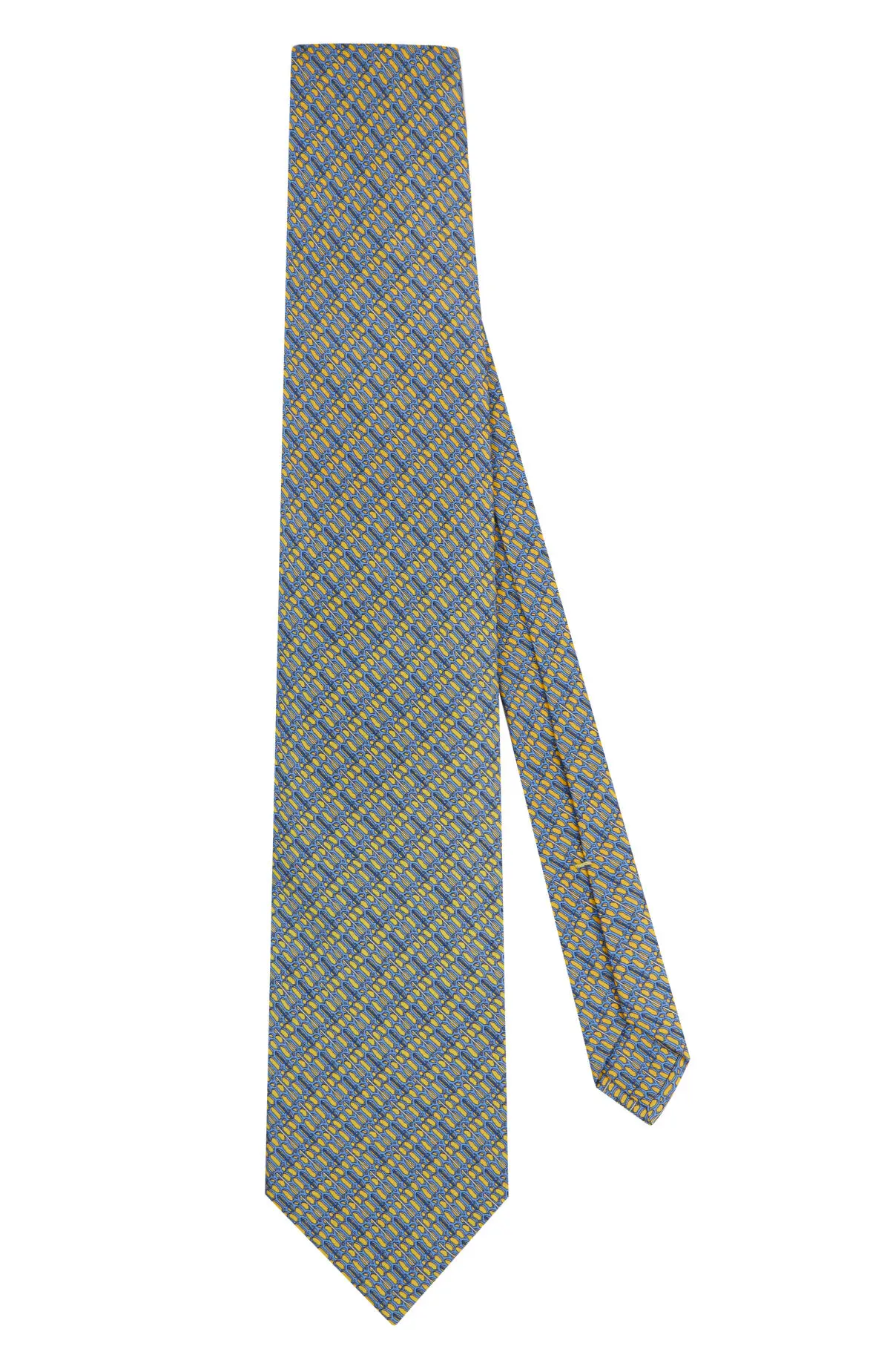 Выполнен из гладкого материала с сатиновым блеском и мелким диагональным узором в сине-жёлтой гамме. Плотная фактура уверенно держит форму узла и подчёркивает линию лацканов. Сдержанная графика добавляет аккуратный акцент к классическим костюмам.