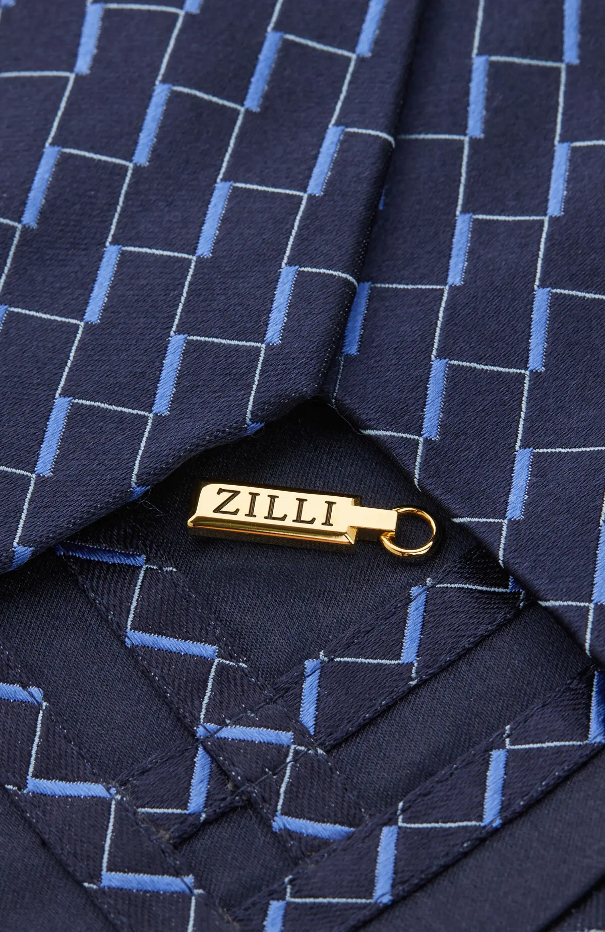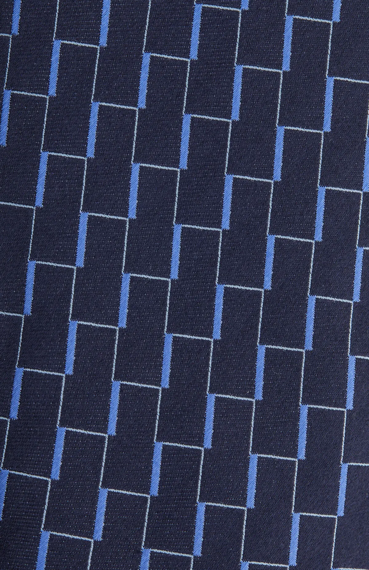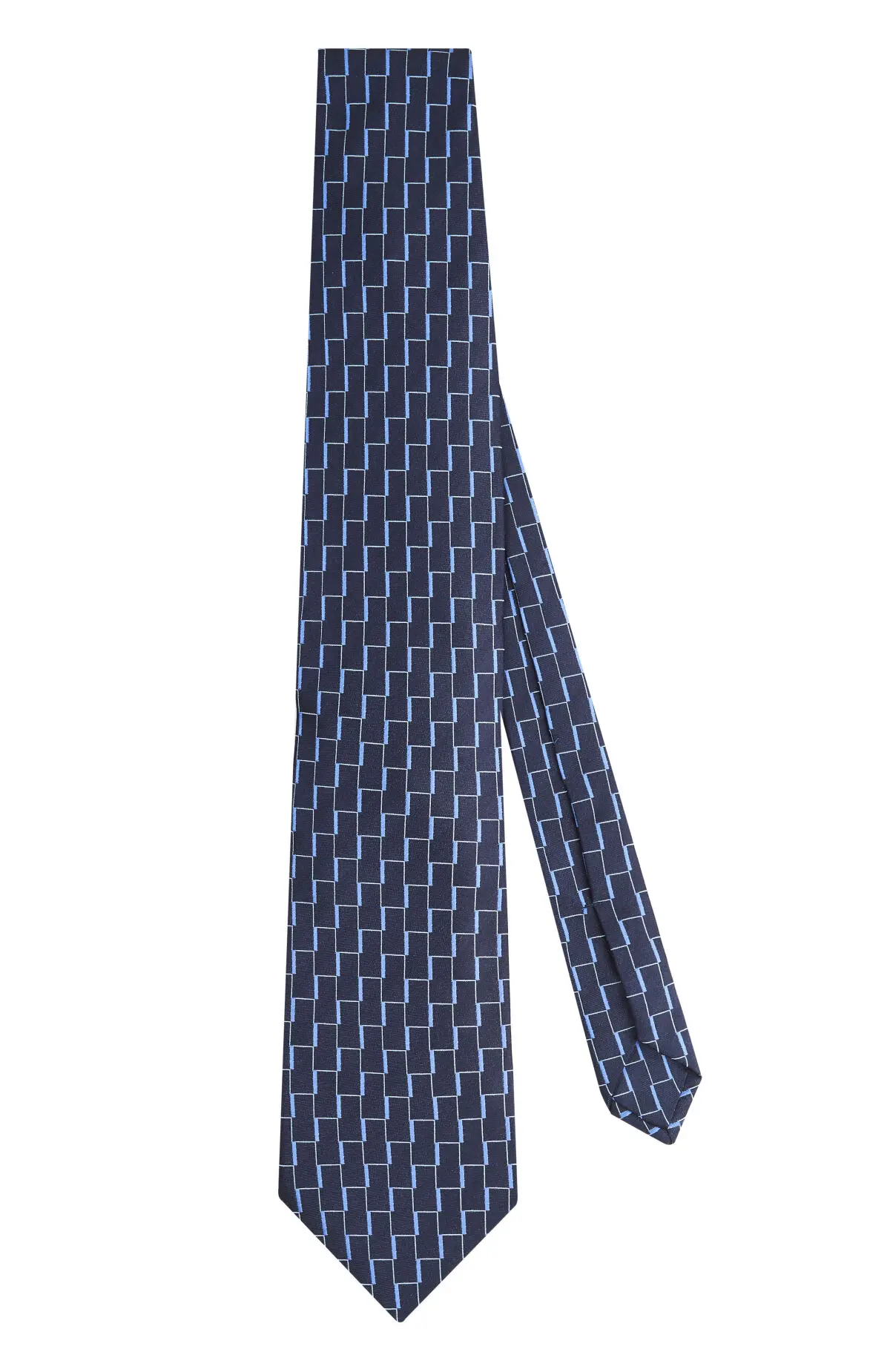 Выполнен из гладкого материала с сатиновым блеском и графичным геометрическим узором в оттенках тёмно-синего и голубого. Плотная фактура уверенно держит форму узла и подчёркивает линию лацканов. Сдержанная палитра с современным рисунком легко сочетается с классическими костюмами.