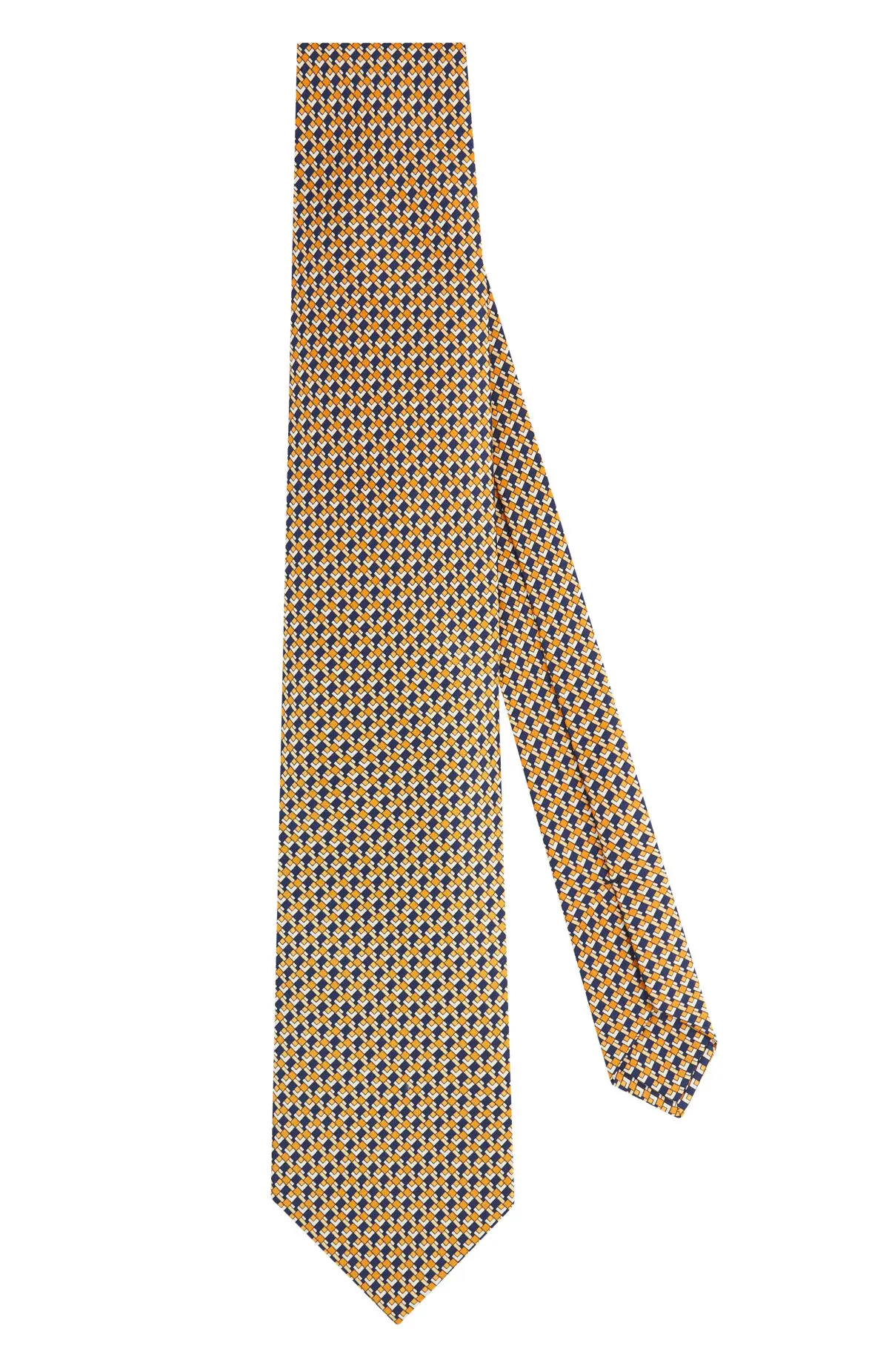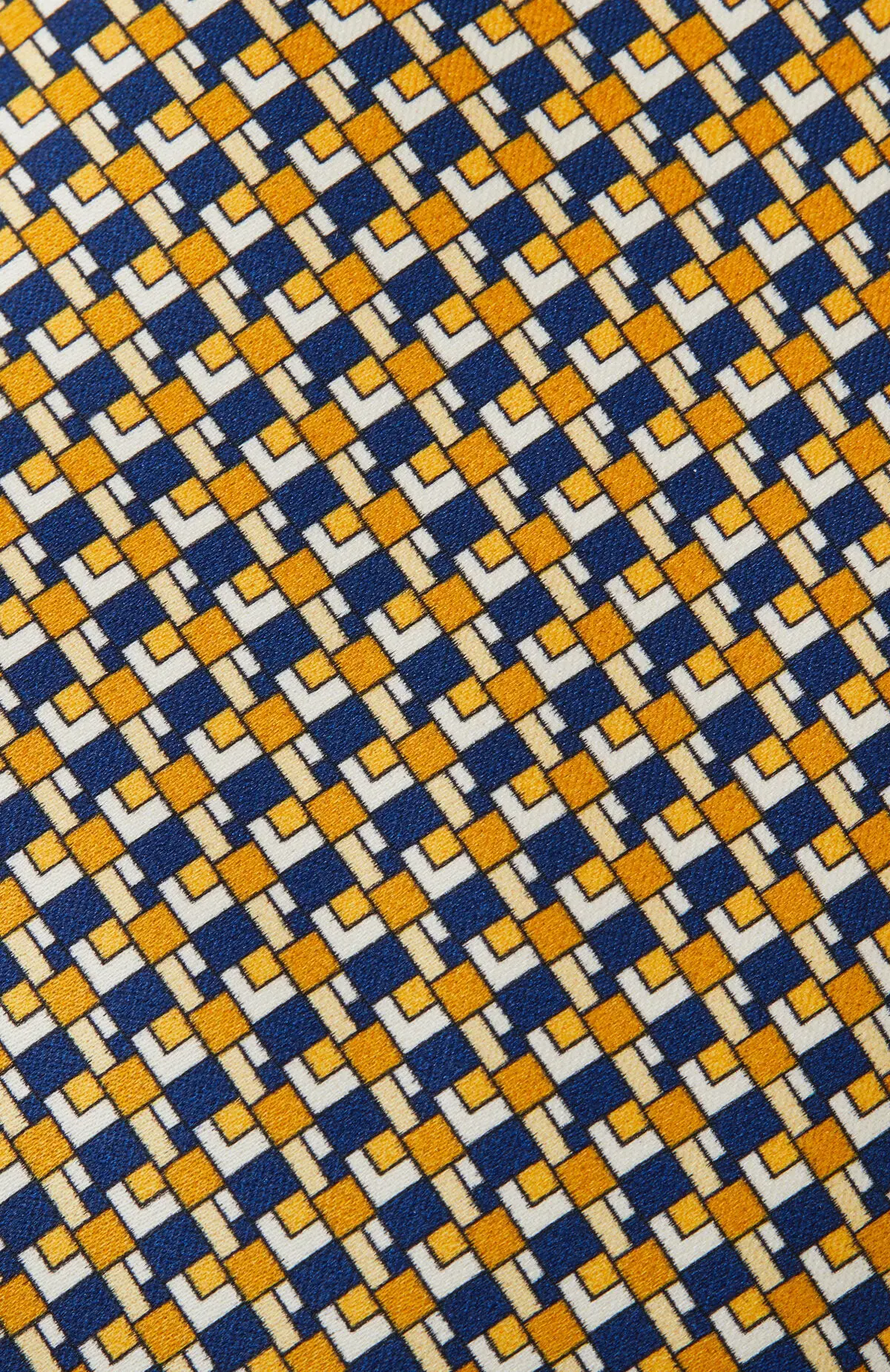 Выполнен из гладкого материала с благородным блеском и микроузором в оттенках охры и синего. Плотная фактура уверенно держит форму узла и подчёркивает линию лацканов. Сдержанная графика придаёт образу акцент и легко сочетается с классическими костюмами.