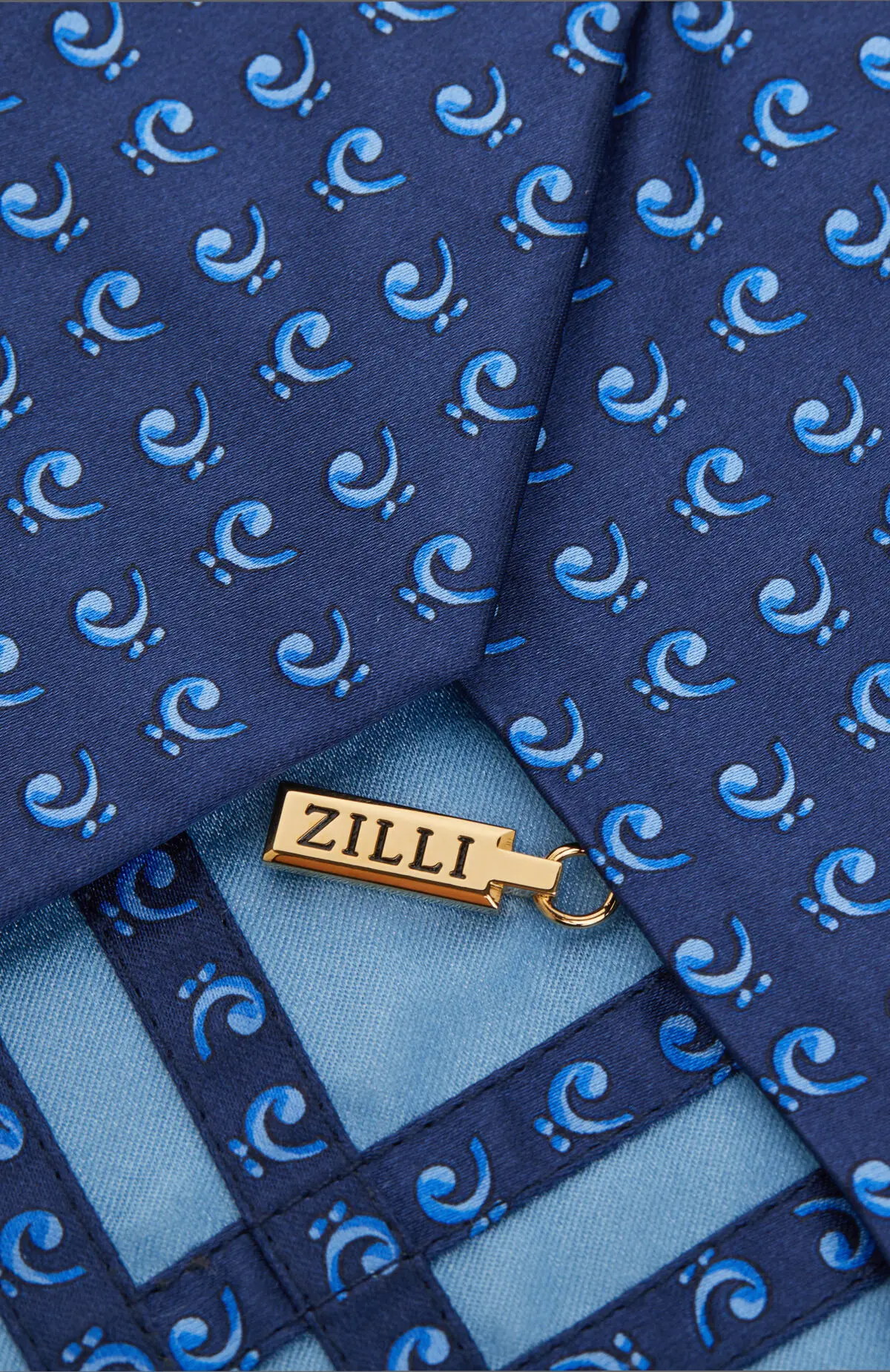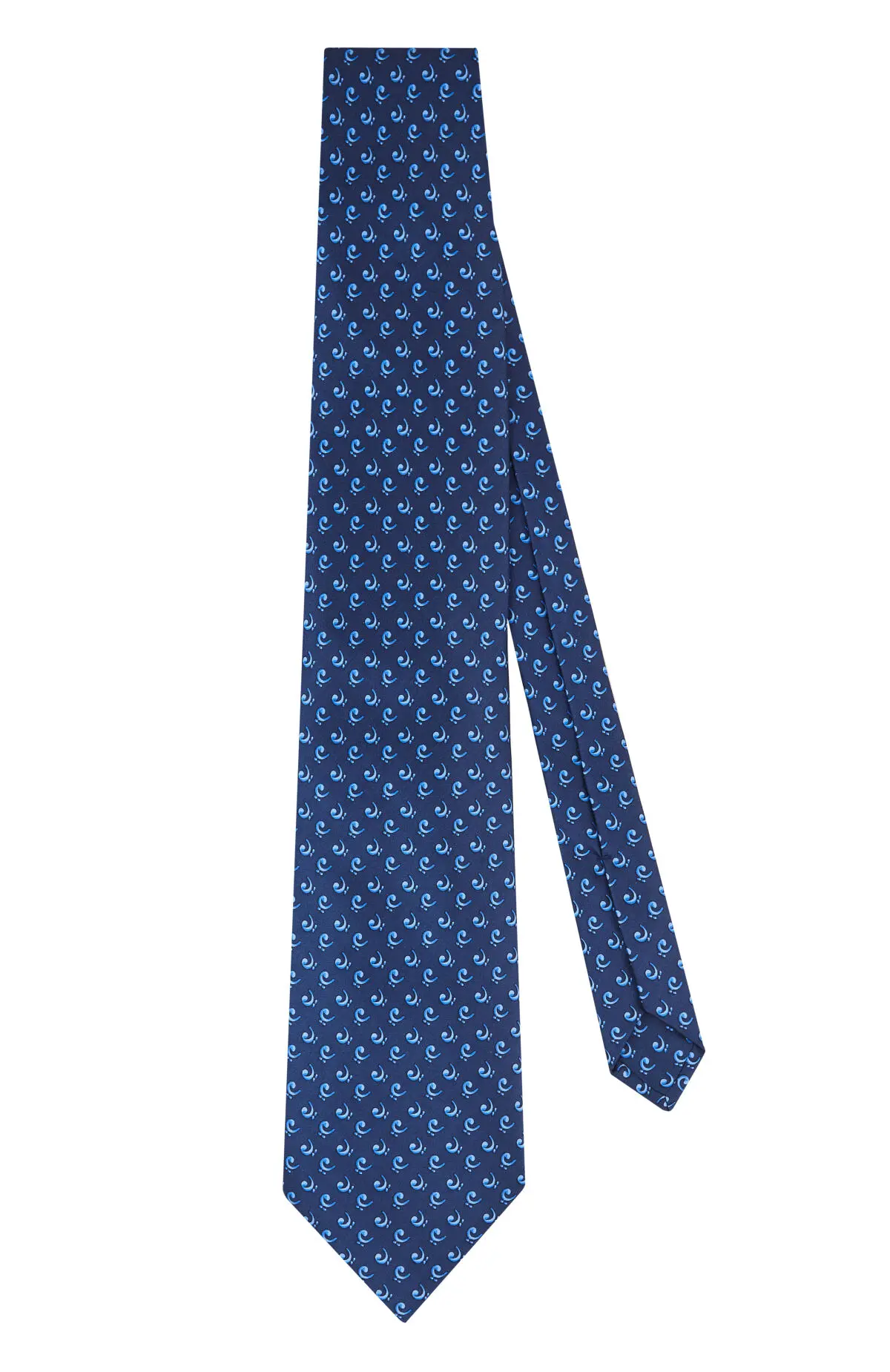 Выполнен из гладкого материала с сатиновым блеском и мелким геометрическим мотивом в оттенках синего. Плотная фактура уверенно держит форму узла и подчёркивает линию лацканов. Сдержанная палитра с аккуратным рисунком легко вписывается в деловой гардероб.