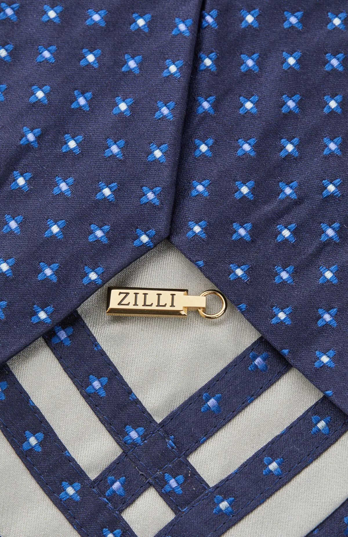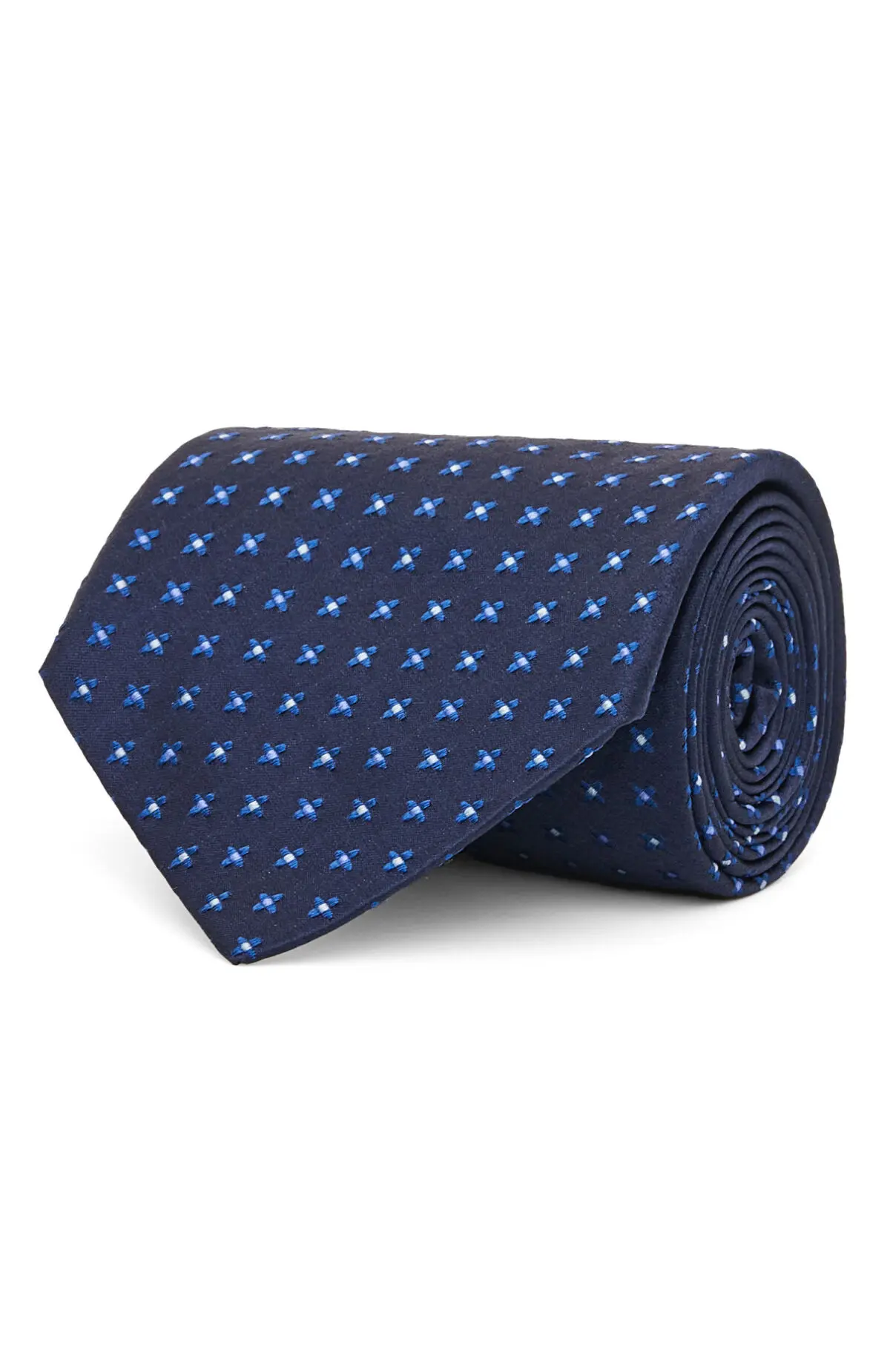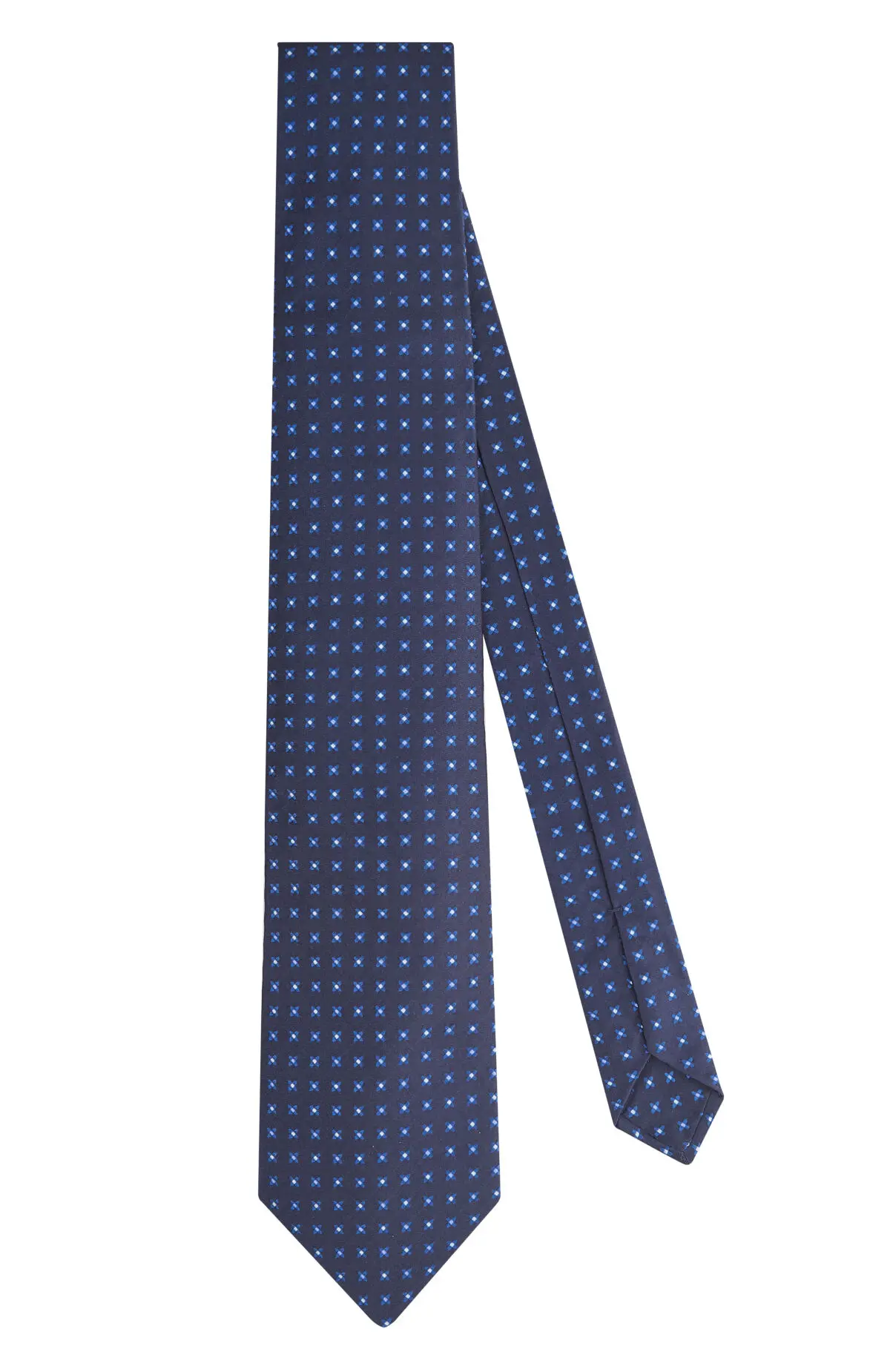 Выполнен из гладкого материала с сатиновым блеском и микроузором в виде небесно-синих крестиков на тёмно-синем фоне. Плотная фактура уверенно держит форму узла и аккуратно подчёркивает линию лацканов. Сдержанная графика добавляет точный акцент к деловым костюмам в синей и серой гамме.