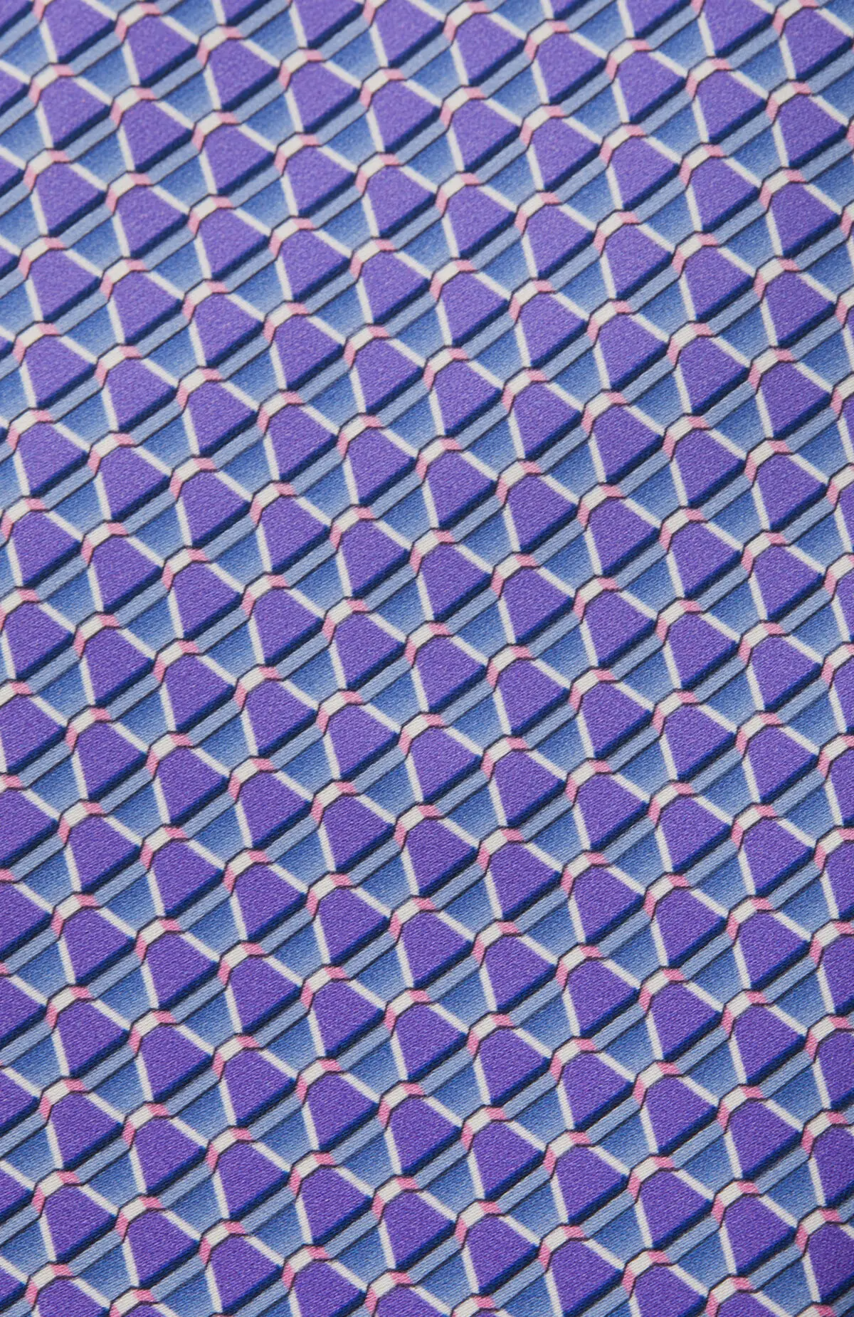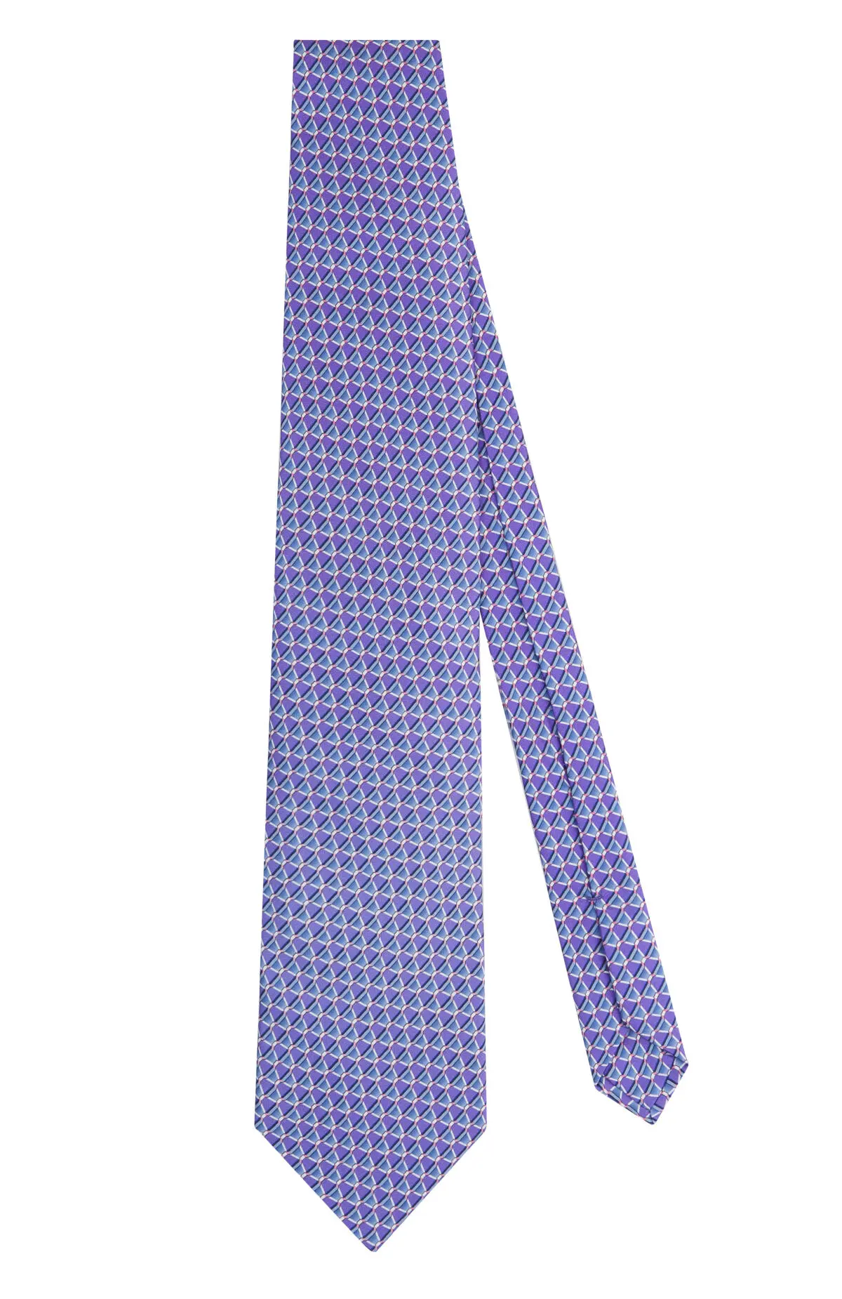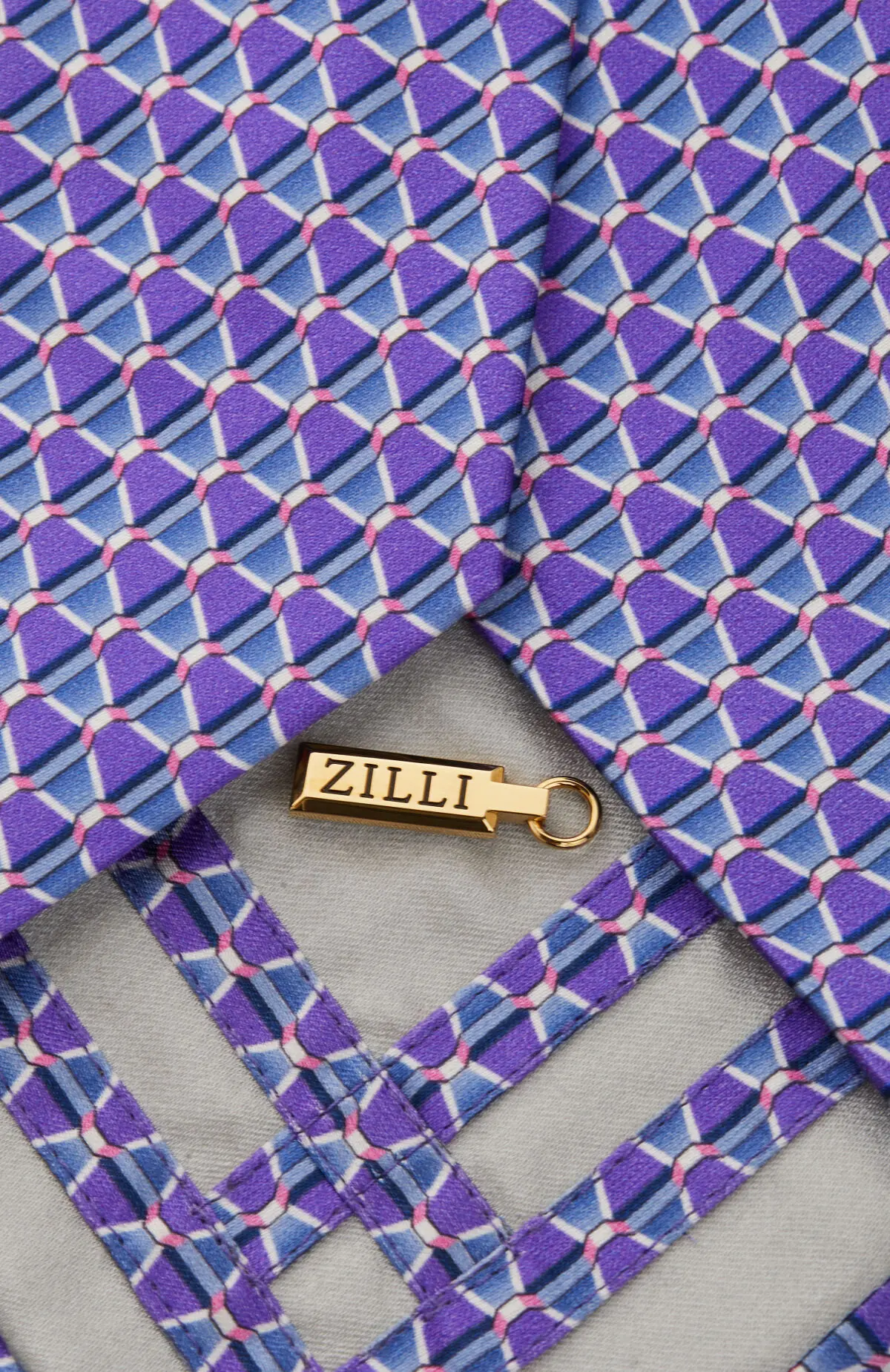 Галстук Zilli выполнен из гладкого шёлка и украшен мелким геометрическим узором в оттенках синего и фиолетового. Классическая ширина и аккуратный заострённый край делают аксессуар уместным как в деловом, так и в торжественном гардеробе. Яркий, но ненавязчивый рисунок легко сочетается с однотонными рубашками и костюмами.