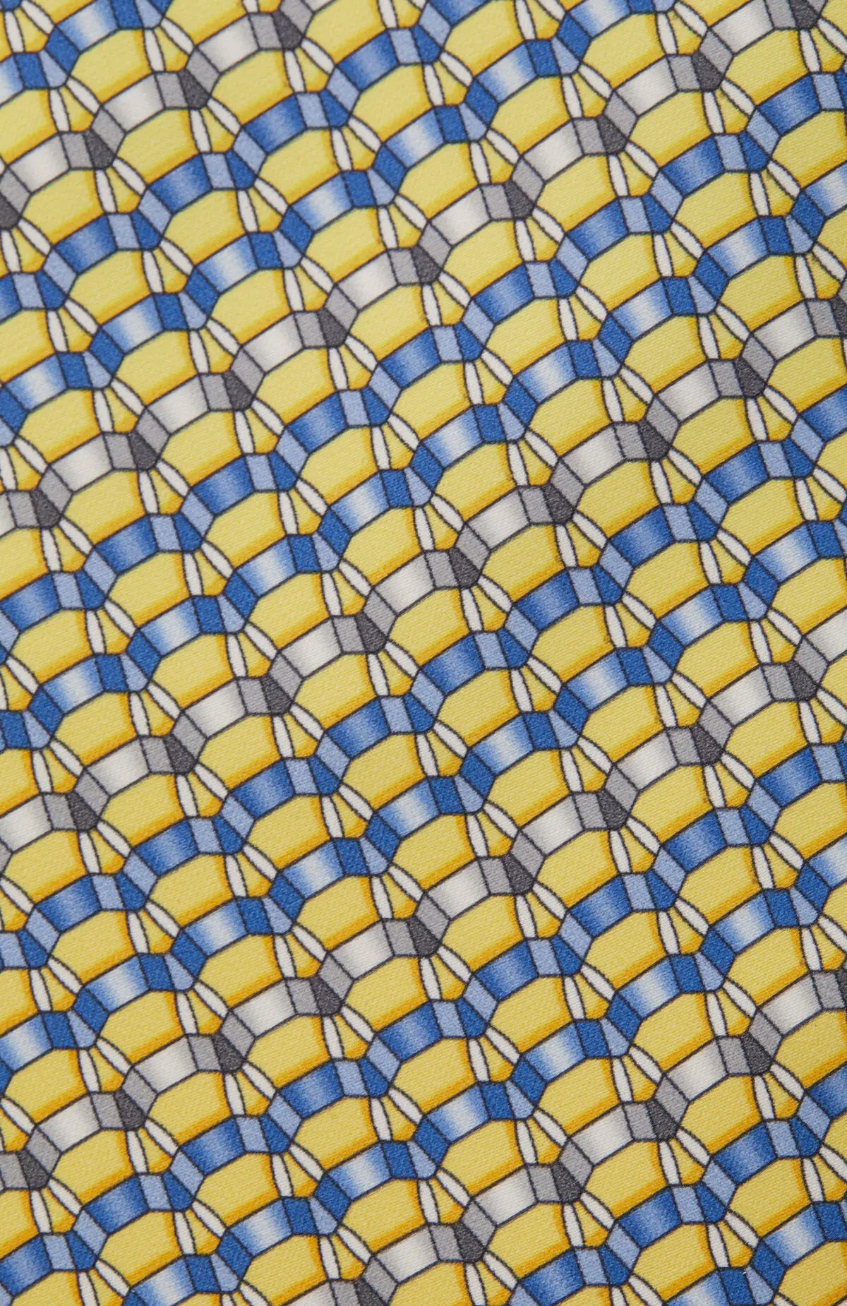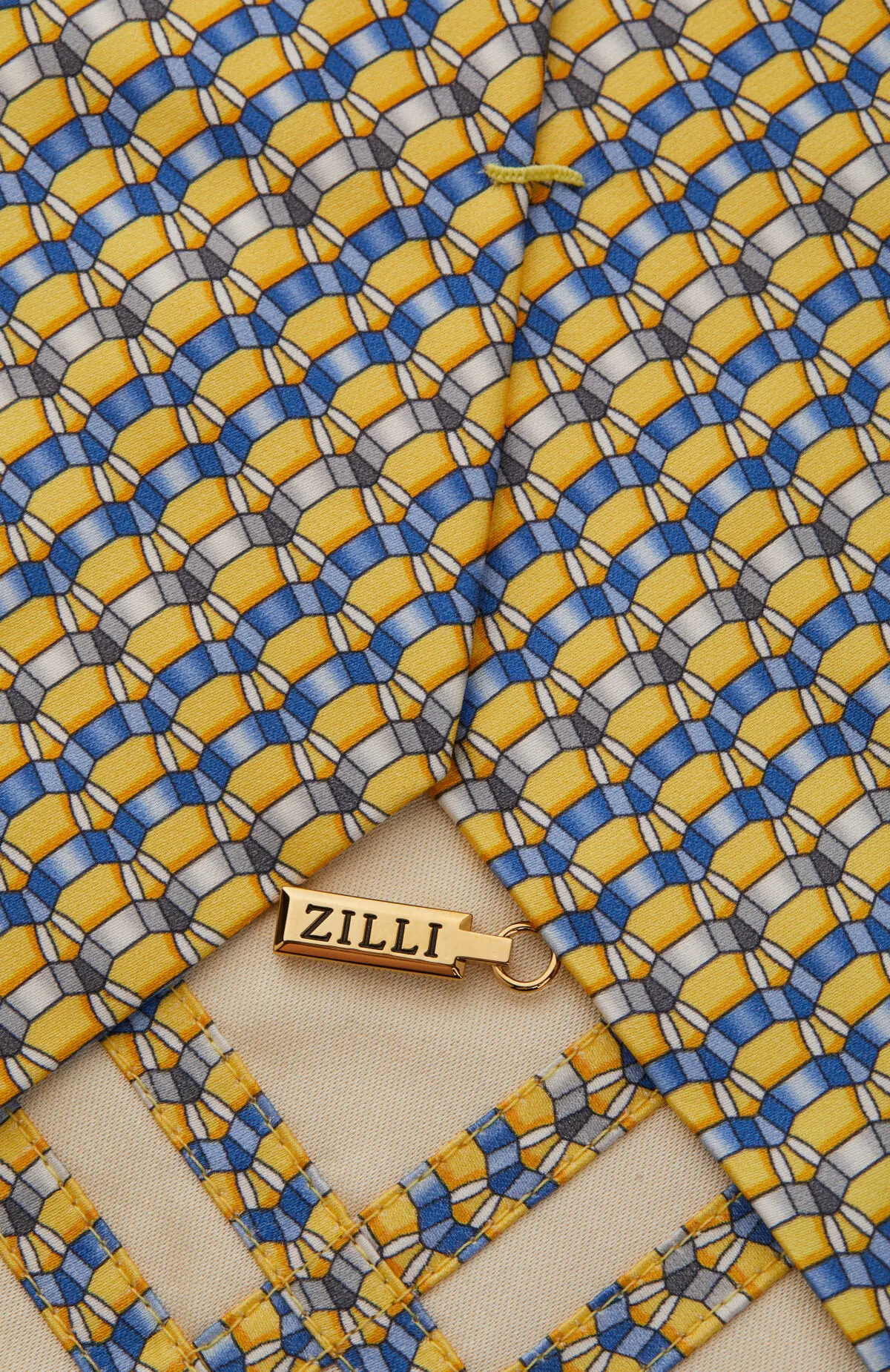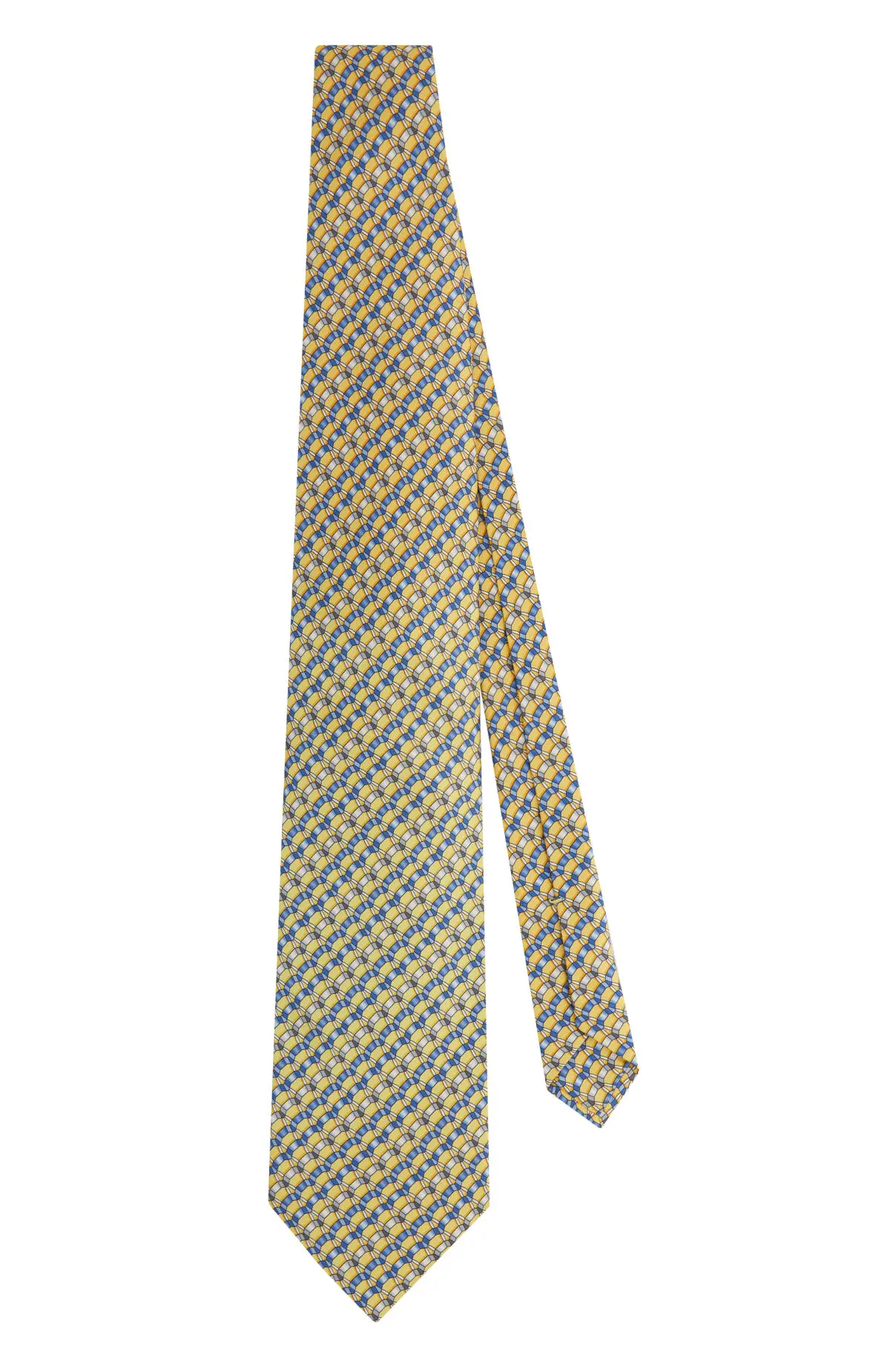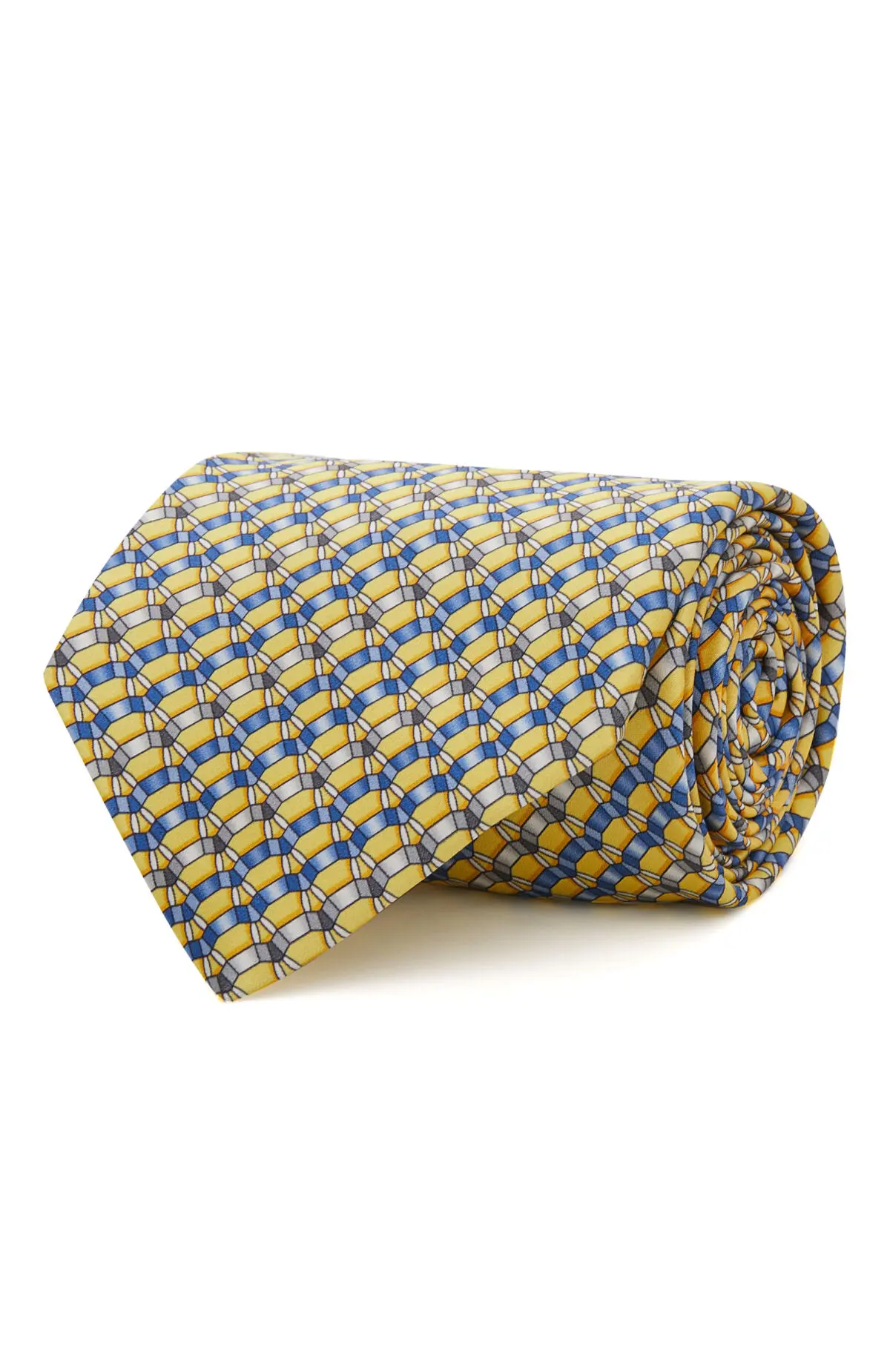 Выполнен из гладкого материала с сатиновым блеском и ритмичным микроузором в жёлто-синей гамме. Плотная фактура уверенно держит форму узла и подчёркивает линию лацканов. Сбалансированная ширина и выразительная графика добавляют аккуратный акцент к классическим костюмам.