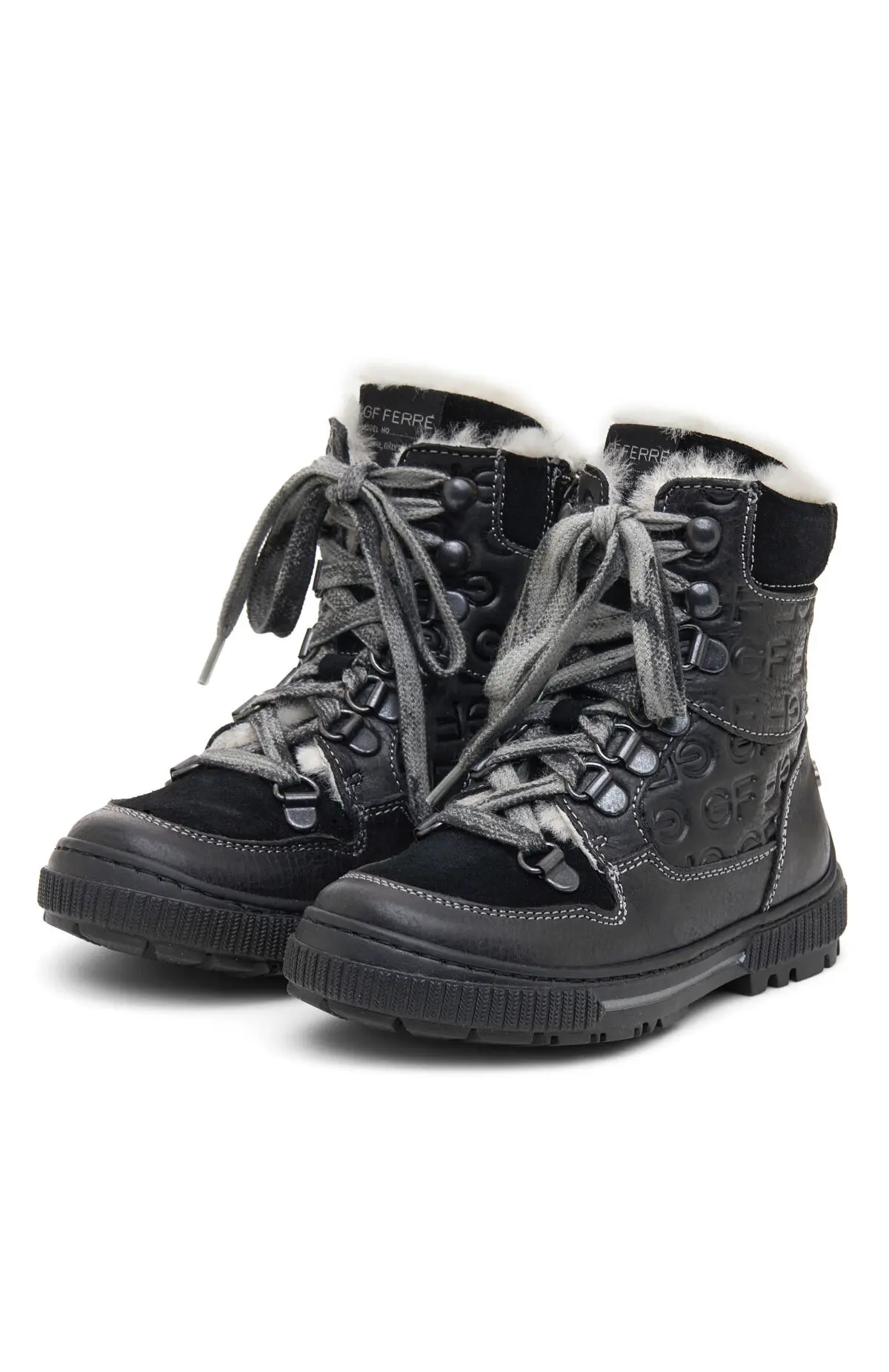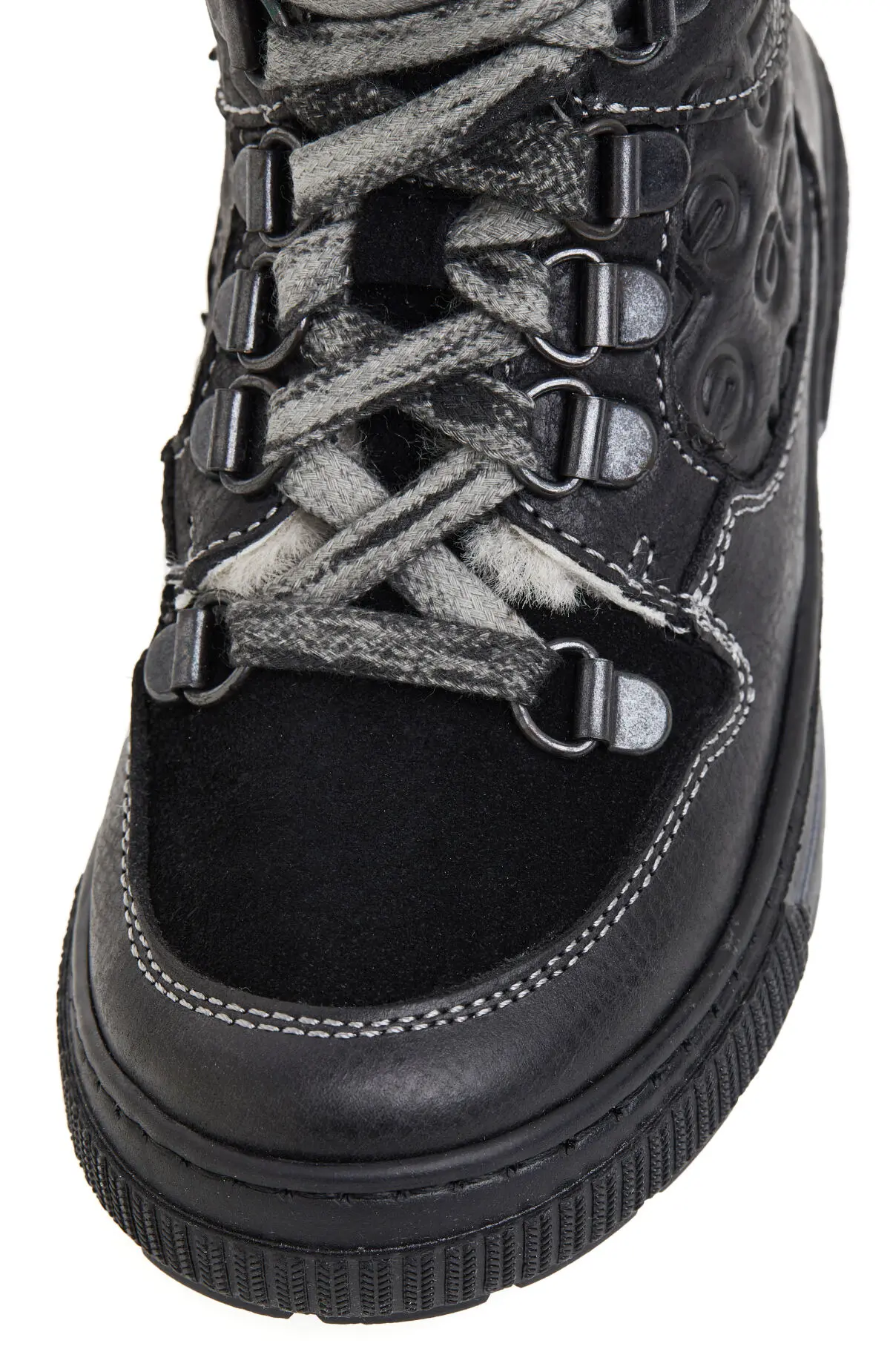 Выполнены из гладкой кожи и замши с тиснёными панелями, подчеркнутыми контрастной отстрочкой. Тёплая меховая подкладка, шнуровка на металлической фурнитуре и боковая молния обеспечивают комфортное прилегание и удобство надевания. Рельефная резиновая подошва гарантирует уверенное сцепление и устойчивую посадку в повседневном ритме.