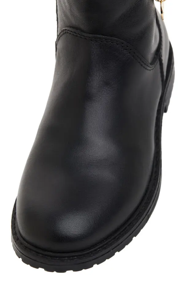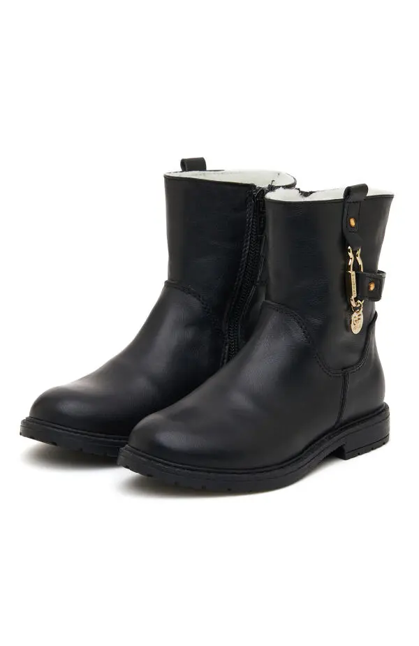 Выполнены из гладкой чёрной кожи с мягким матовым блеском. Верх дополнен ремешком с золотистыми подвесками, что подчёркивает лаконичный силуэт. Утеплённая внутренняя отделка обеспечивает комфортное прилегание, а рельефная подошва подходит для повседневного города.