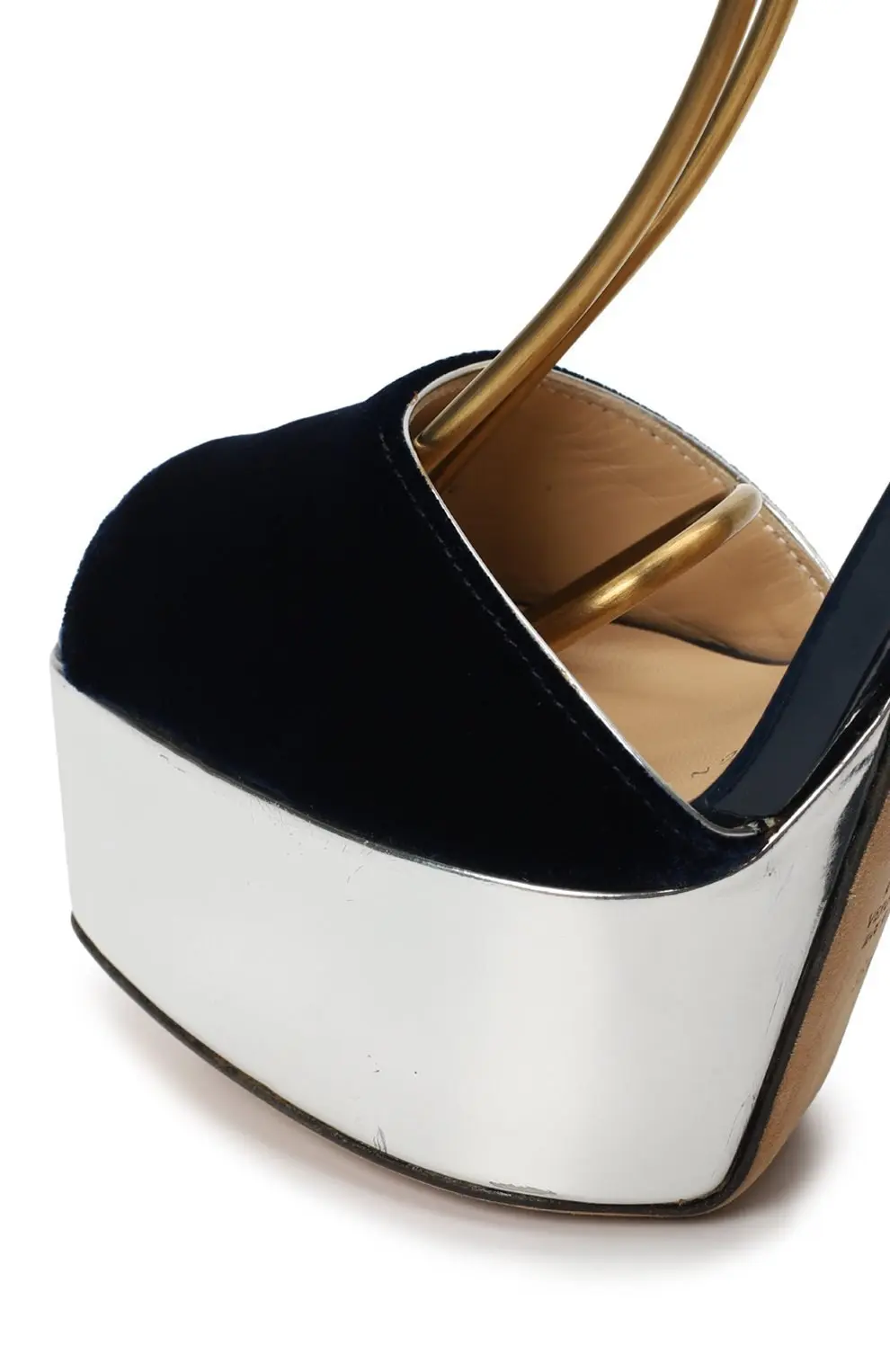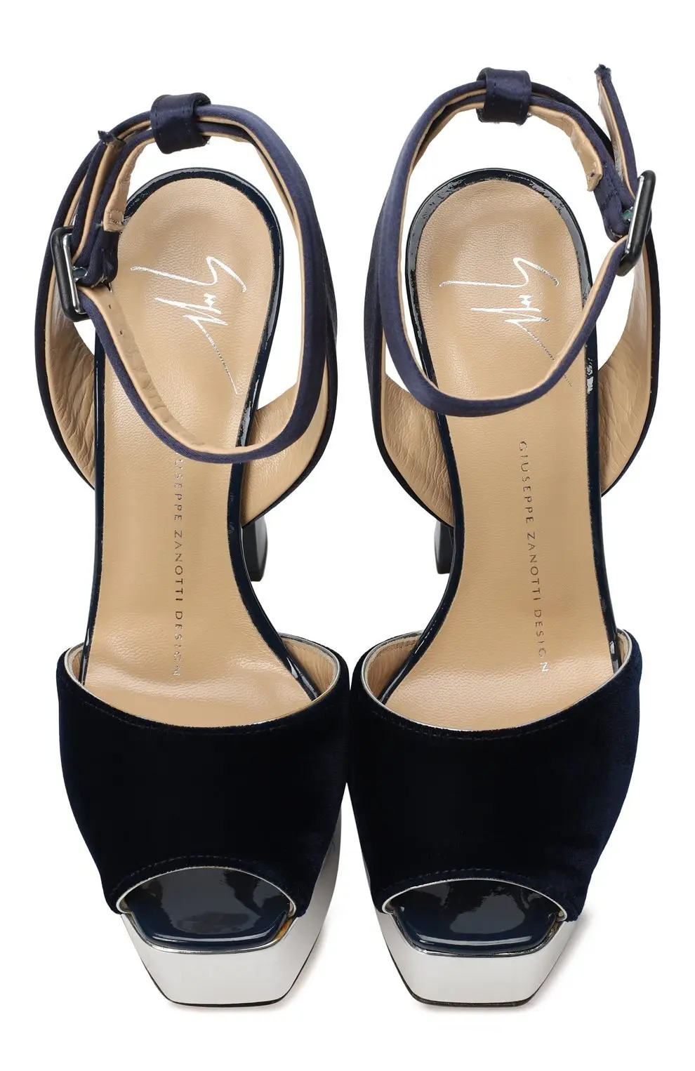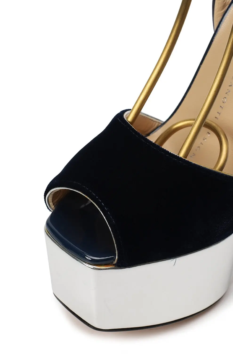Босоножки Tarifa от Giuseppe Zanotti Design — эффектная модель, сочетающая гламур и современную архитектурную эстетику. Контраст текстур — бархатного верха и зеркальной платформы — создаёт выразительный визуальный акцент. Широкий устойчивый каблук и ремешок из атласа с пряжкой обеспечивают комфорт и надёжную фиксацию. Идеальный выбор для вечерних выходов и модных образов в духе 1970-х.