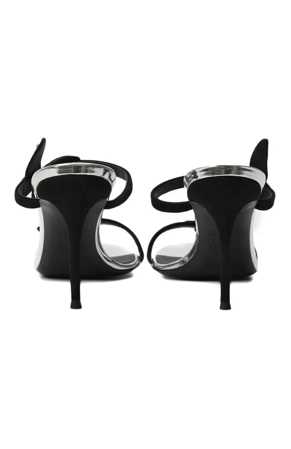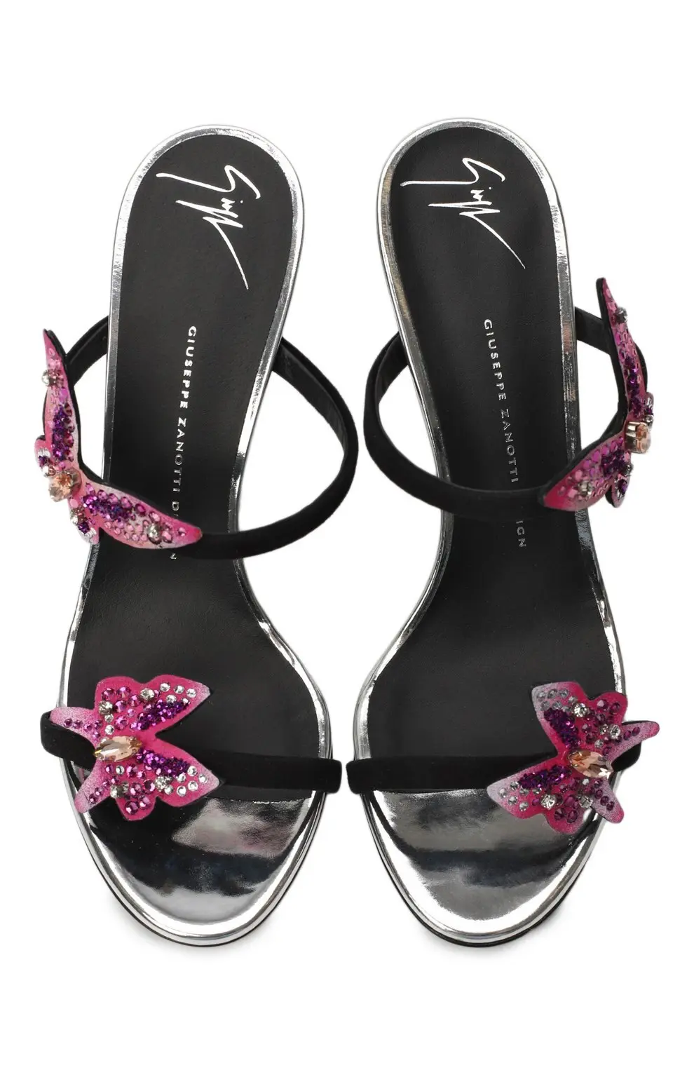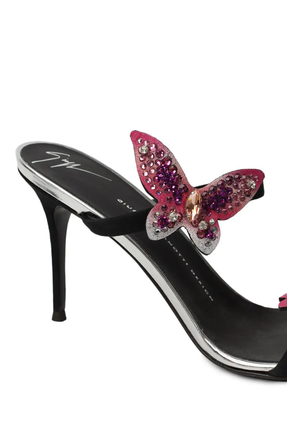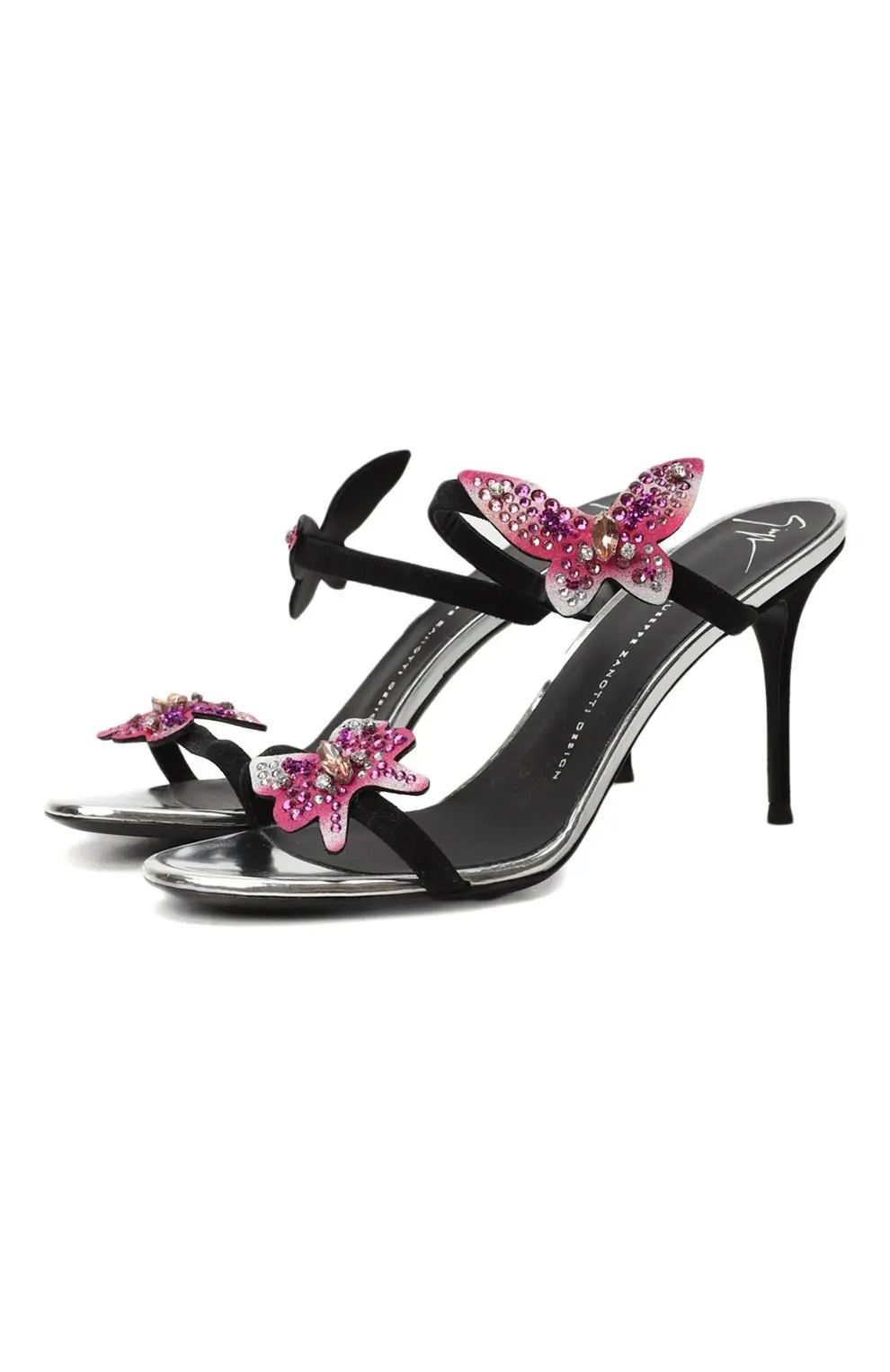 Мюли Giuseppe Zanotti Design — изысканная пара на тонком каблуке-шпильке, созданная для особых случаев. Дизайн украшен объемными бабочками, инкрустированными розовыми и прозрачными кристаллами, которые добавляют образу игривый блеск и утонченную женственность. Контраст черного бархата и сияющего декора подчеркивает характерный для бренда баланс между гламуром и элегантностью.