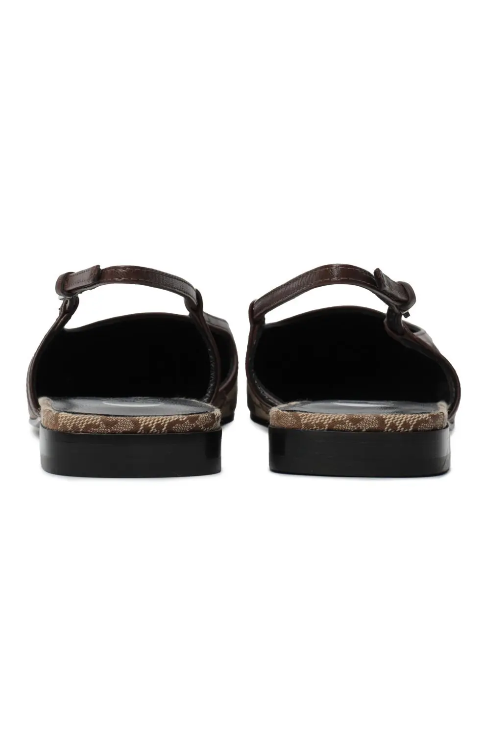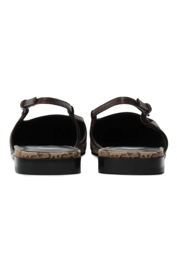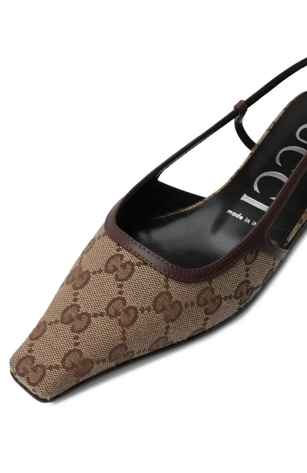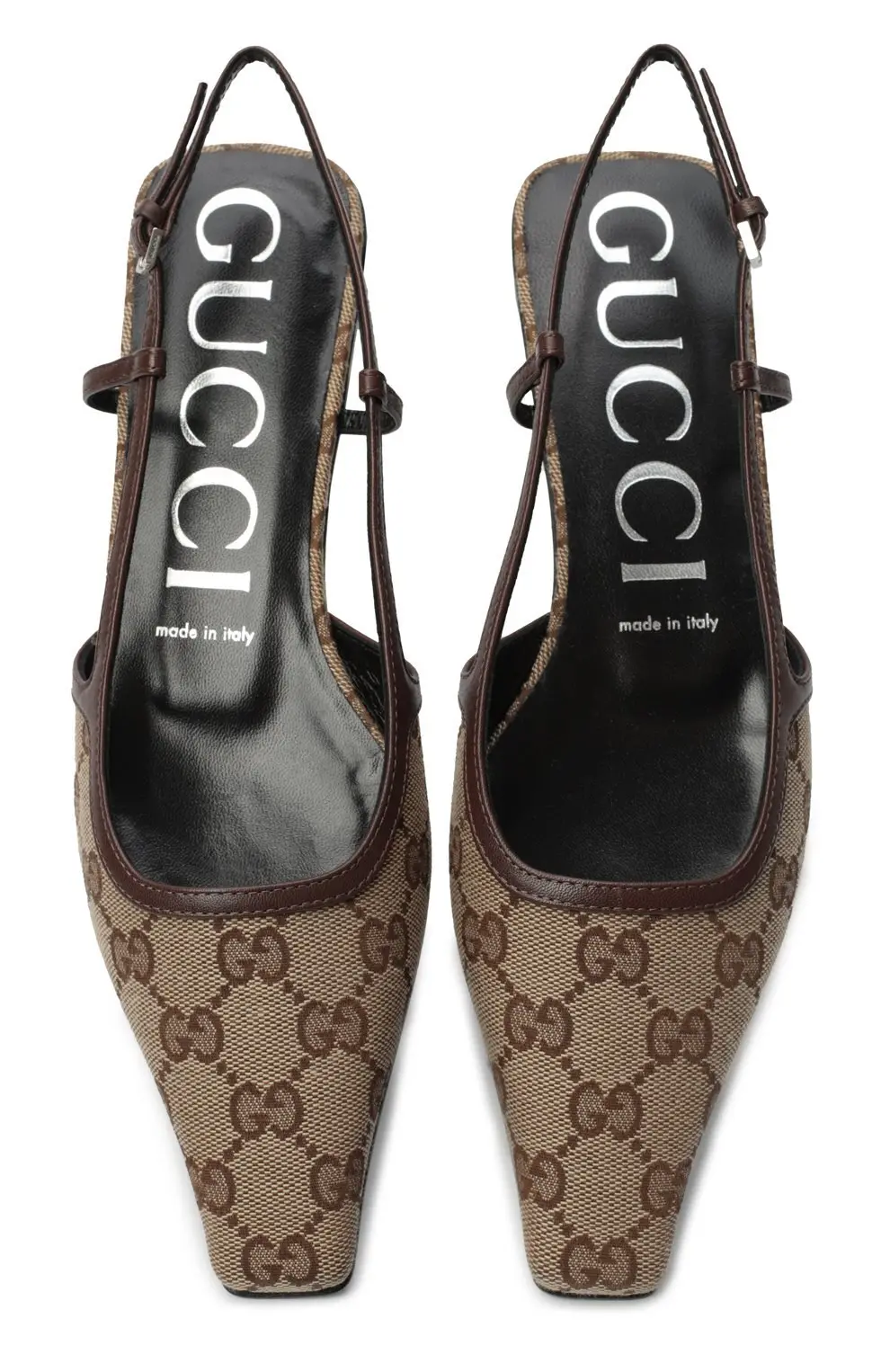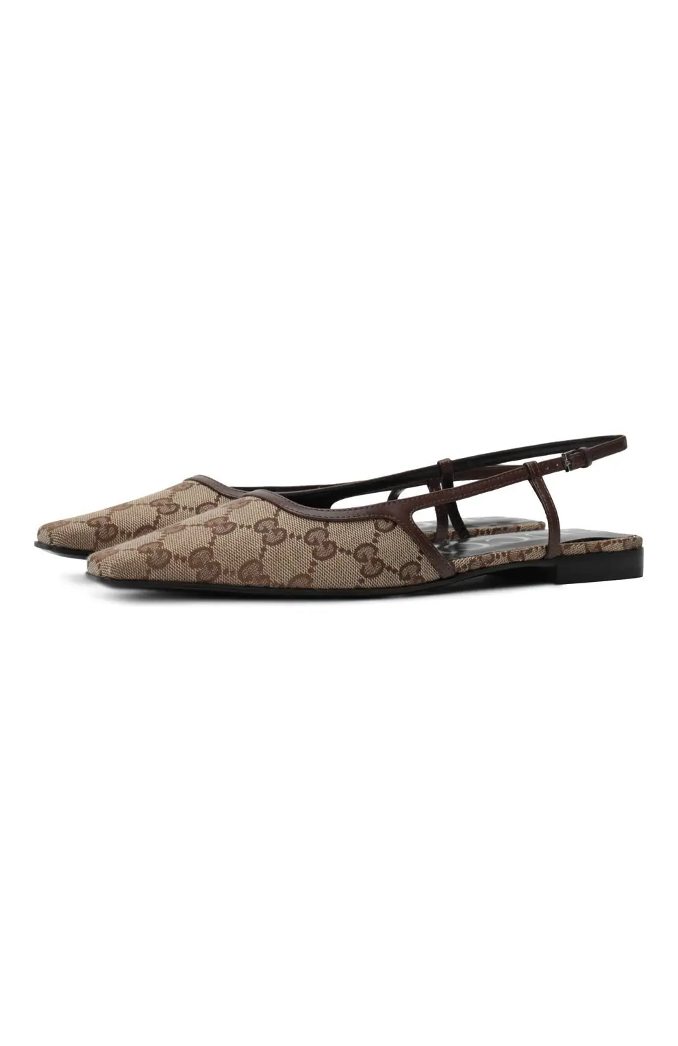 Туфли Gucci GG на низком ходу, выполненные в фирменном бежево-коричневом канвасе с культовым монограммным узором. Модель с заострённым мыском и открытой пяткой на тонком ремешке, что придаёт обуви лёгкость и утончённость.