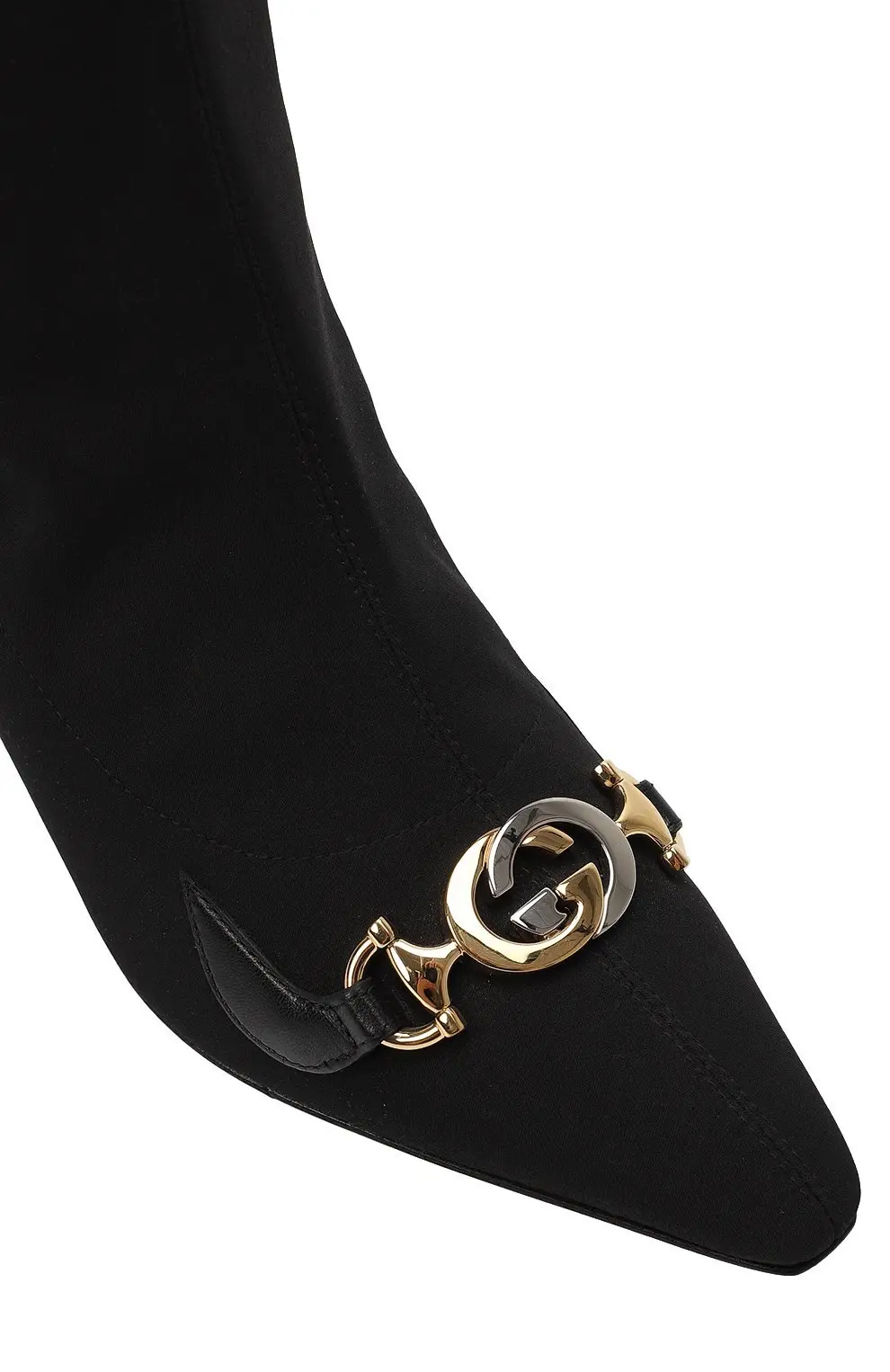 Ботильоны Gucci — элегантная интерпретация классики, выполненная в лаконичном черном цвете. Модель из мягкого текстиля плотно облегает ногу, подчеркивая изящество силуэта. Заострённый мысок украшен культовым металлическим декором Horsebit в золотисто-серебристом тоне, который добавляет утончённости и фирменного стиля дома Gucci. Тонкий каблук-шпилька средней высоты визуально вытягивает силуэт, сохраняя комфорт при носке. Эти ботильоны идеально дополнят как деловые, так и вечерние образы, придавая им безупречную элегантность.
