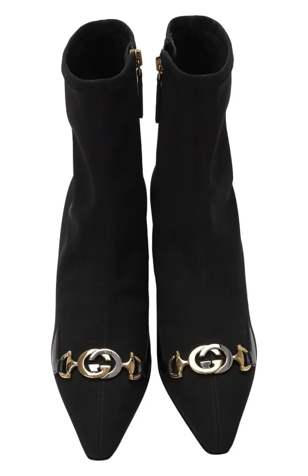 Ботильоны Gucci — элегантная интерпретация классики, выполненная в лаконичном черном цвете. Модель из мягкого текстиля плотно облегает ногу, подчеркивая изящество силуэта. Заострённый мысок украшен культовым металлическим декором Horsebit в золотисто-серебристом тоне, который добавляет утончённости и фирменного стиля дома Gucci. Тонкий каблук-шпилька средней высоты визуально вытягивает силуэт, сохраняя комфорт при носке. Эти ботильоны идеально дополнят как деловые, так и вечерние образы, придавая им безупречную элегантность.