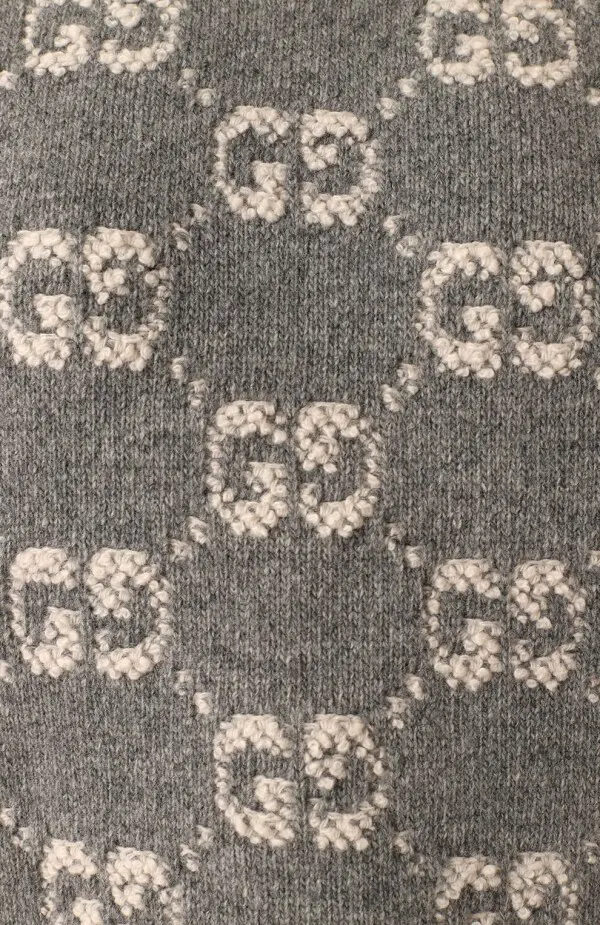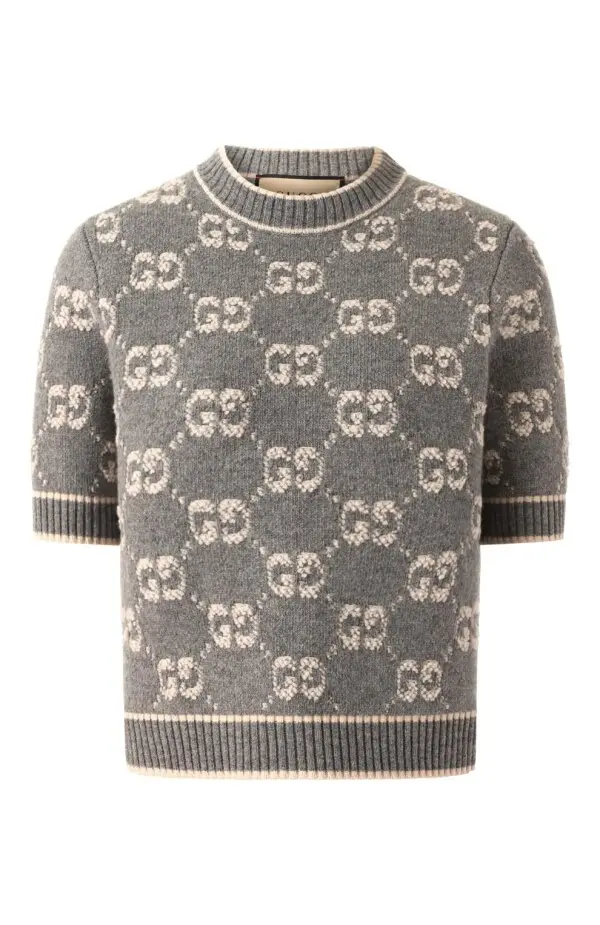 Джемпер Gucci из шерсти. Модель с коротким рукавом выполнена в сером цвете с фирменным жаккардовым узором GG. Эластичная вязка по вороту, рукавам и низу придаёт комфорт и завершённость силуэту. Тёплый и стильный вариант для повседневных образов в холодное время года.