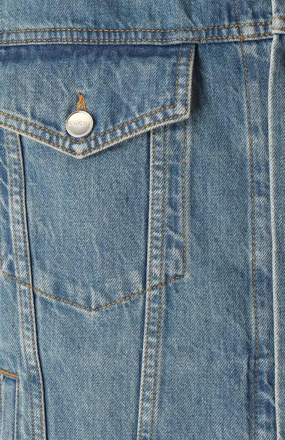 Джинсовая куртка Gucci выполнена из голубого денима с эффектом лёгкого винтажного выцветания. Классический крой с отложным воротником и нагрудными карманами на клапанах дополнен логотипом GG на плече. Универсальная вещь, подходящая как для повседневных, так и для стильных городских образов.