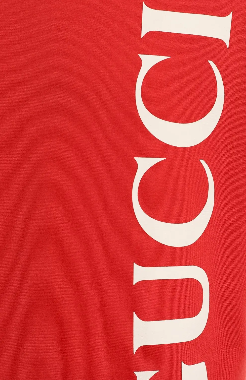 Хлопковая футболка Gucci выполнена из мягкого джерси ярко-красного оттенка. Модель украшена крупным вертикальным логотипом бренда контрастного белого цвета, придающим образу графичность и современный акцент. Прямой крой и классический круглый вырез обеспечивают комфорт и универсальность в повседневных луках.
