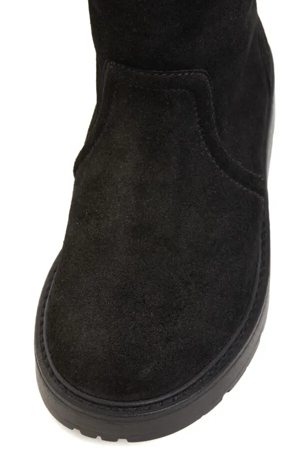 Лаконичные сапоги из мягкой чёрной замши с фирменными петельками-веб сзади. Тёплая меховая подкладка и лёгкая рифлёная подошва обеспечивают комфорт и уверенное сцепление в холодный сезон. Удобная средняя высота голенища легко сочетается с джинсами и повседневными платьями. Отличный выбор для стильных прогулок зимой.