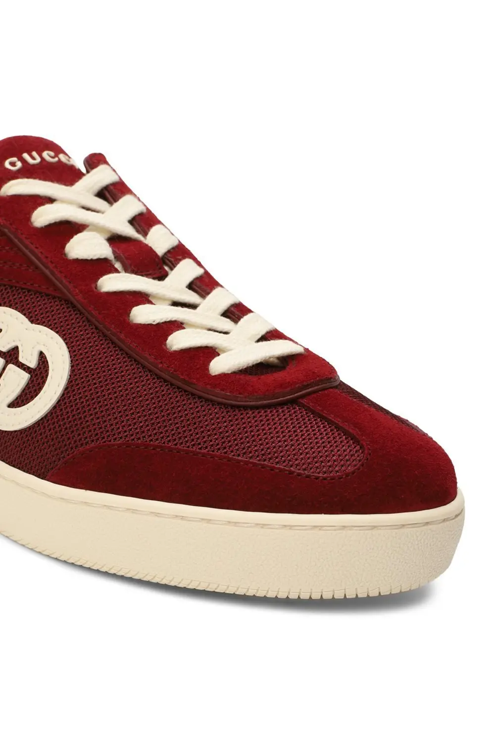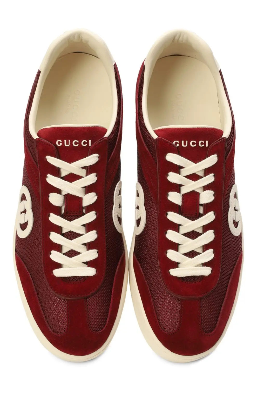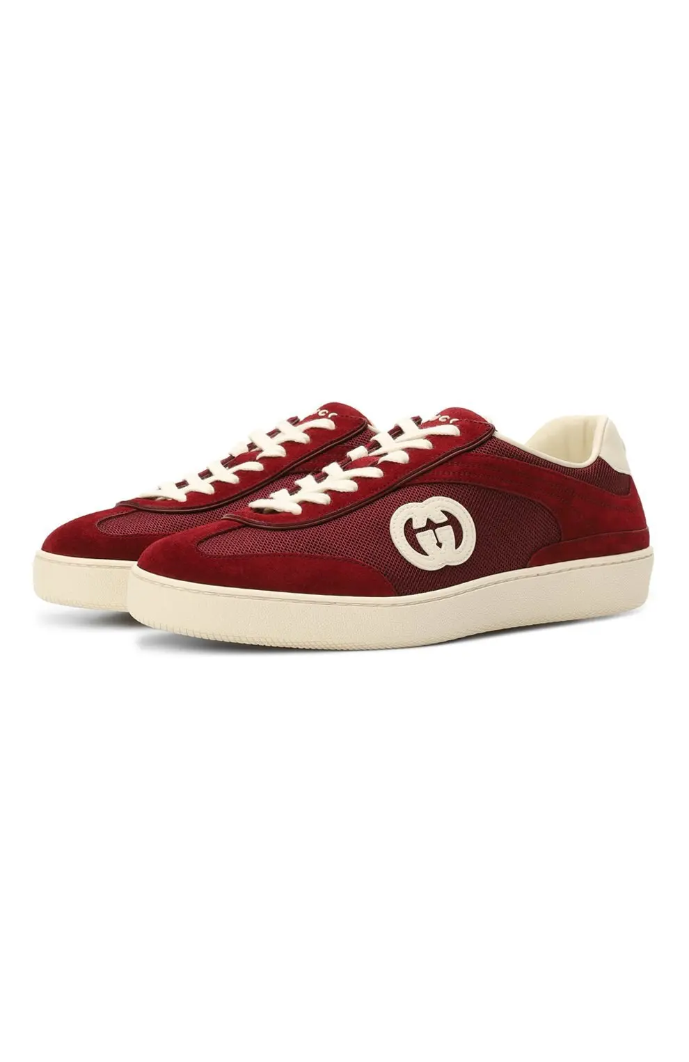 Кеды Gucci G75 в насыщенном бордовом цвете. Модель выполнена из замши и текстиля с контрастным белым логотипом GG сбоку и светлой резиновой подошвой. Стильное сочетание винтажного силуэта и современных акцентов.