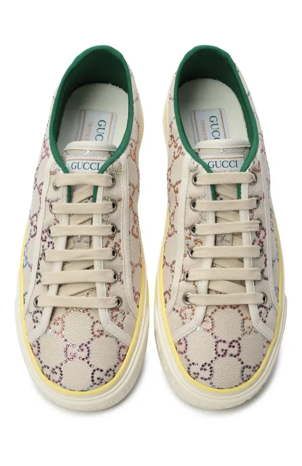 Кеды Gucci Tennis 1977 с радужным логотипом GG. Лёгкий текстильный верх в бежевом оттенке украшен разноцветным узором и дополнен резиновой подошвой с фирменным тиснением. Стильная ретро-модель с ярким акцентом.