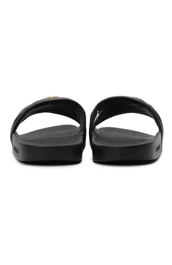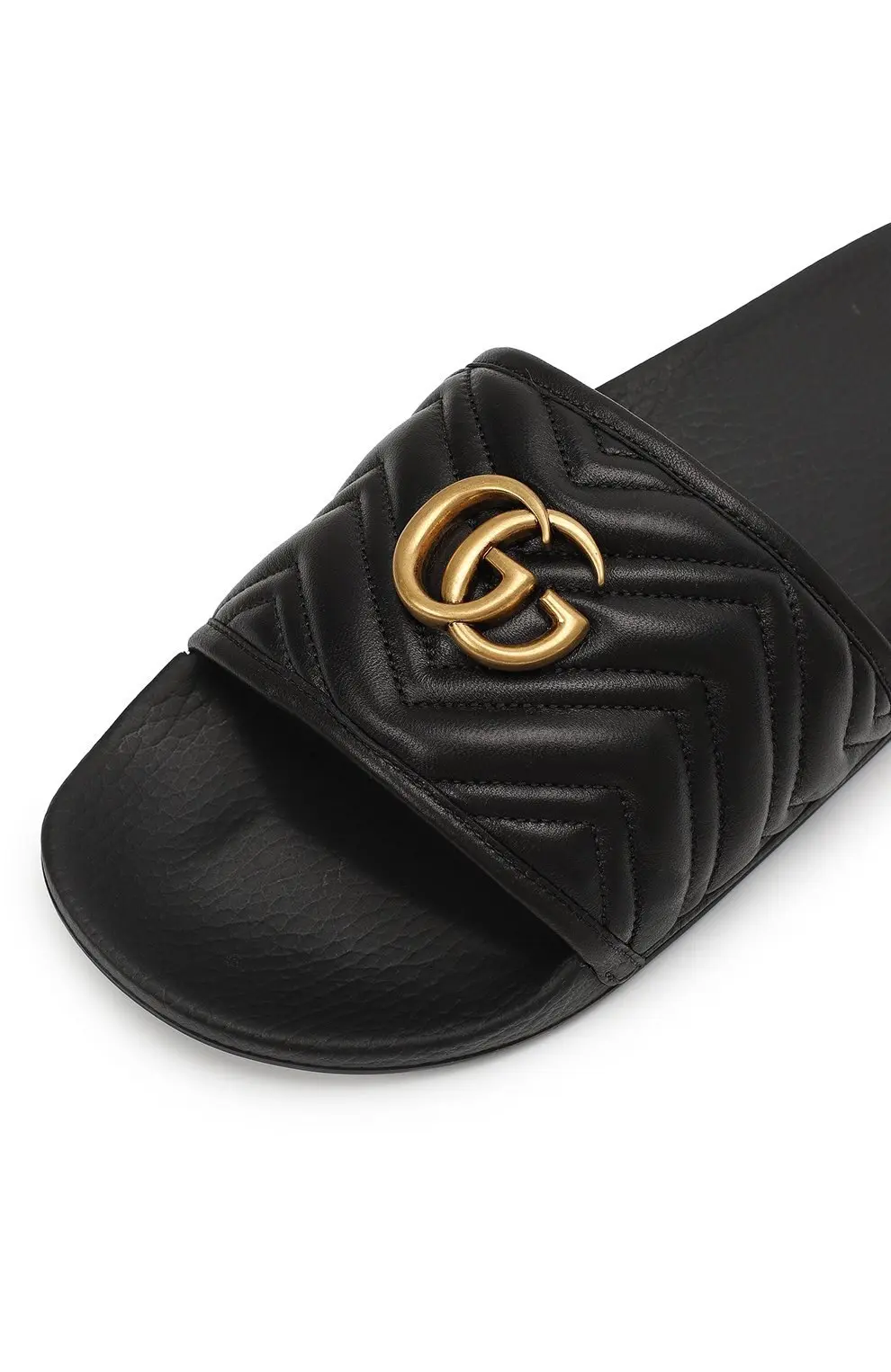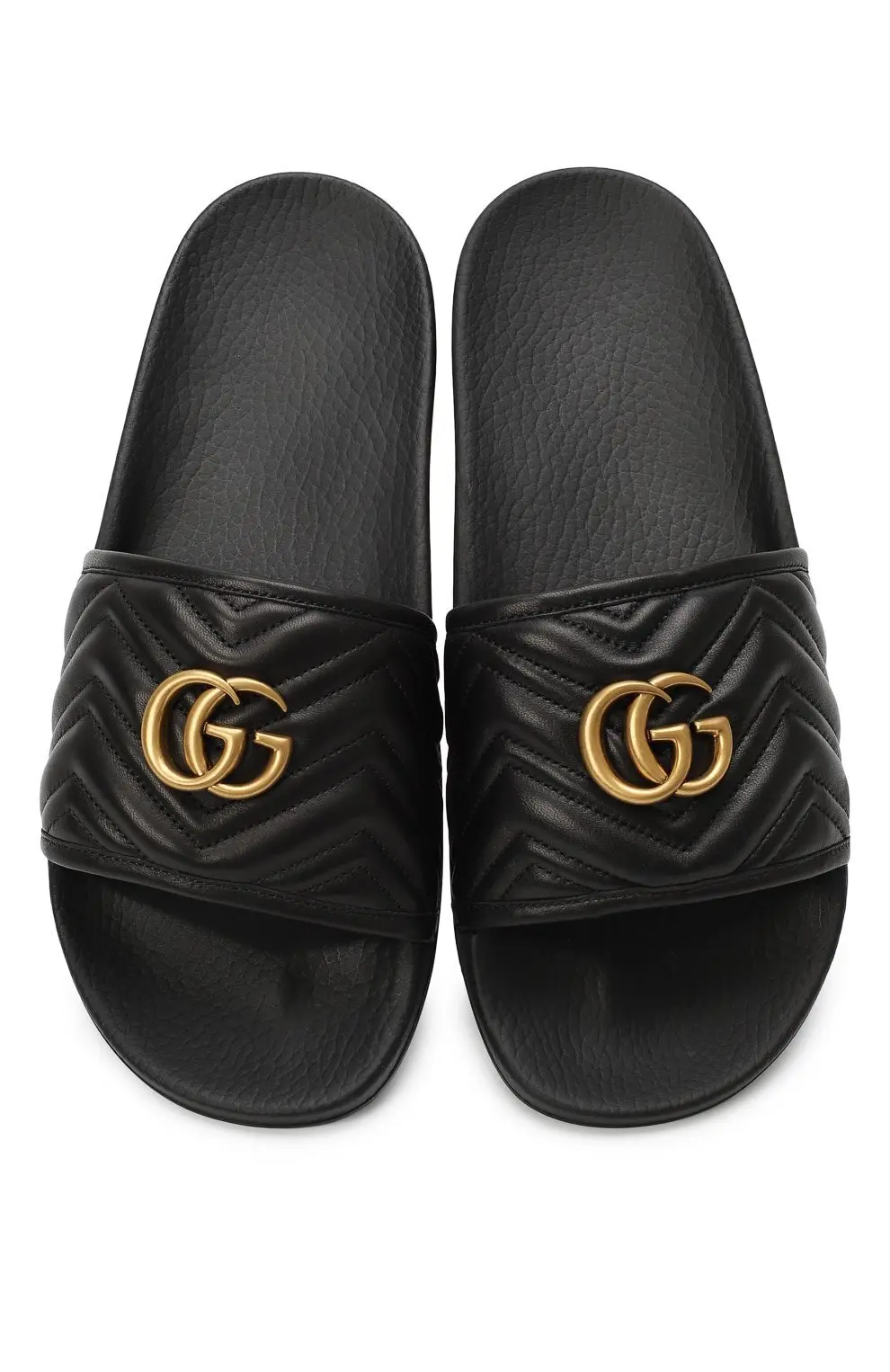 Шлёпанцы Marmont от Gucci выполнены из мягкой чёрной кожи с фирменной прострочкой в виде зигзагов. Верх украшен золотистым логотипом GG, придающим модели изысканность. Лаконичный силуэт и удобная форма делают их стильным и практичным выбором для повседневного образа.